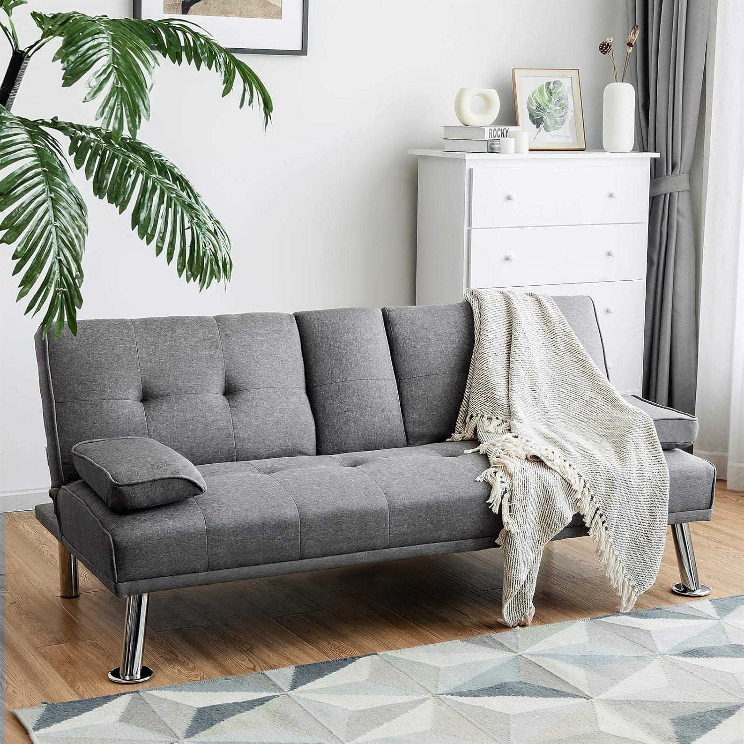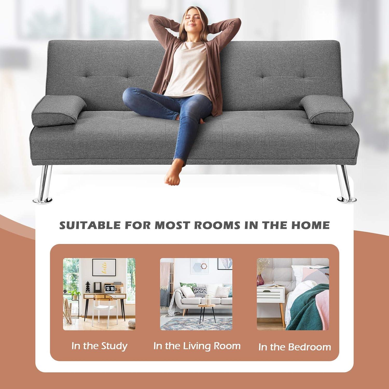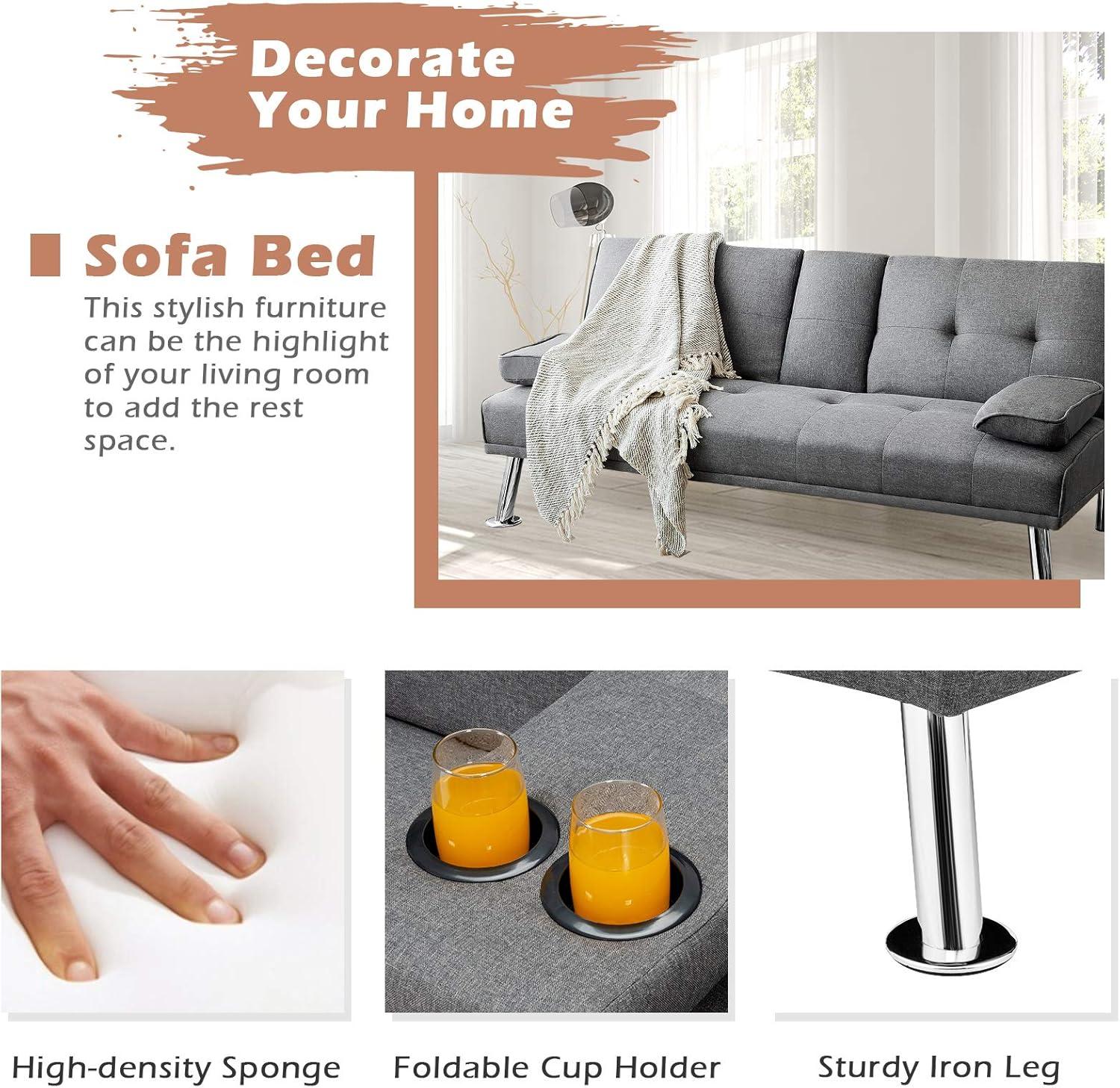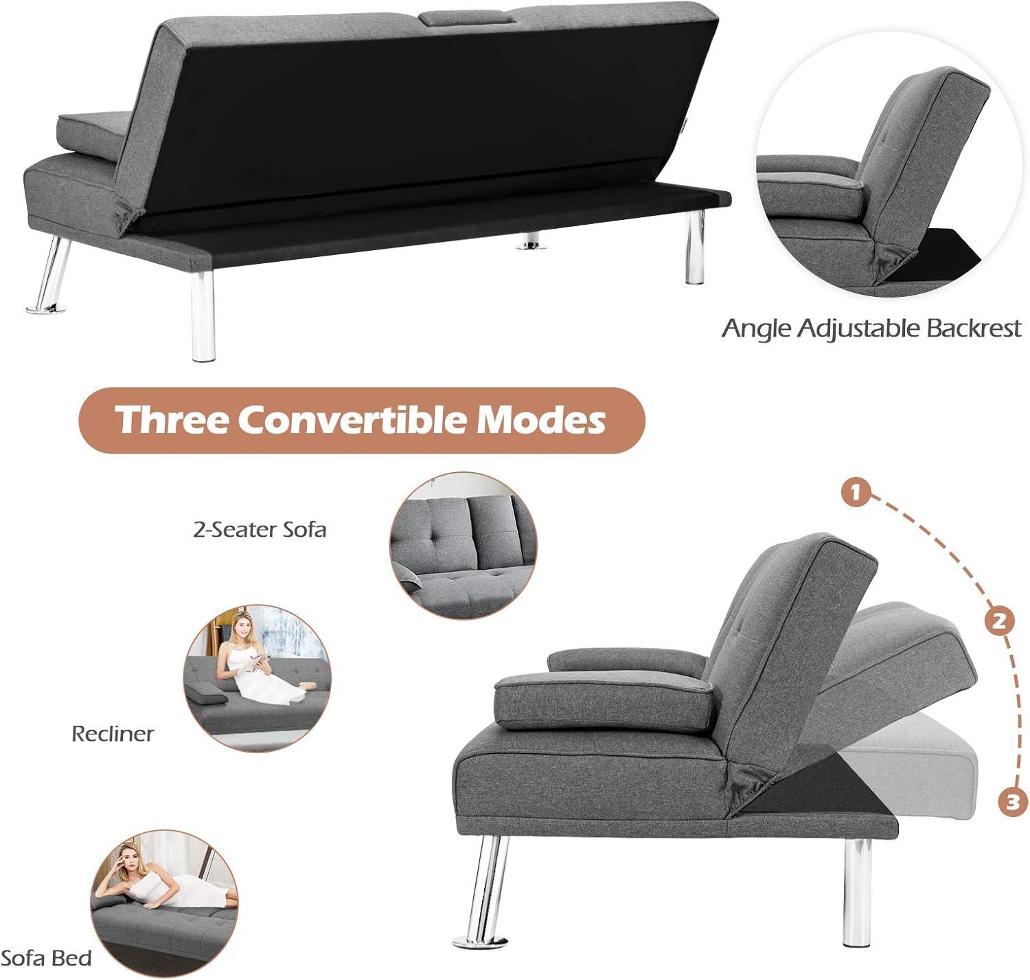Giantex Modern Convertible Futon Sofa Bed, Linen Upholstered Sofa Sleeper w/Metal Leg, Removable Armrests, 2 Cup Holders, Backrest Adjustable, Folding Sofa Bed for Apartment (Light Gray)
