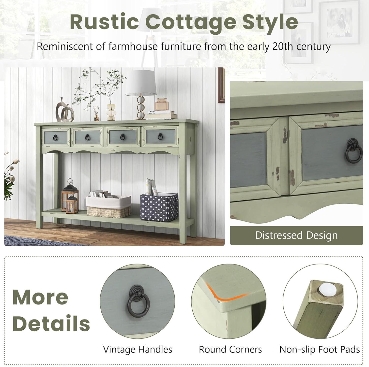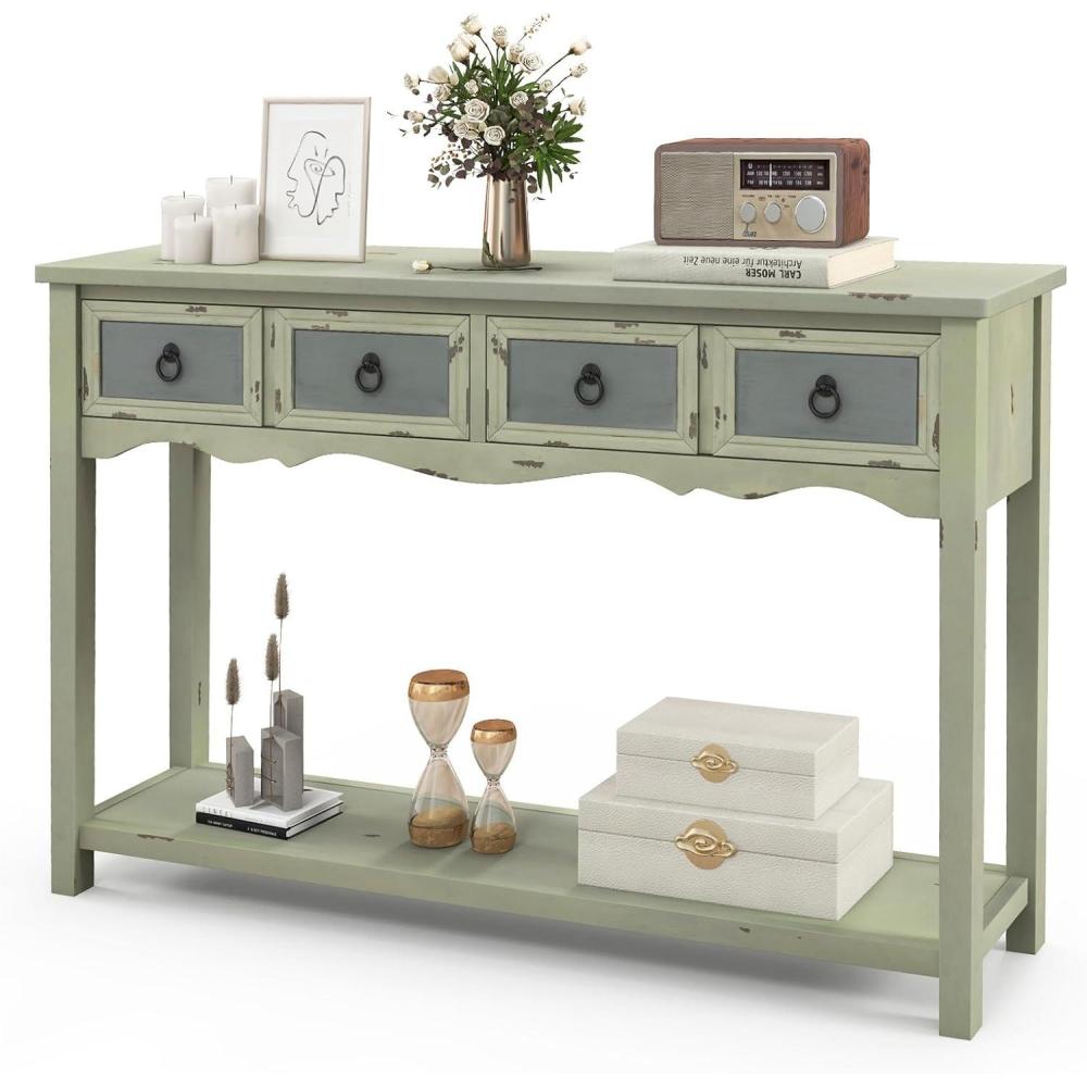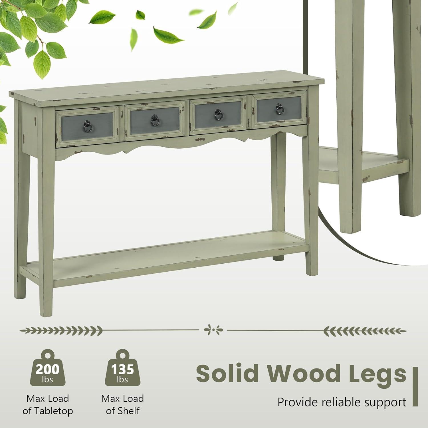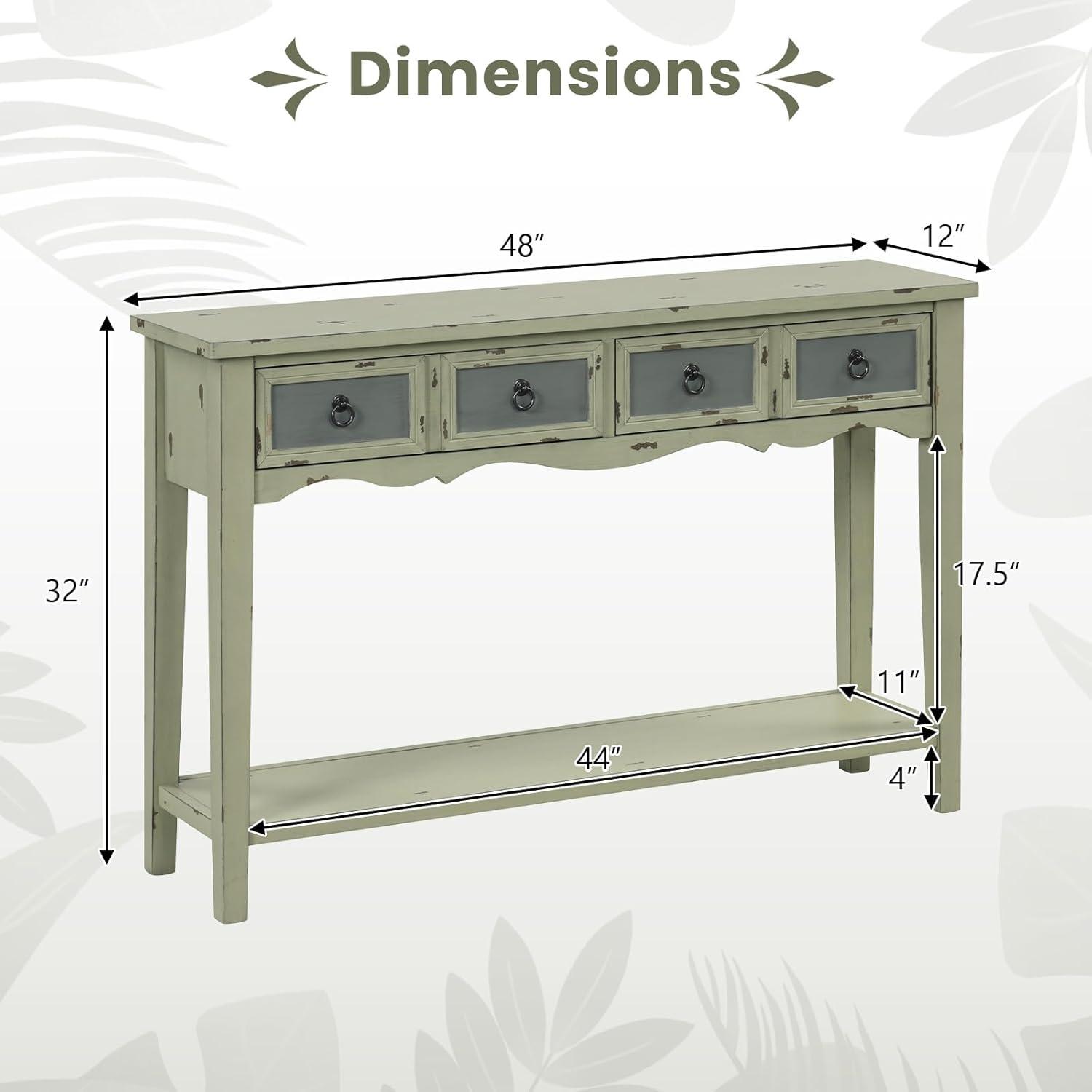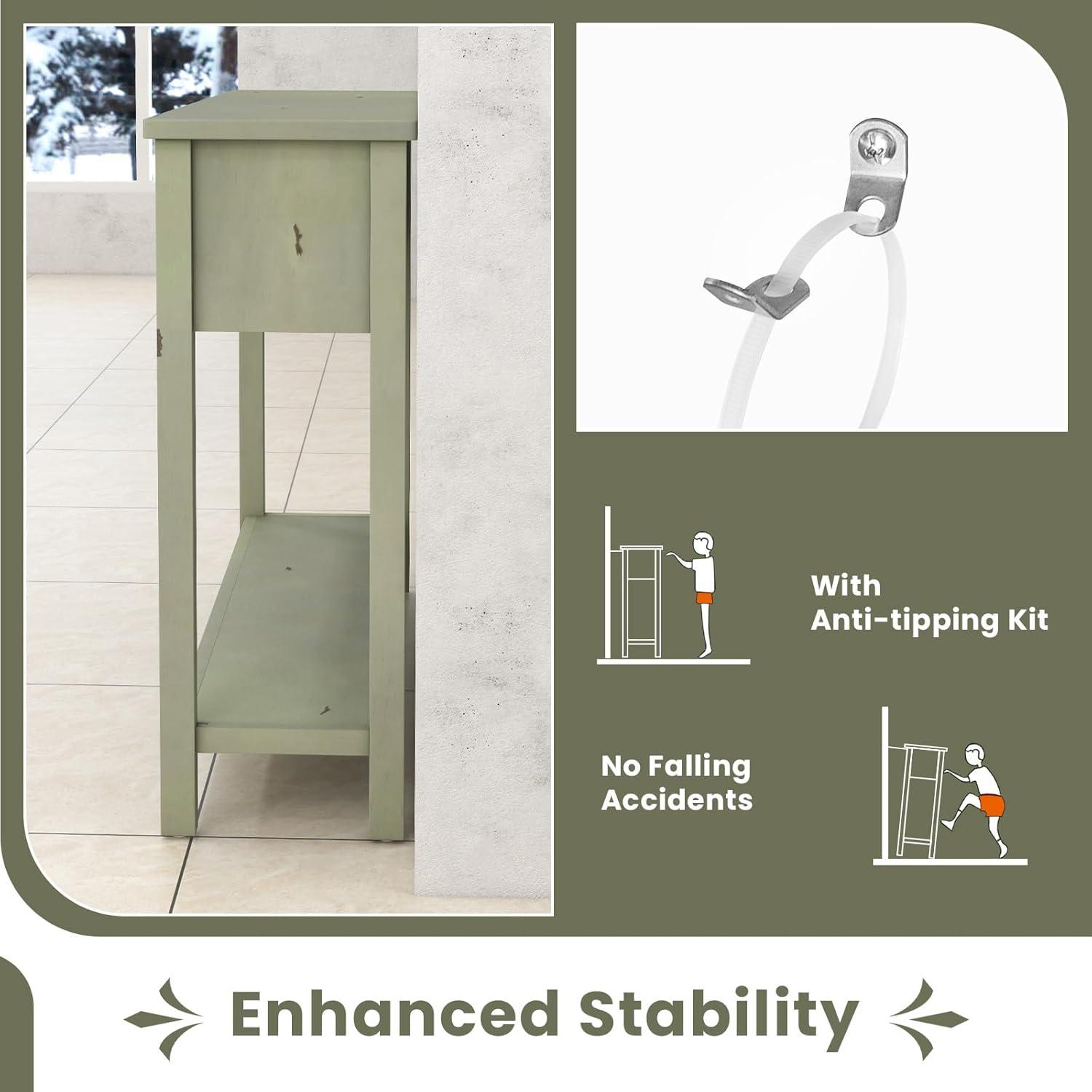 Step back in time with our exquisitely distressed vintage accent table. Embrace the charm of a bygone era as you invite the rustic cottage style of the early 20th-century farmhouse furniture into your living space. This stunning console table not only captivates with its timeless appearance, but it also offers practicality and functionality with its generous storage options. With a spacious tabletop, two storage drawers, and a wide bottom shelf, you’ll have plenty of room to neatly organize your belongings. Crafted with solid wood legs and a sturdy MDF frame, this entryway table is built to withstand the test of time. Its slim profile effortlessly fits into any space, making it a versatile addition to your home – ideal for small entryways, hallways, or even as a charming writing desk or vanity table. More details, like the anti-tipping kit and round corners, ensure your safety and a hassle-free setup.