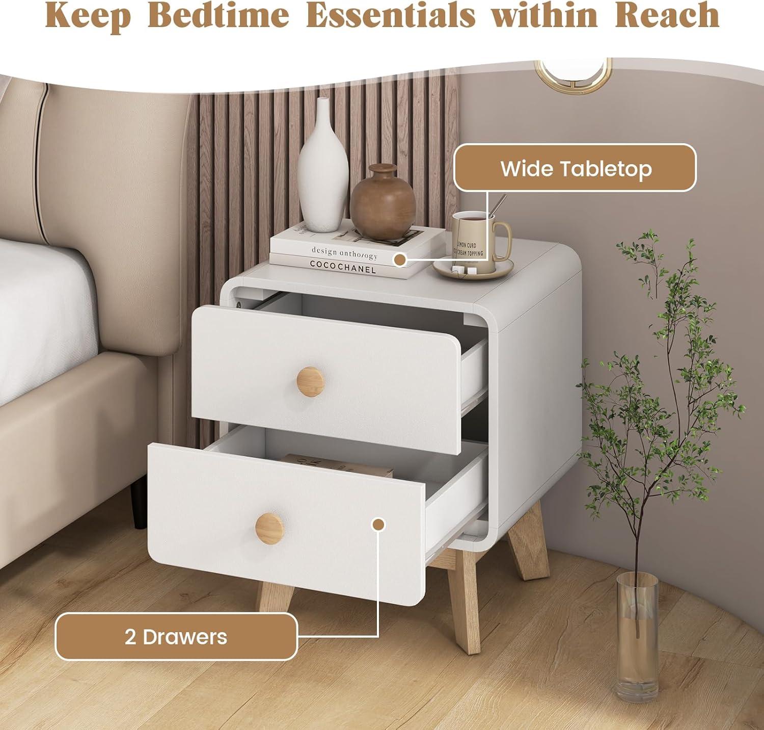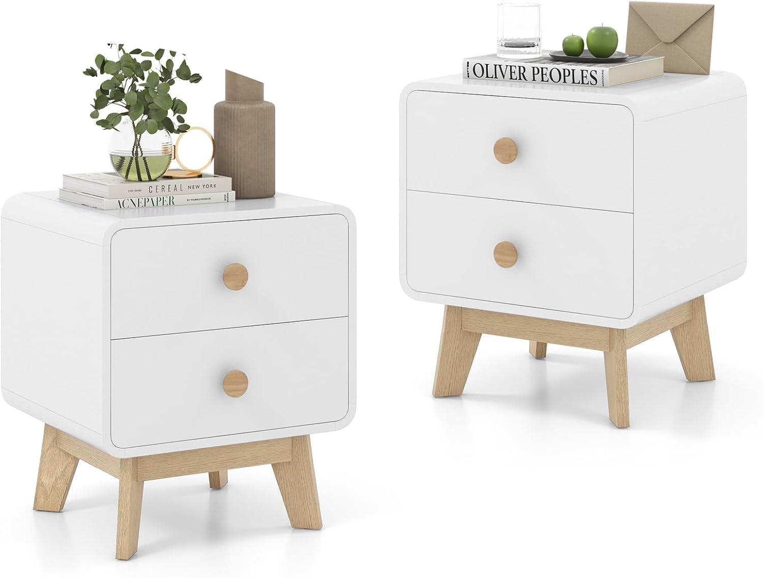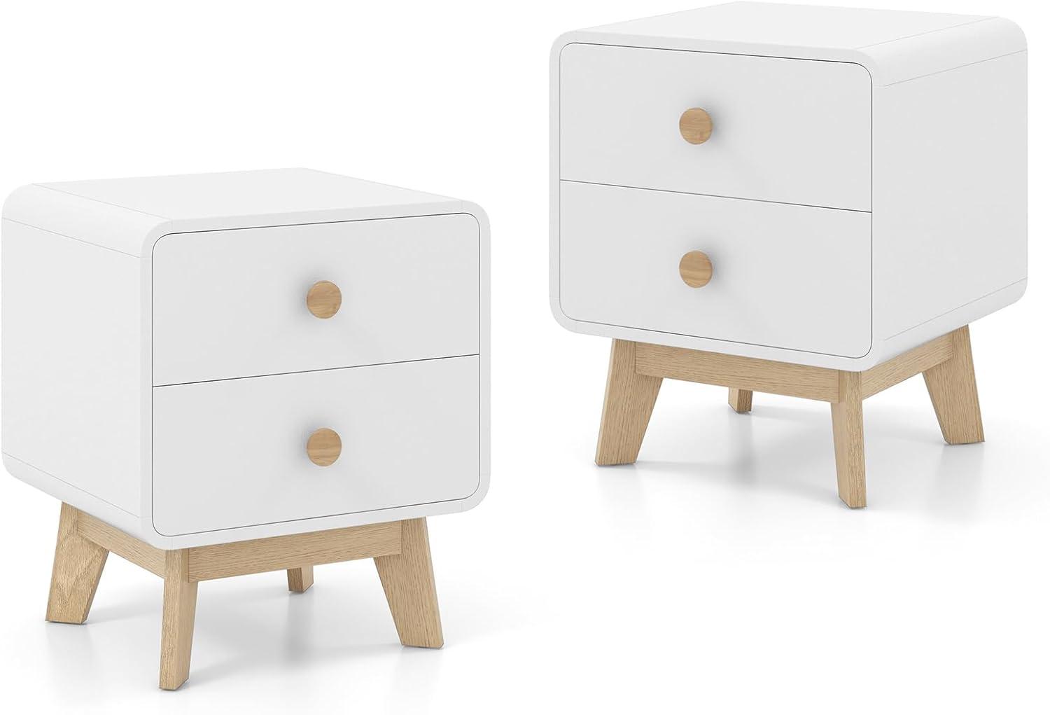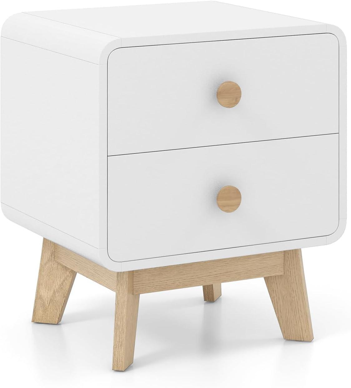 Giantex Night Stand with 2 Drawers, Mid Century Modern Bedside Table with Cute Round Knobs, Wooden Side End Table with Solid Rubber Wood Legs, Small Nightstand for Kids Bedroom Dorms, White(White)
