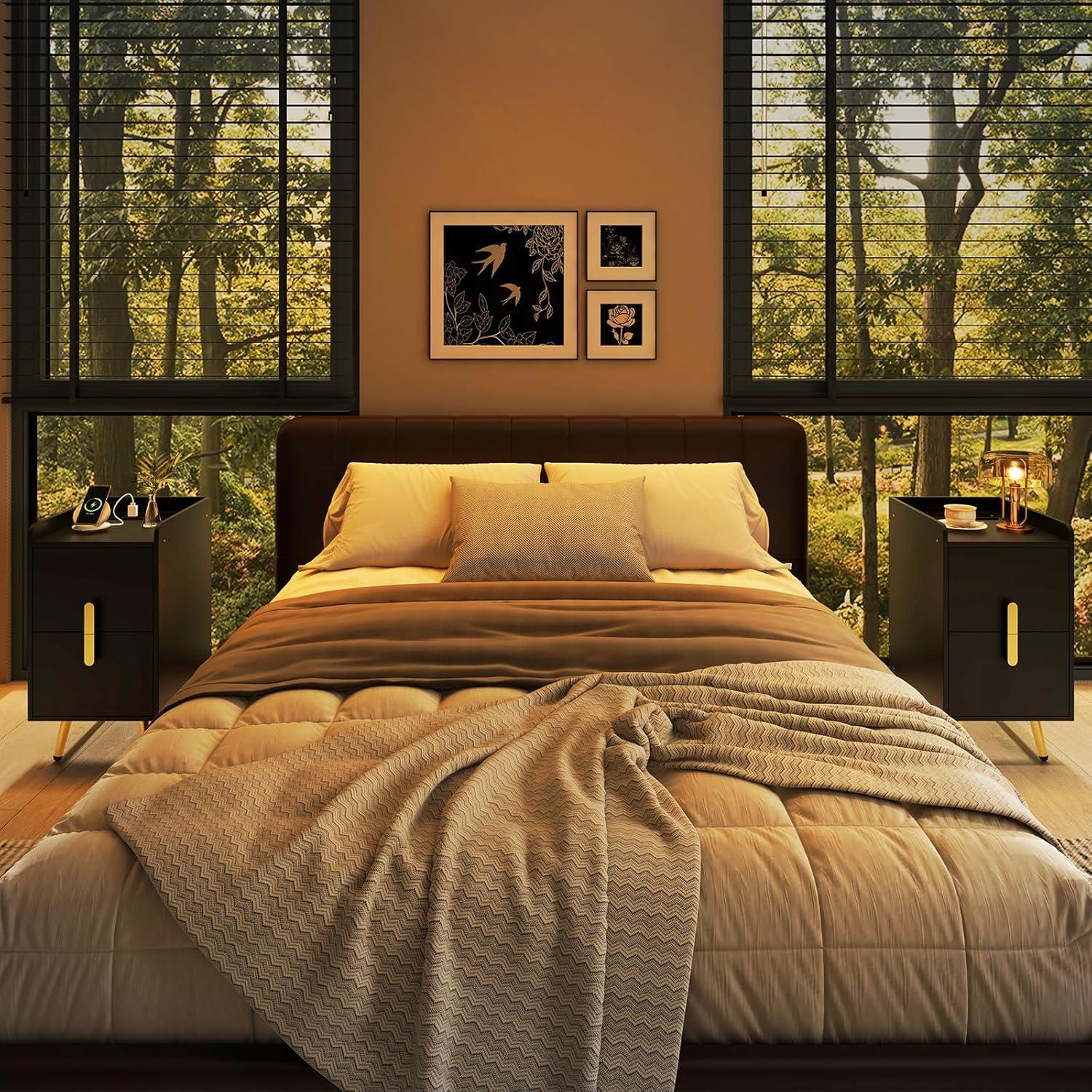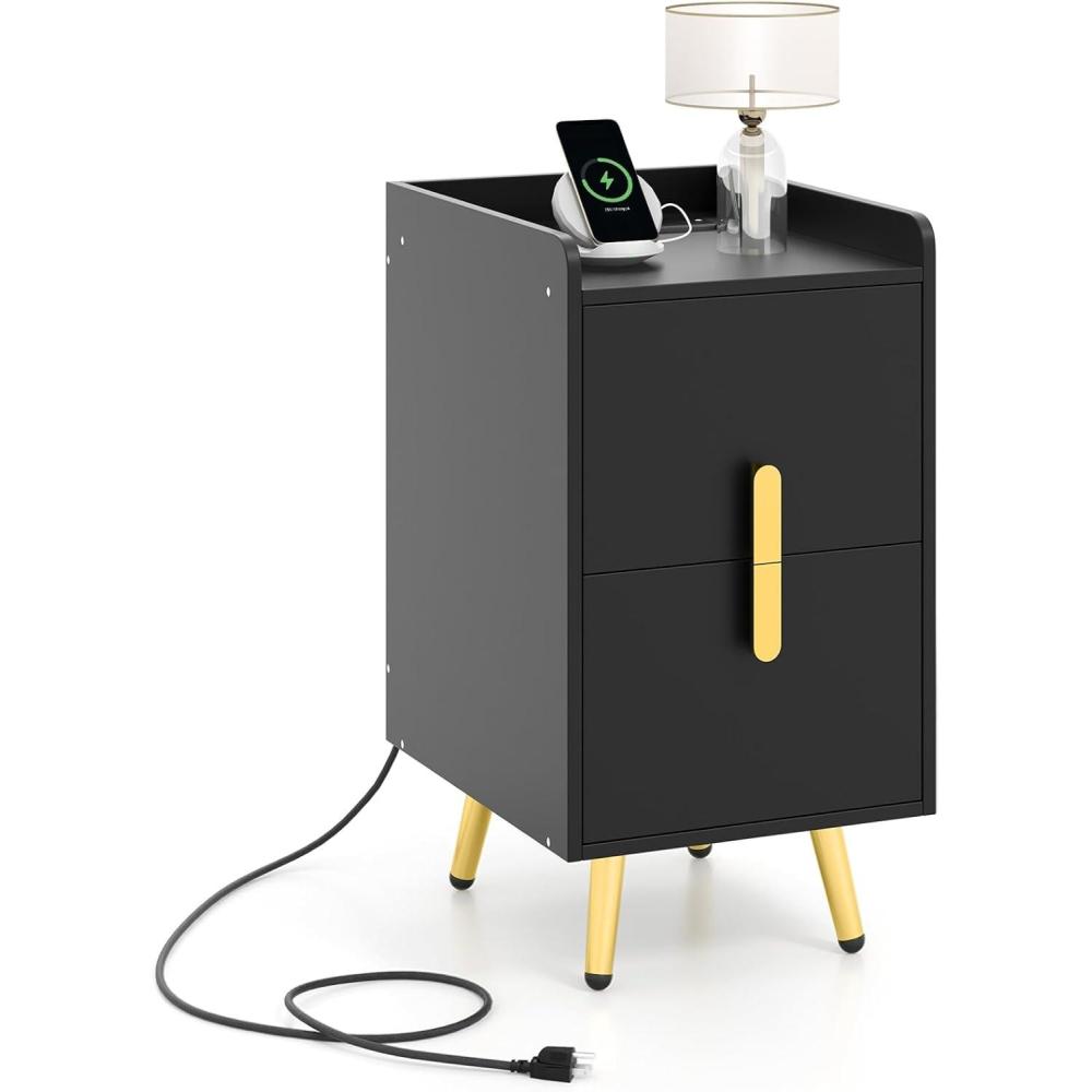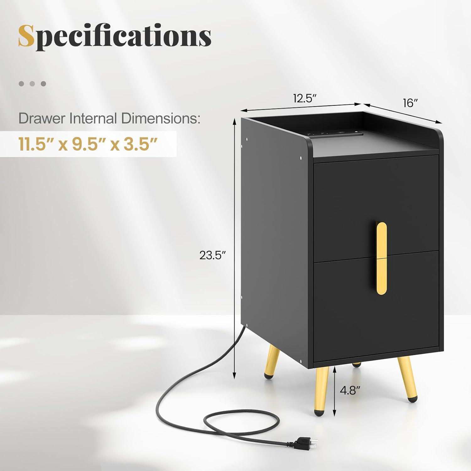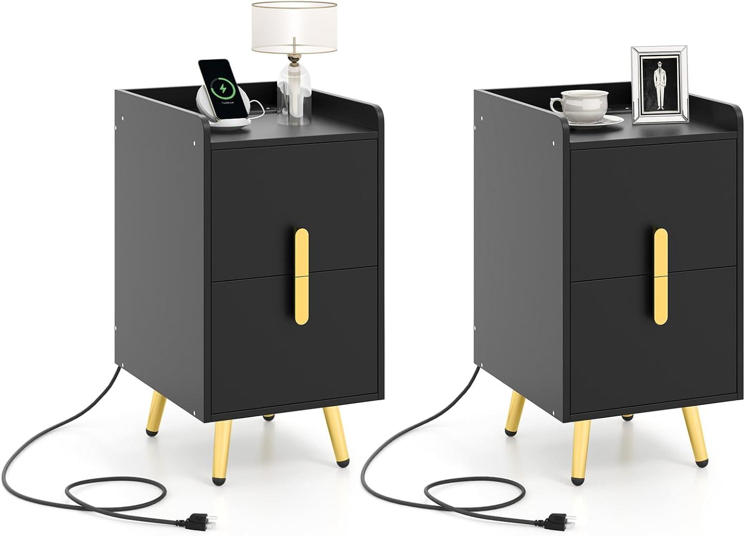Giantex Nightstand with Charging Station, Narrow End Table with 2 Drawers & Metal Gold Legs, Small Sofa Side Table w/ 2 USB Ports and 3 Outlets, Modern Night Stand for Small Spaces, Rustic Brown(Black)