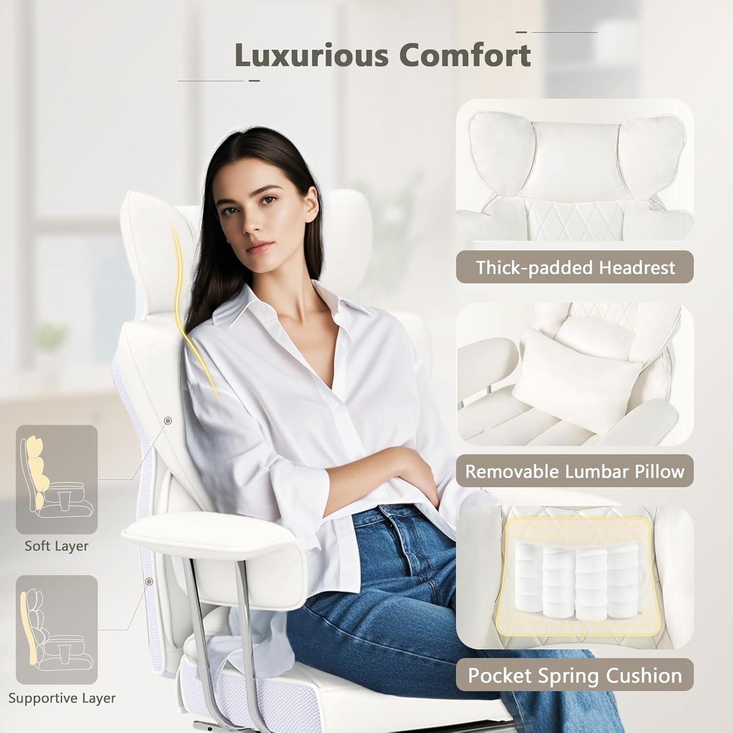 [Reclining High Back]: The reclining chair offers a range of flexible adjustments to suit individual preferences. Whether you need to focus on a task or unwind during a break, the high back office chair has got you covered. Its 90°-135° reclining backrest allows you to find the perfect angle for optimal comfort.