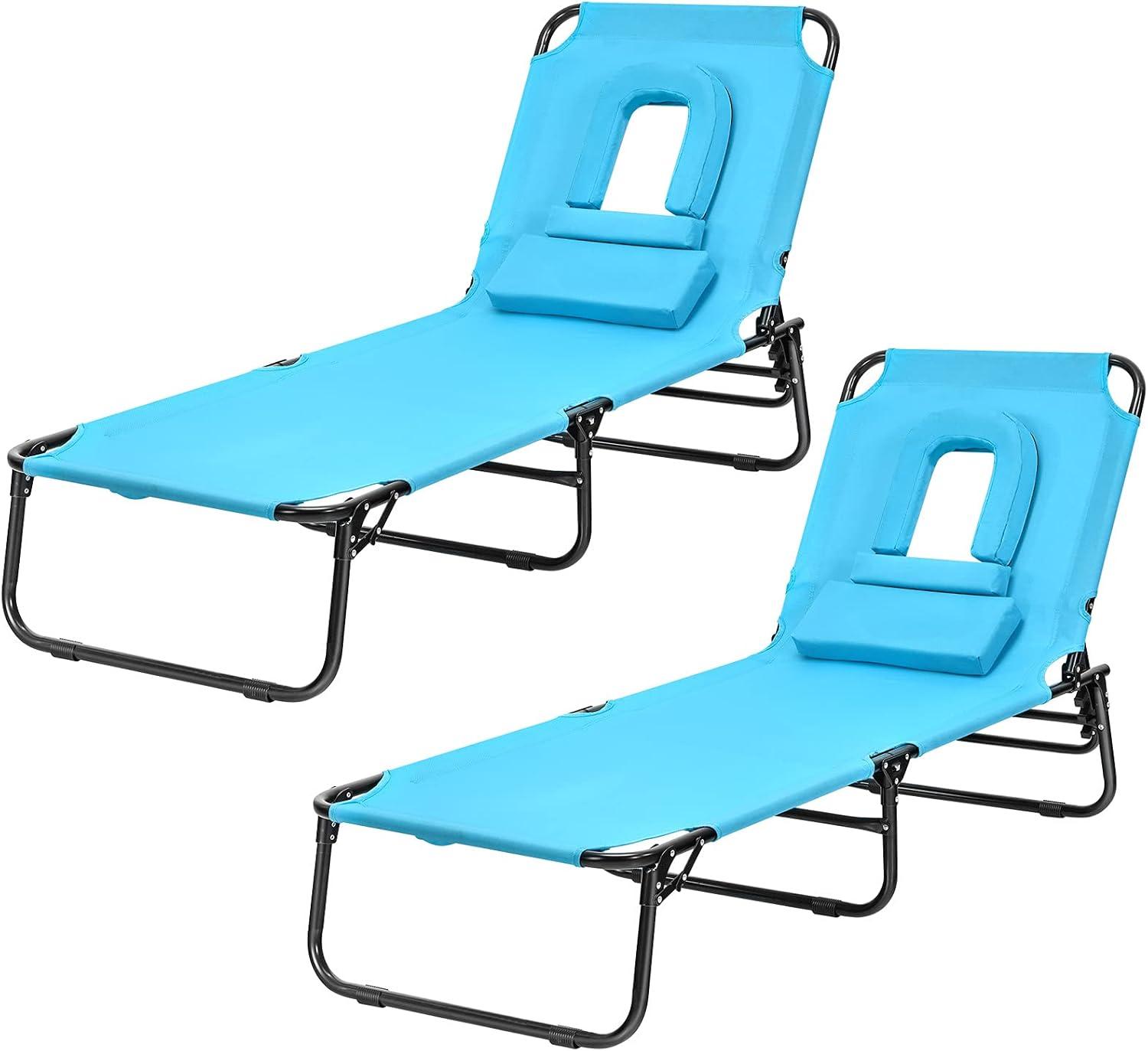 Giantex Outdoor Chaise Lounge Chair - Folding Beach Chair with 5 Adjustable Positions, Hole, Detachable Pillow, Hand Ropes, Lounger for Sunbathing, Poolside, Yard, Patio Lawn Chair(Turquoise)