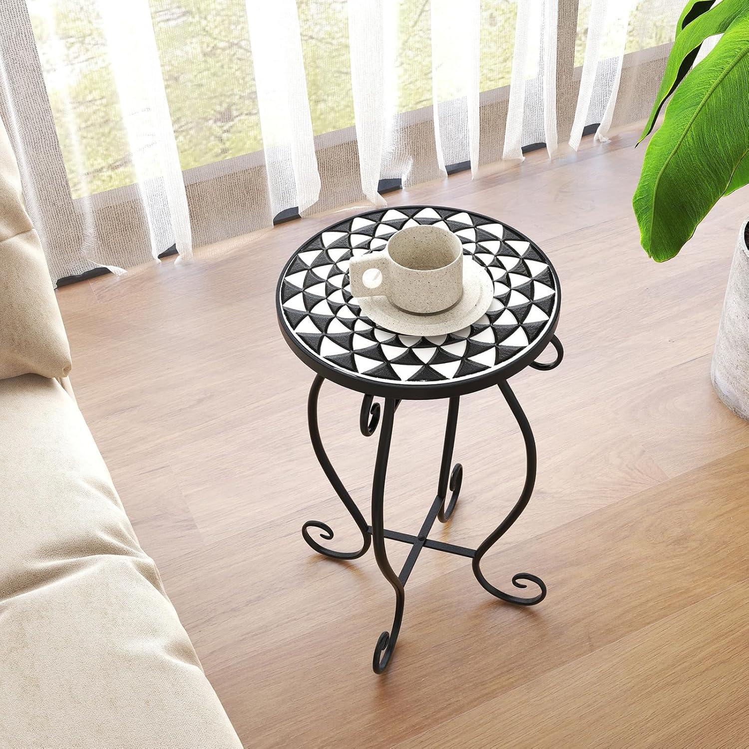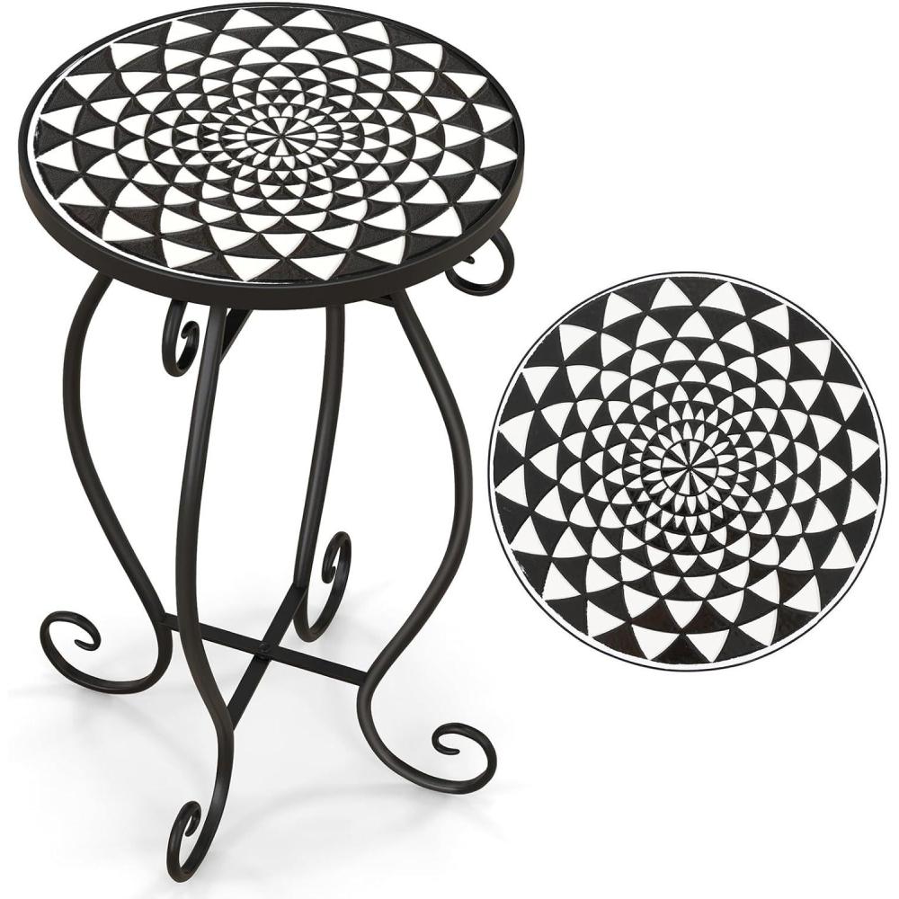 Giantex Outdoor Side Table, Mosaic Patio Table, 14inch Accent Table Plant Stand, Ceramic Tile Top Metal Frame, Small End Table Porch Beach Patio Garden Balcony Poolside(Monochrome)
