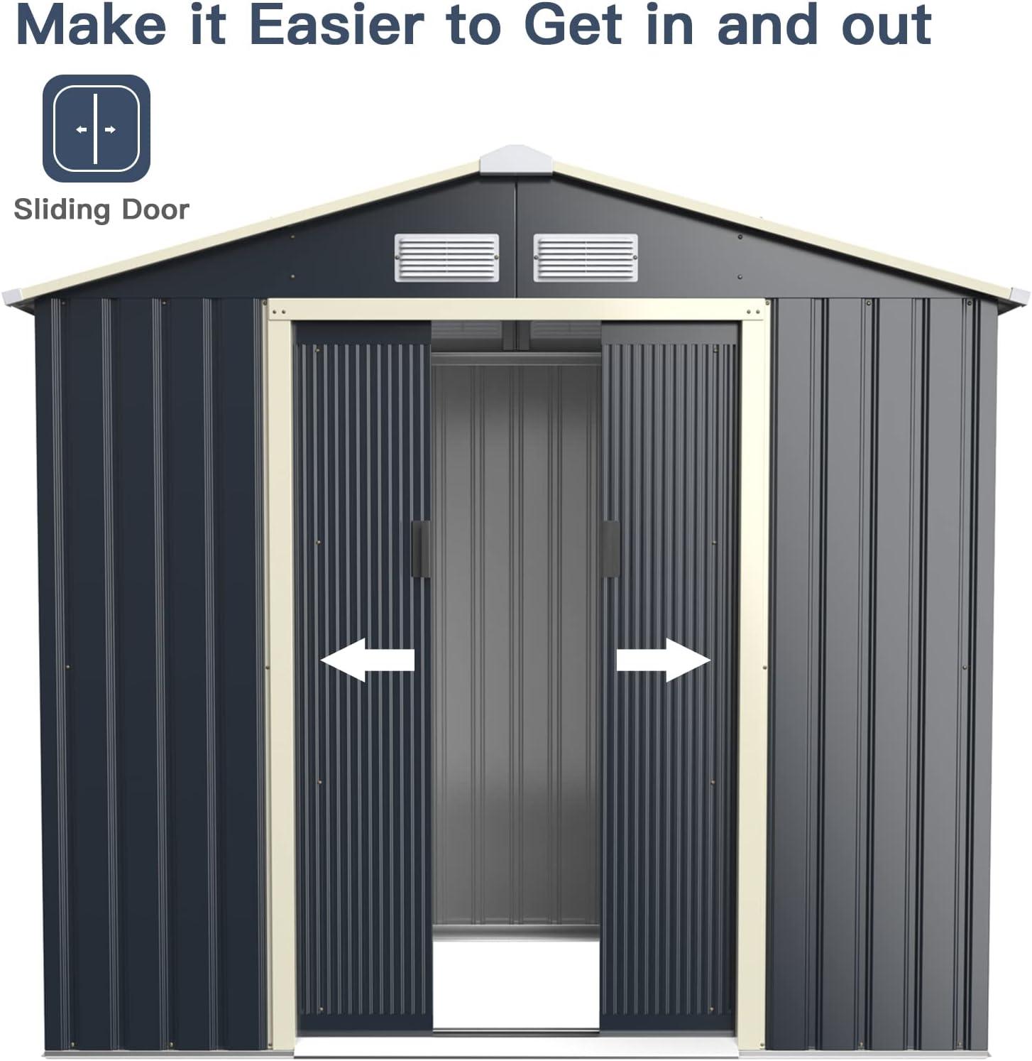 『Practical Double Sliding Door』: Considering comfortable using experience, the storage shed is equipped with a sliding door that brings much convenience to get in and out. In addition, the door measures 4.5ft in length and 5.3ft in height, providing enough space for an adult to enter through.