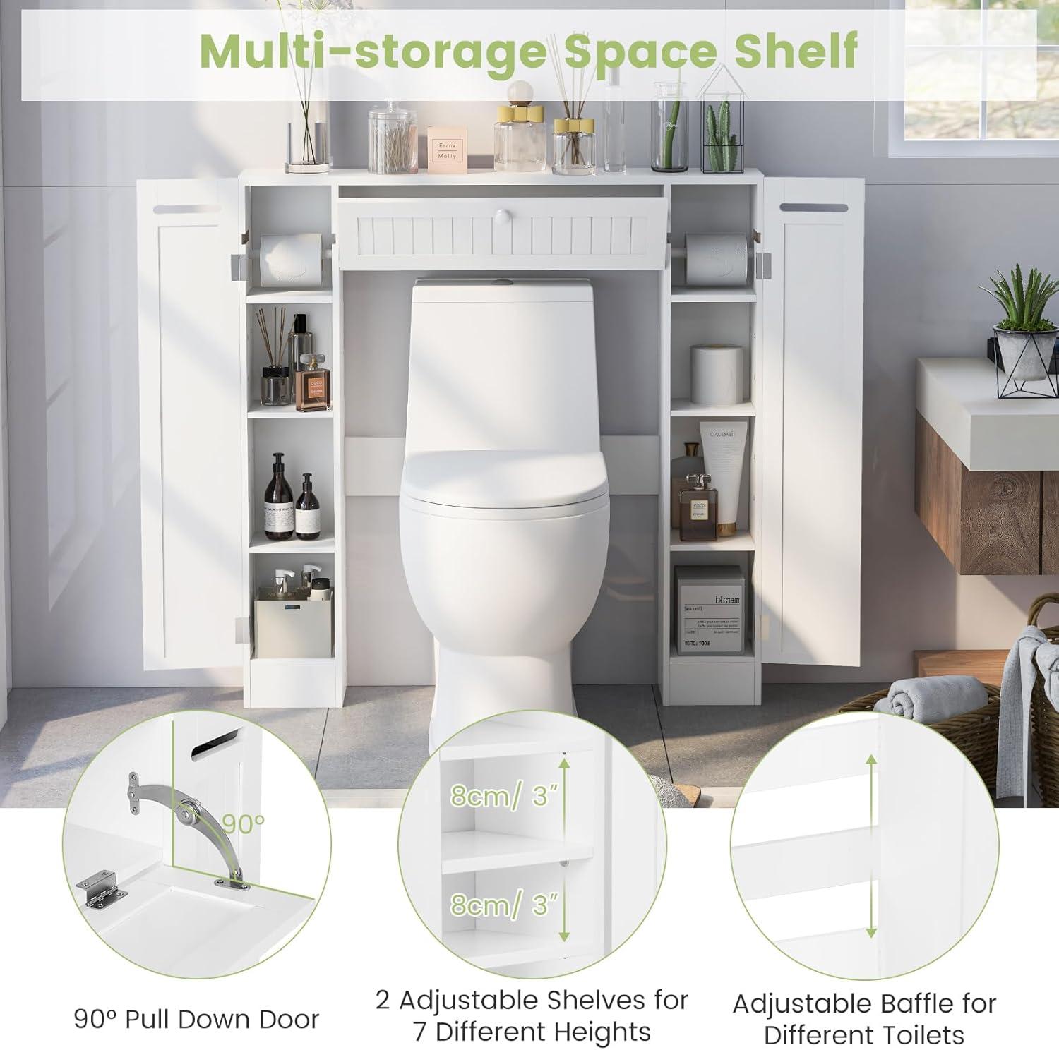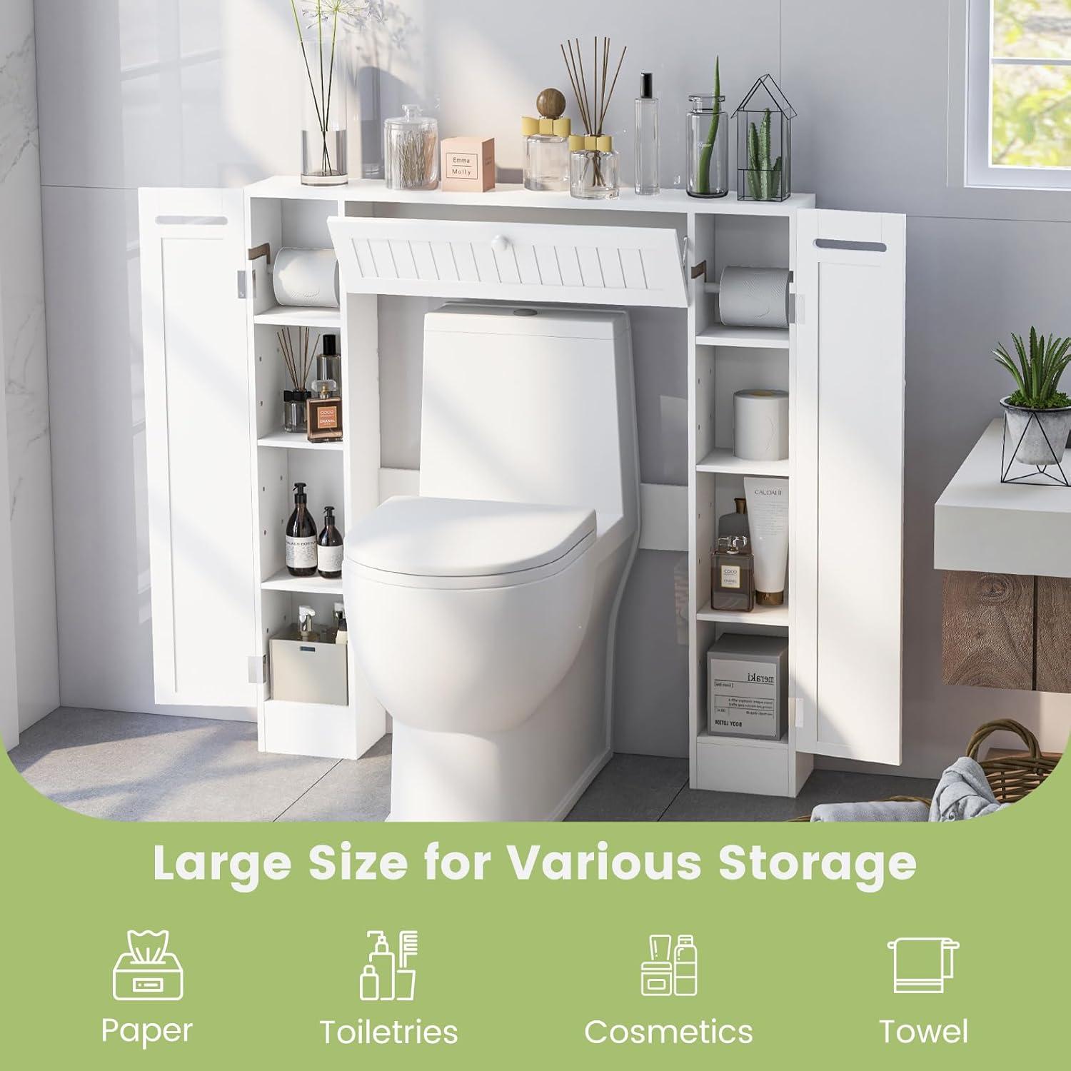 [Unique Low Storage Cabinet for Basic Needs]: Finished in a refreshing and bright white color, this bathroom storage over the toilet provides excellent storage solutions for bathrooms with limited space. It can fit your wall art and provide wide and clean top for you to place your decoration.