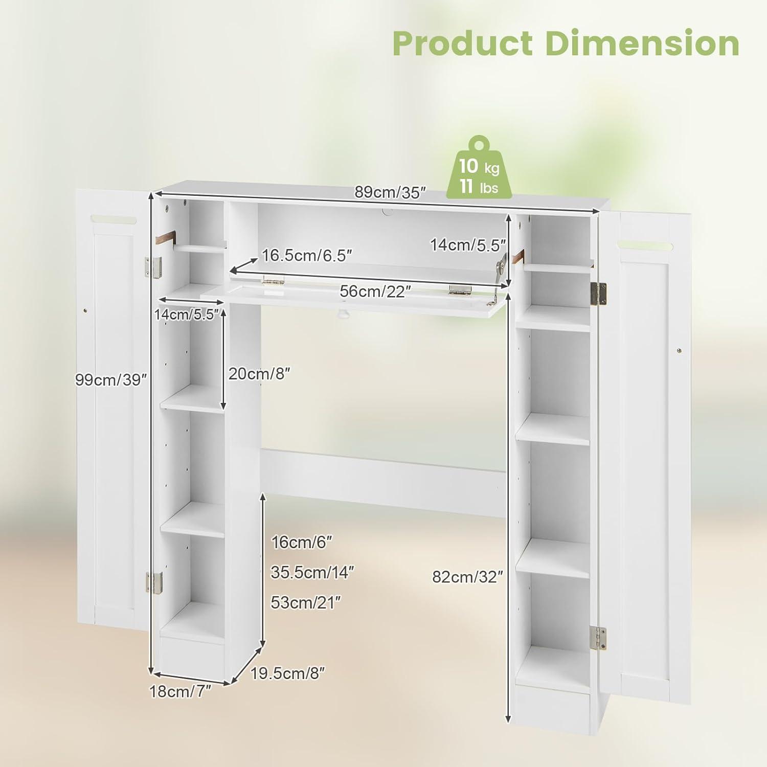 [Toilet Clearance & Other Product Details]: The toilet clearance is about 32″ height. Please measure the size of your toilet or washing machine to check if they can fit each other. And this over the toilet cabinet features a paper holder on each side for you to reserve toilet rolls. Weight capacity(each shelf): 11 lbs
