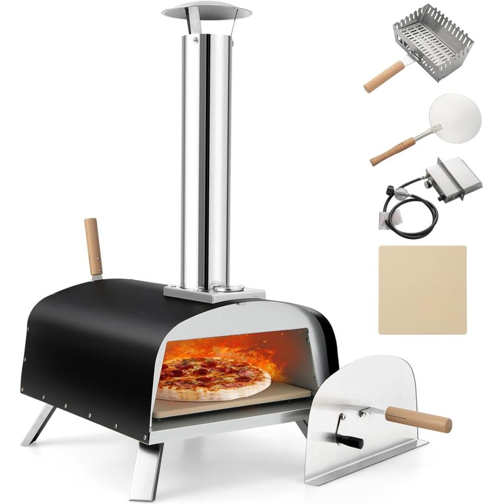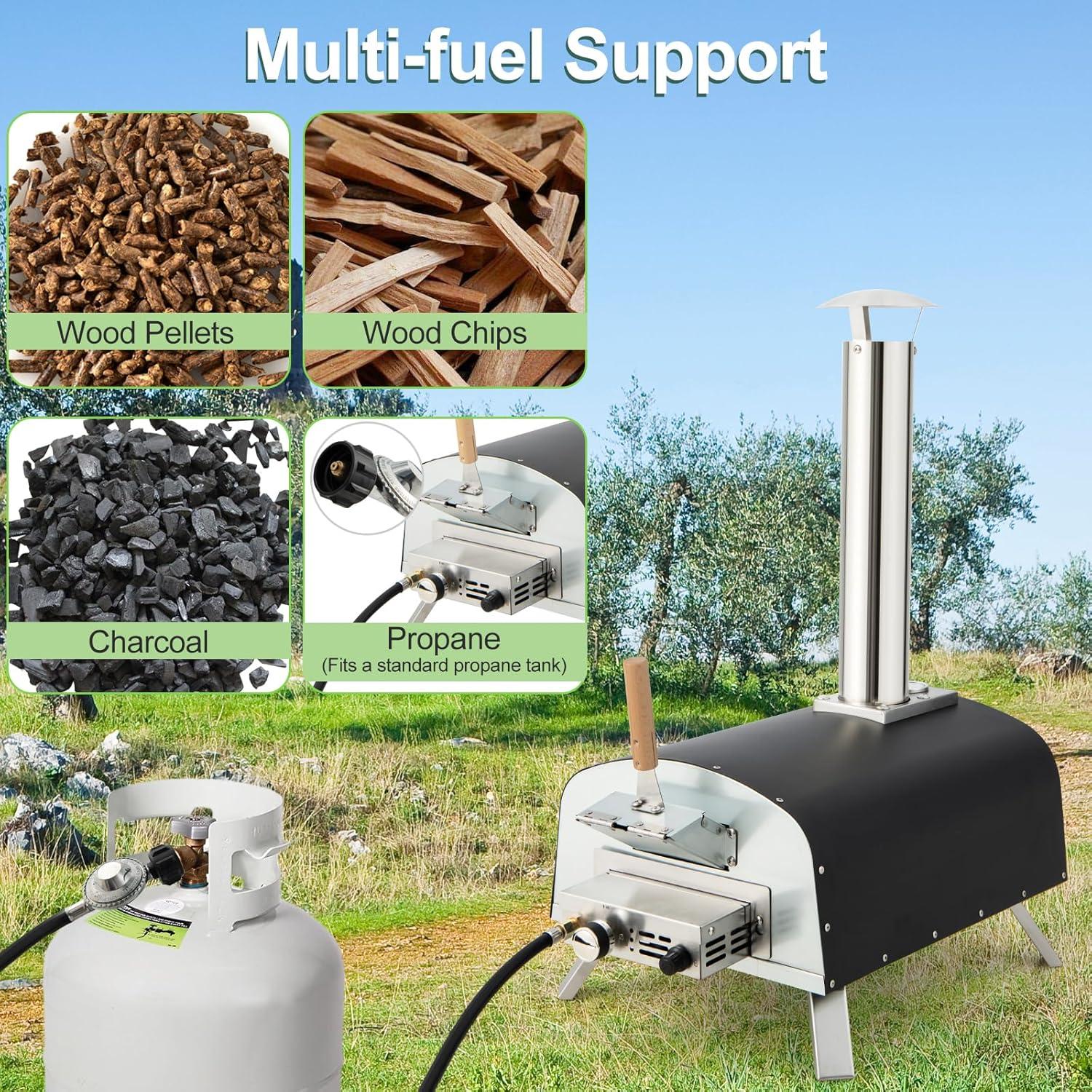 Our pizza oven allows you to explore endless cooking possibilities. This outdoor pizza oven is not limited to baking pizzas, but also a variety of meats, breads, vegetables and other foods. Thanks to 3-layer thermal insulation, our pizza oven effectively minimizes heat and fuel loss. You can add wood pellets or connect it to a propane tank, and with 5-15 mins rapid preheating and heating up to 800°F, a delicious pizza will appear in front of you within 90 seconds. The built-in thermometer and check hole enable you to cook a pizza with confidence, ensuring that it is at the optimal cooking temperature and baked evenly. Moreover, foldable legs make it easy to store and carry. This pizza oven will be the shining star of your next family gathering, outdoor BBQ or RV trip!