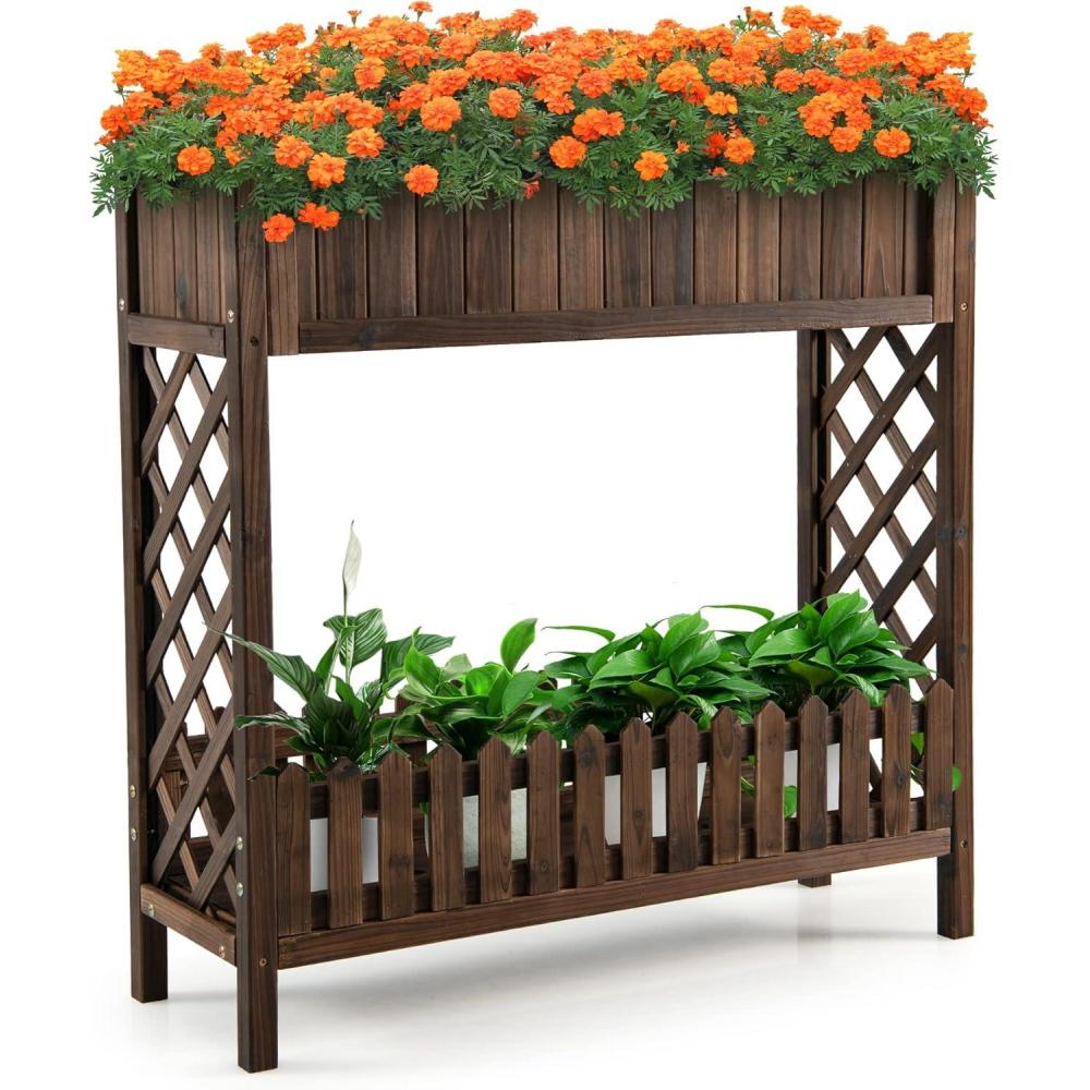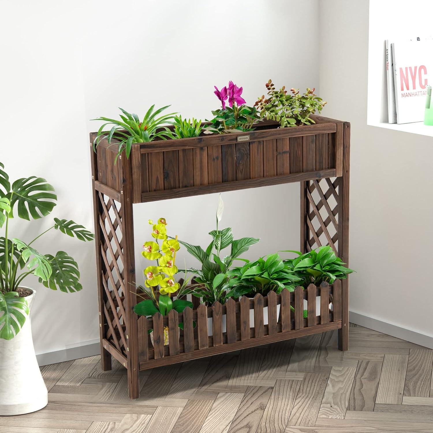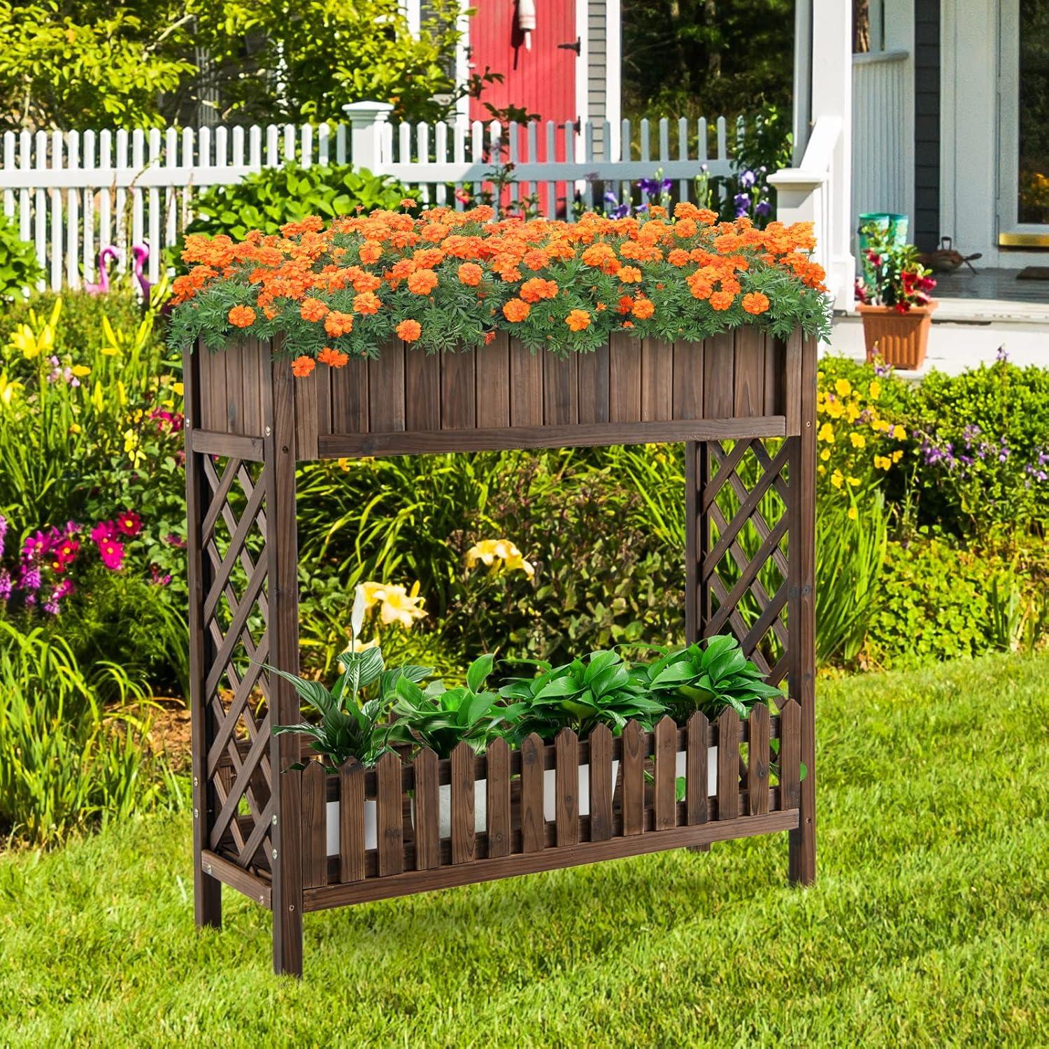 『2-Tier Shelf Design』: The wooden raised garden bed measures 37.5”x 12.5”x 35.5” (L x W x H) and features 2 tiers (depth: 8”, 9”) to hold your plants, garden tools, pots, fertilizers, and soil bags as well as keeping your garden nice and tidy. Besides, there exist all-round fences to prevent pots from falling and ensure sufficient sunlight.