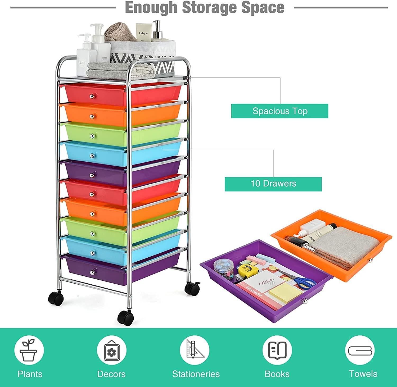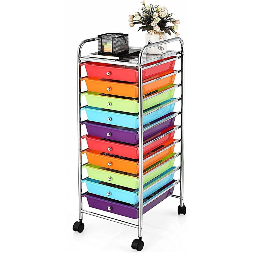 Our rolling storage cart includes 10 drawers, which provide enough storage space. It is Ideal to arrange your different stuff at Office, Home, School and Garage Or Just About Anywhere Organization Is Needed. Made of Chrome Steel Framed and plastic Drawer Organizer, this 10-drawer rolling cart is durable enough to serve you for a long time. Four universal wheels will help you move it easily. Do not hesitate, to buy one!