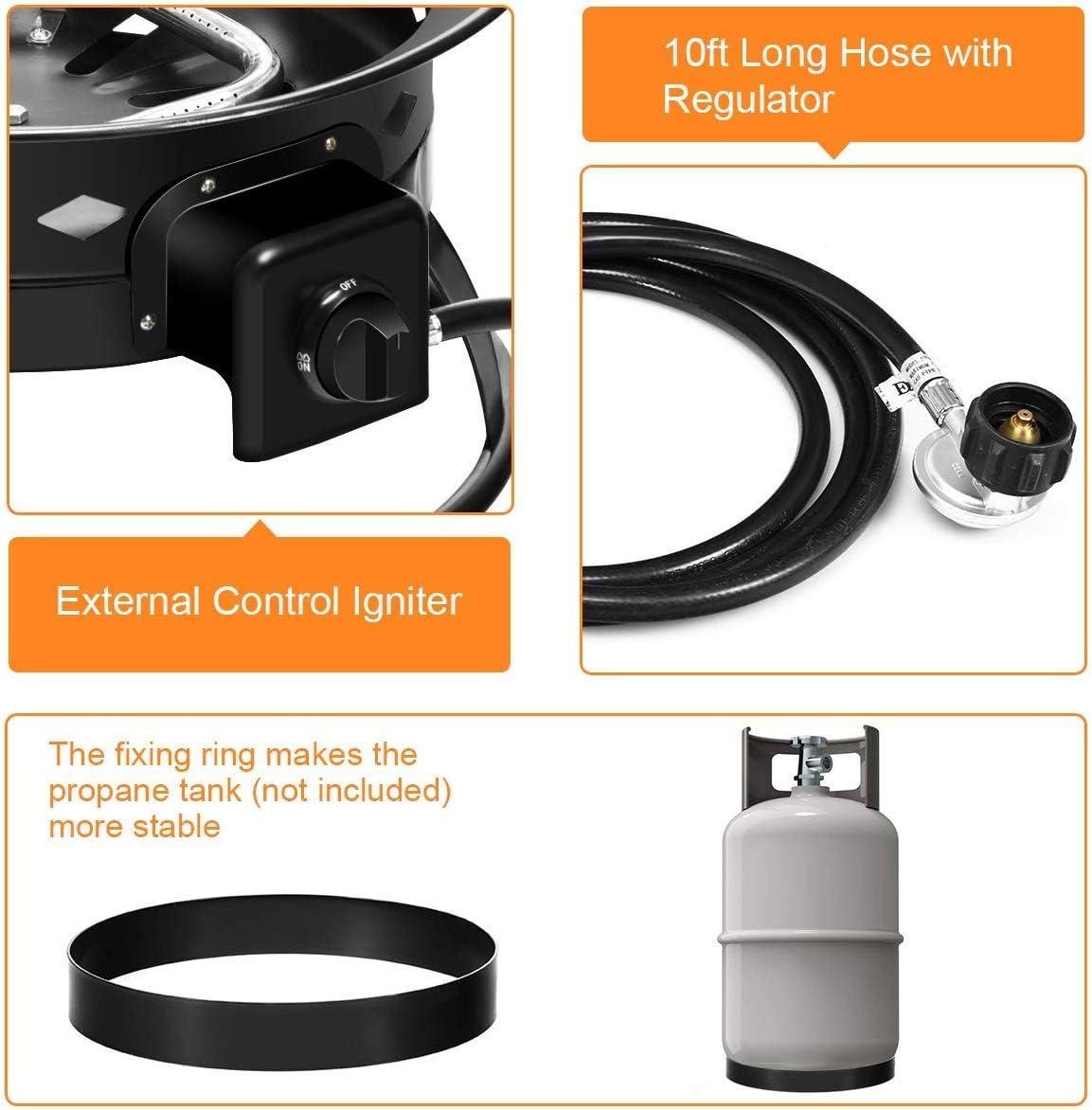 [Complete Fire Pit Kit]: Our gas fire pit includes a lid with straps for easy transportation and storage, while the 10FT long hose with regulator can extend the distance of your standard propane tank (not included). Comes with tank stabilizer ring and durable lava rock stones, this fire pit will help enjoy a warm and safe outdoor experience.