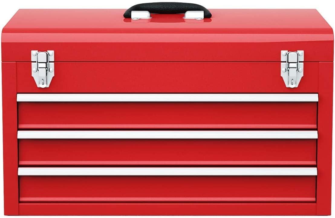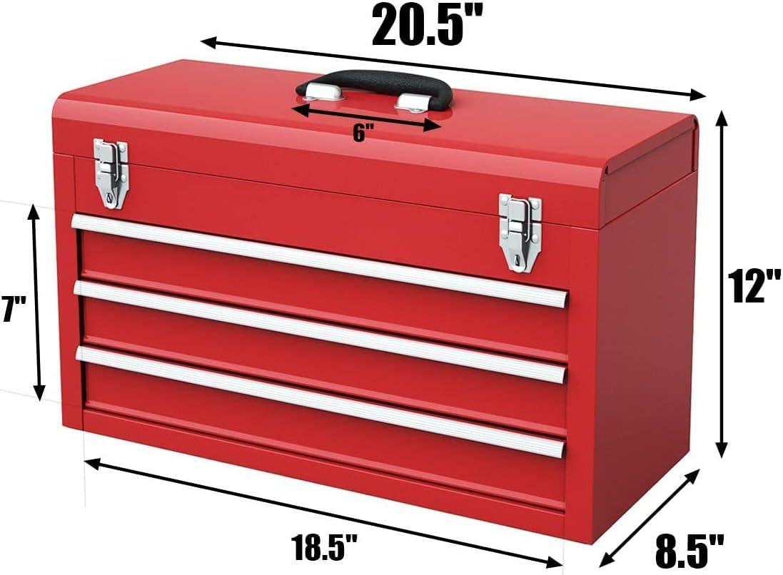 Description: This portable 3-drawer steel toolbox will be a great assistant for your daily life! Made of sturdy steel frame with premium powder coating, this tool box ensures excellent stability, wear resistance and rust resistancefor years of use.The top tray and 3 drawers provide a large storage space for your tools. The double-latch design makes it safer to use while the EVA foam liners help to protect the box surface from scratches .Besides, equipped with ball bearing slides, the drawers can be pulled out and pushed in easily and quietly. Our stylish and practical tool box is ideal for household use, DIY work, art andcraft storage.With the portable handle, you can carry it anywhere with ease. Features: Heavy dutysteel construction and rustprooffinish support long-lasting use 3 drawers and top tray offer good organizationfor your tools Equipped with2steel latches to lock the box for added security Easy-to-grip and anti-sliphandle for convenient carrying Ball bearing slidesmake it easy topull out and push inthe drawers Soft and non-slip EVA liners protect the surface from scratching Perfect tool box for home, office or automotive repairs maintenance Specifications: Color: Red Materials: Steel Overall Dimension: 20.5″ x 8.5″ x 12″ (L x W x H) Number of Drawers: 3 (with top layer) LoadCapacity of Each Drawer: 22 lbs Net Weight: 18 lbs Package Includes: 1x Toolbox