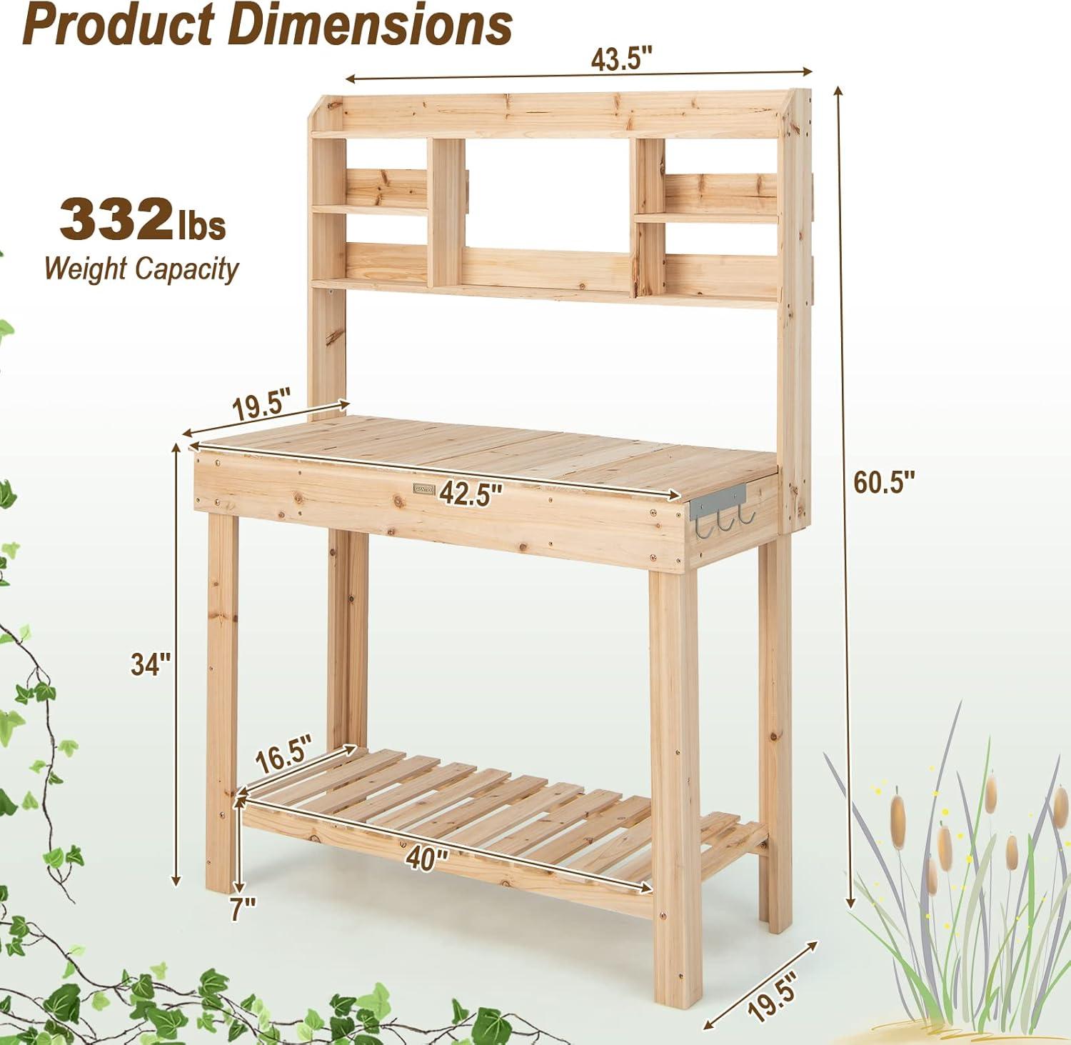 Our wooden potting bench table measures 43.5” x 19.5” x 60.5” (L x W x H), crafted from sturdy pine wood and finished with a protective coating for reliable performance, indoors or out. The sturdy structure supports all your planting projects, while 3 tiers of shelving and a large-bottom storage area keep tools and materials organized and within reach. A convenient flip-top design reveals a discreet storage compartment, helping you declutter and maintain a tidy workspace; when closed, the tabletop becomes a smooth, practical surface for all your gardening needs. Designed at an ergonomic height, the waist-high prevents painful kneeling or bending when taking care of plants. Perfect for gardens, patios, greenhouses, or balconies, this potting bench easily doubles as an outdoor bar, display area, or general storage table, fitting beautifully into any indoor or outdoor space.