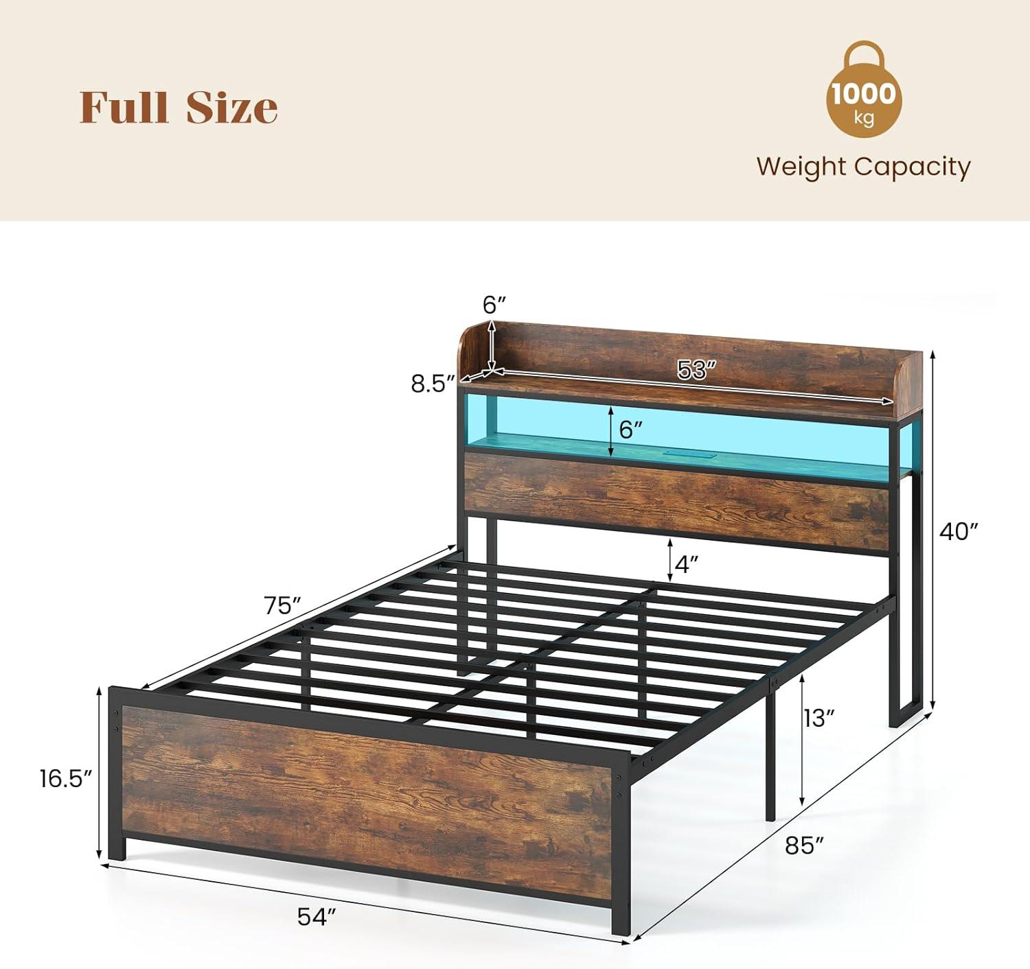 imageGiantex Queen Size Bed Frame with Storage Headboard Metal Platform Bed wLED Light ampamp Charging Station Linen Upholstered Headboard Heavy Duty Slat Support No Box Spring Needed NoiseFreeRustic Brownblack