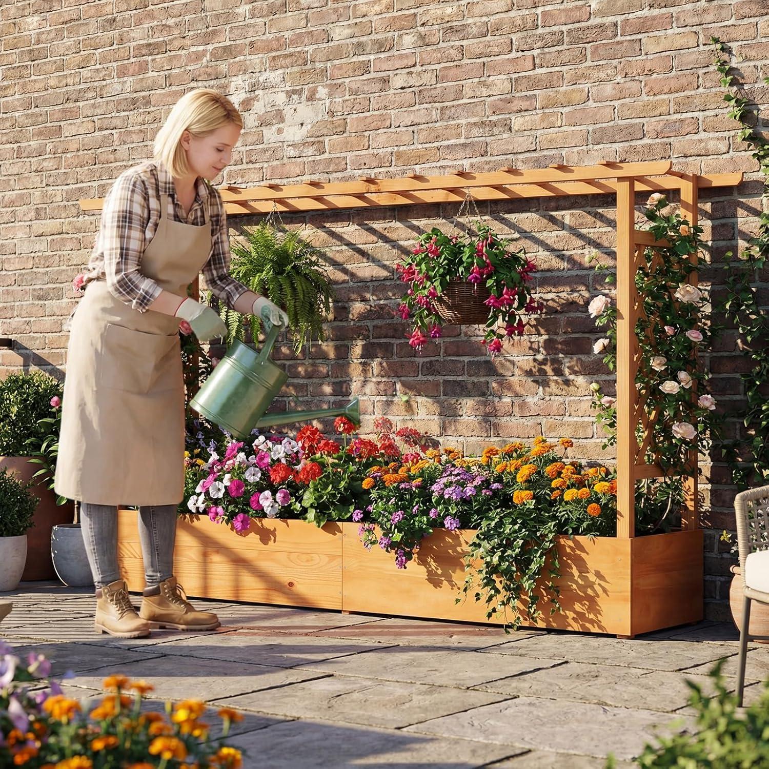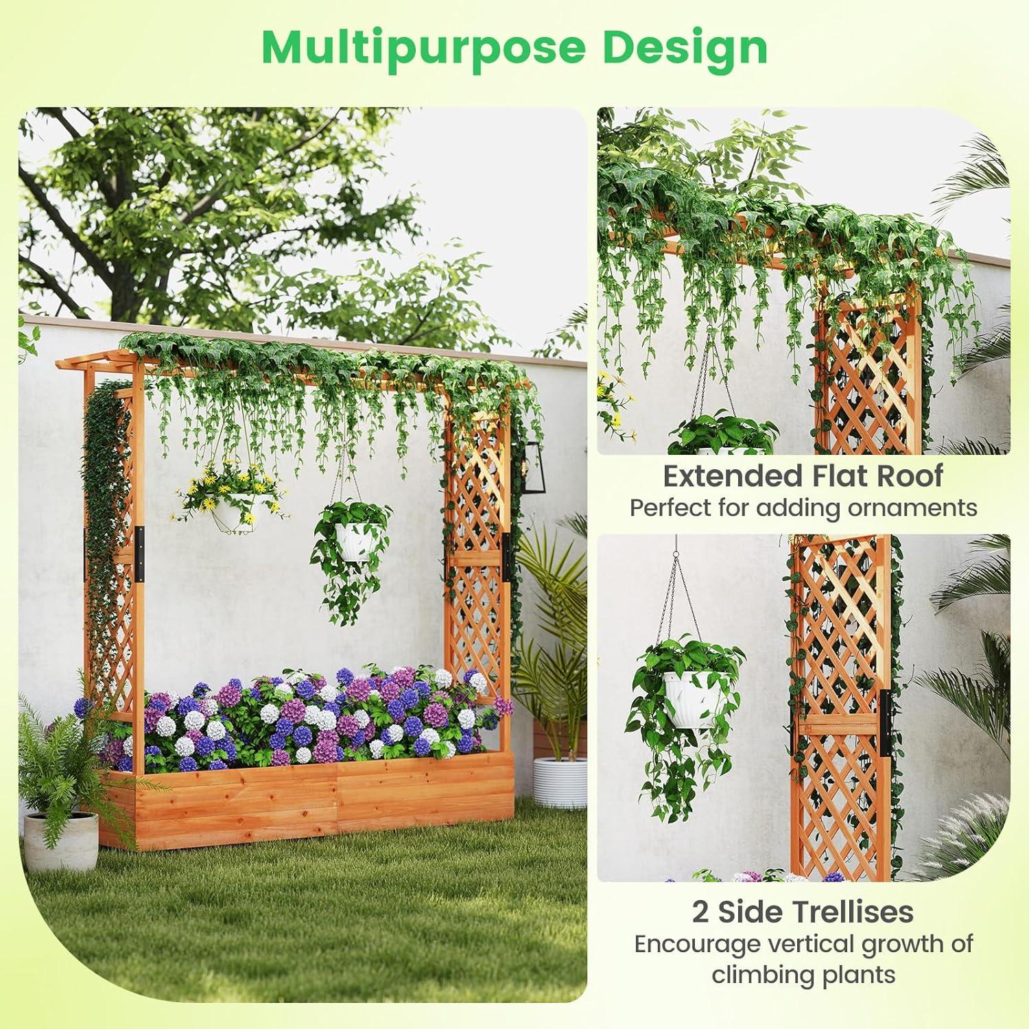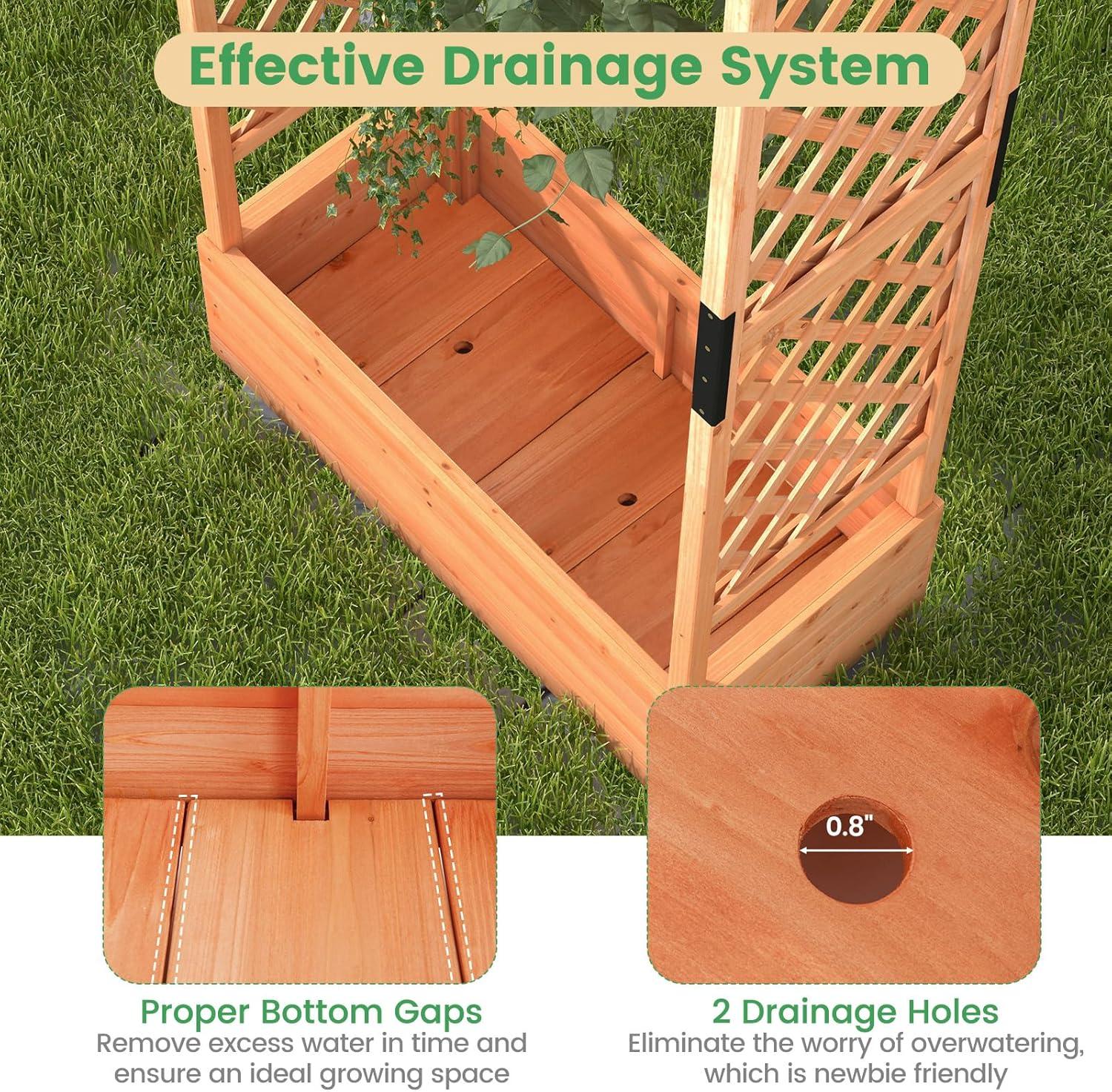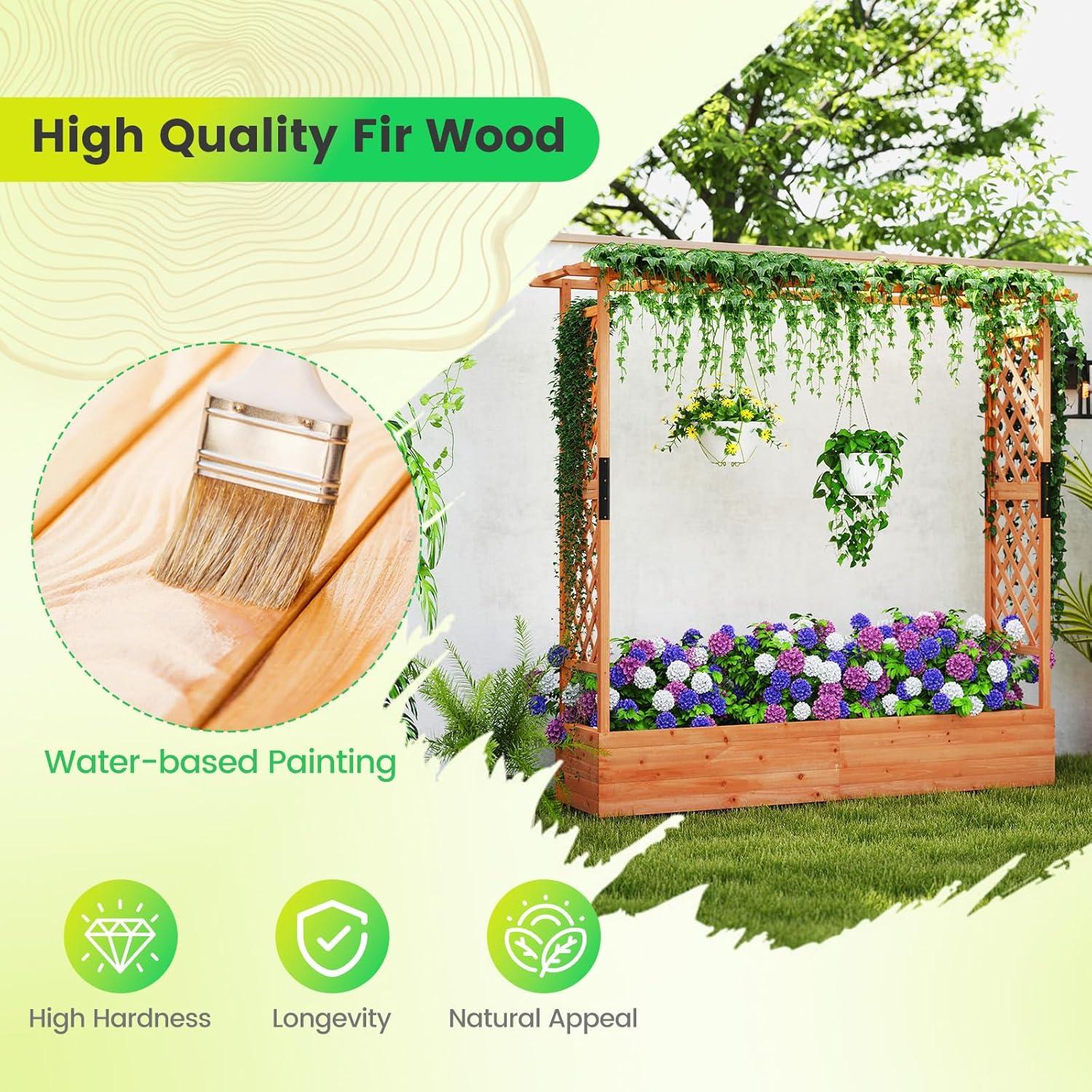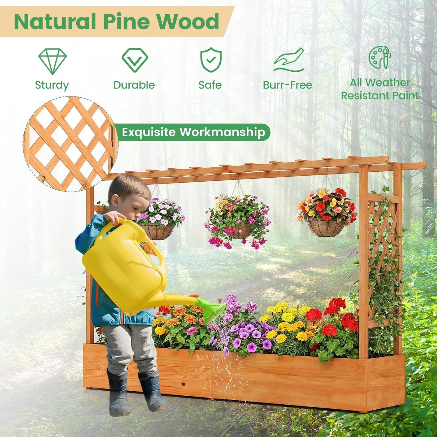 Discover the ultimate garden bed with a trellis, designed to elevate your gardening experience. Its versatile raised design includes a hanging roof, providing ample growing space for basket plants. The planter box is ingeniously divided, featuring 2 trellises that maximize gardening space. Crafted from solid pine wood, this frame is sturdy, durable and safe. With its all-weather painting, it is applicable to different outdoor occasions. The advanced drainage system, complete with drainage holes and bottom gaps, eliminates the worry of overwatering. Setting up this garden bed with trellis is a breeze with the provided clear instructions and hardware.