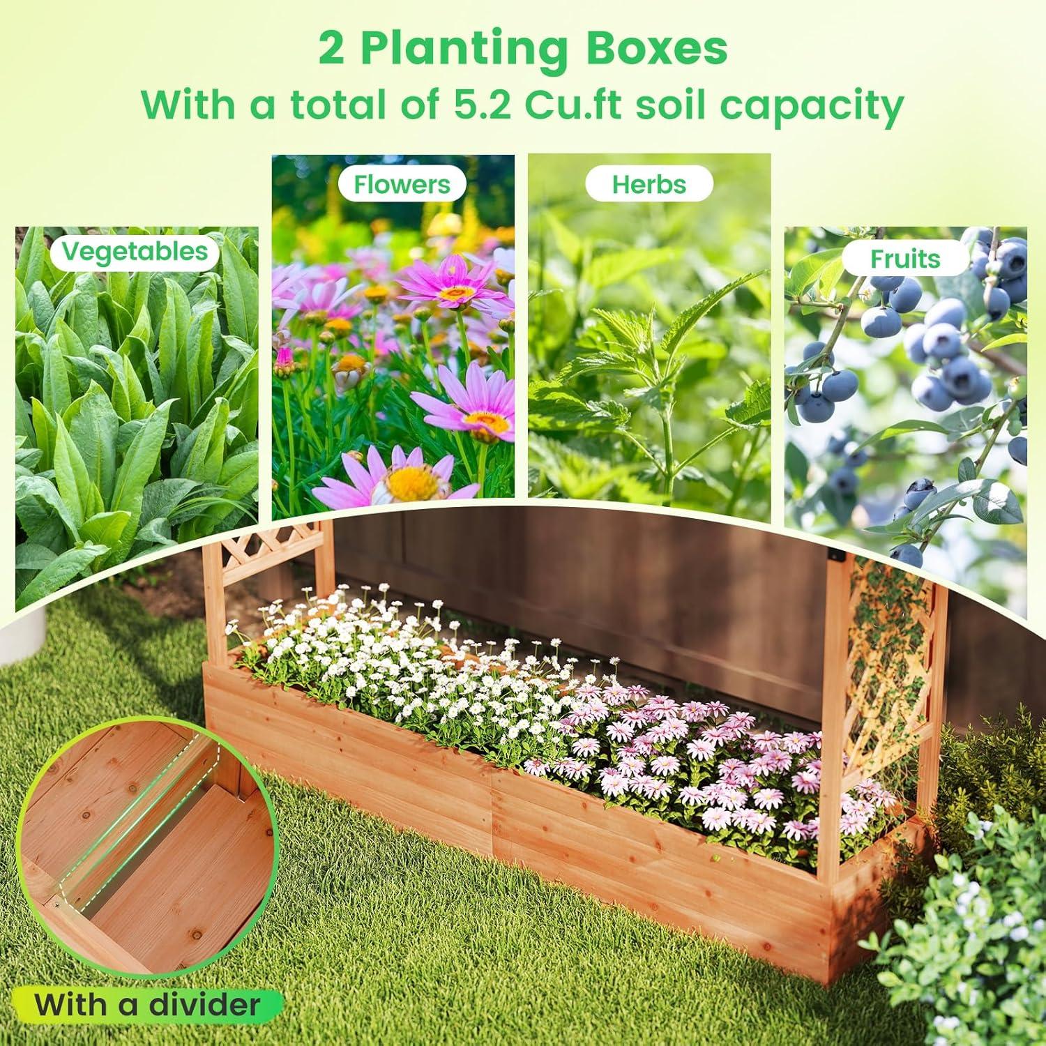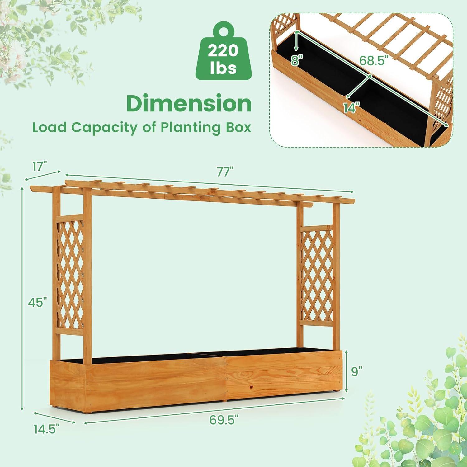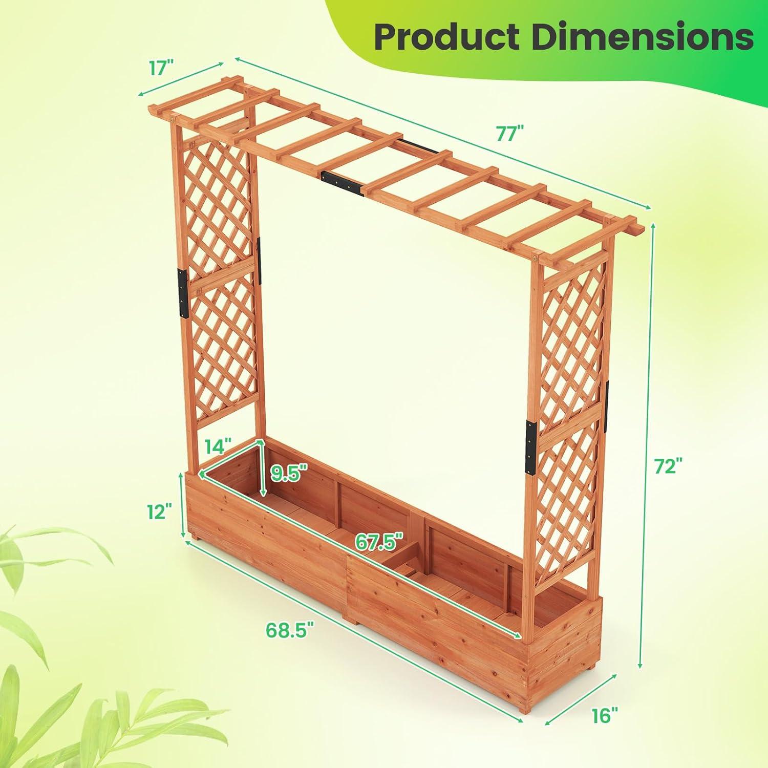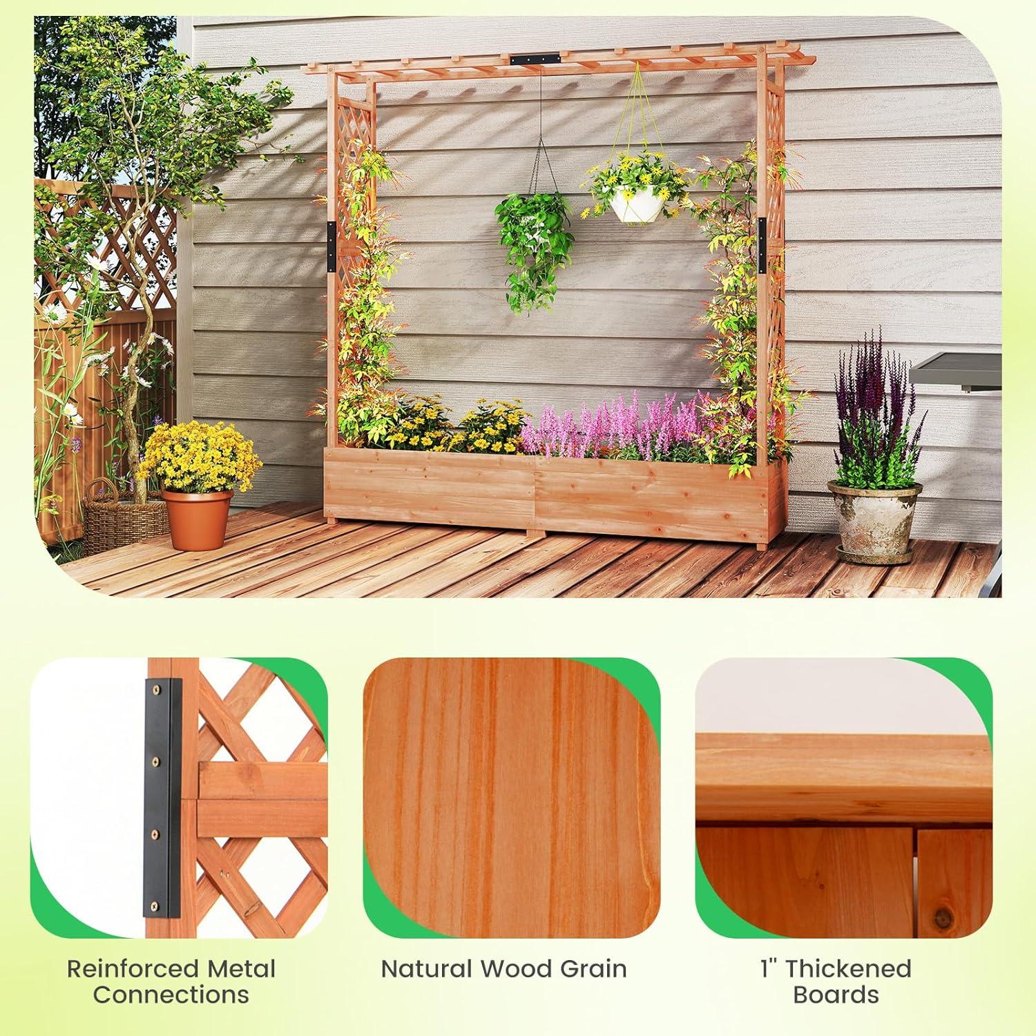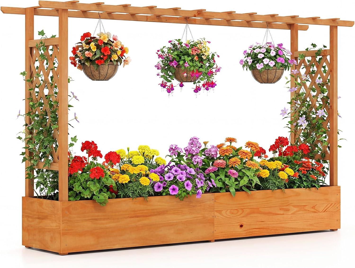 Discover the ultimate garden bed with a trellis, designed to elevate your gardening experience. Its versatile raised design includes a hanging roof, providing ample growing space for basket plants. The planter box is ingeniously divided, featuring 2 trellises that maximize gardening space. Crafted from solid pine wood, this frame is sturdy, durable and safe. With its all-weather painting, it is applicable to different outdoor occasions. The advanced drainage system, complete with drainage holes and bottom gaps, eliminates the worry of overwatering. Setting up this garden bed with trellis is a breeze with the provided clear instructions and hardware.