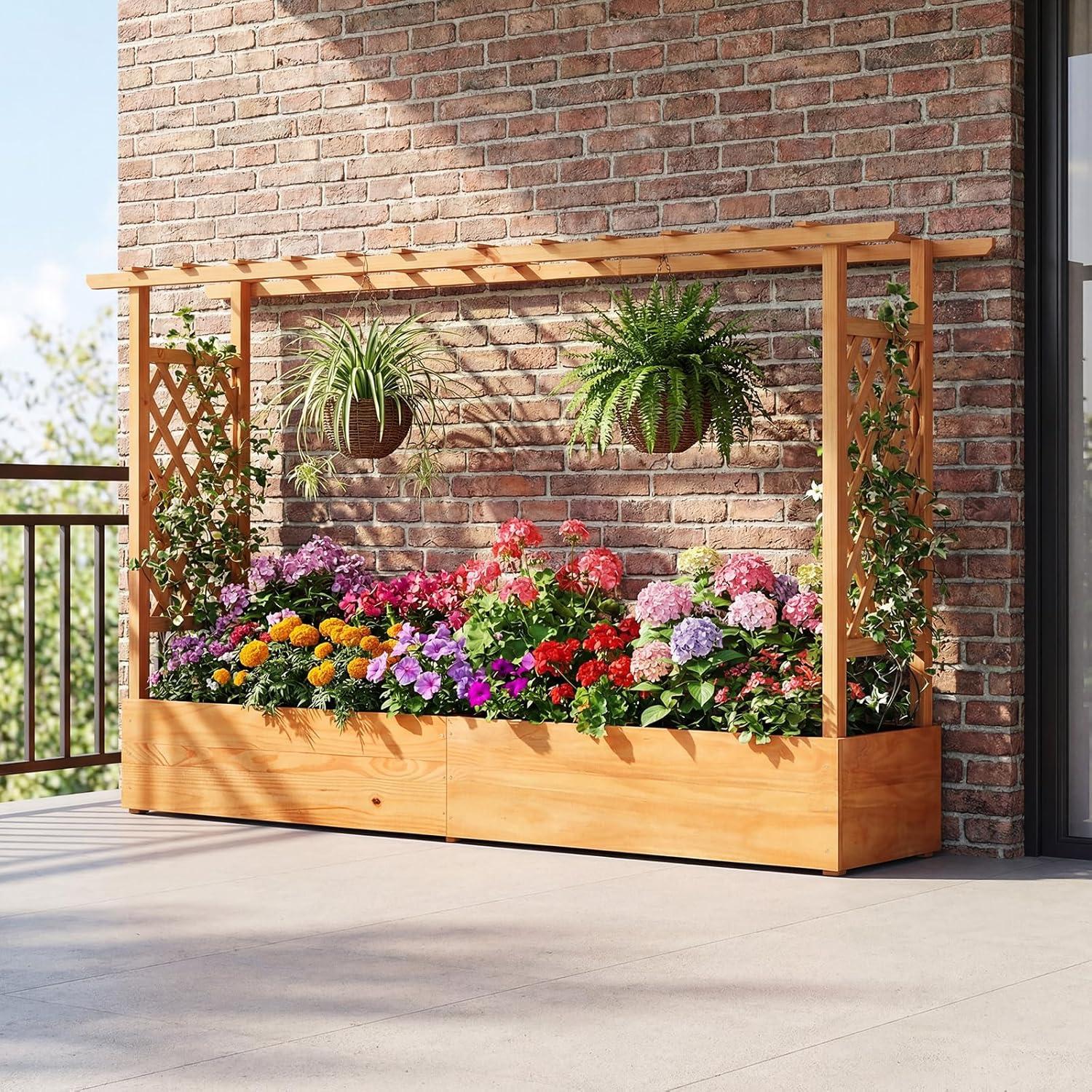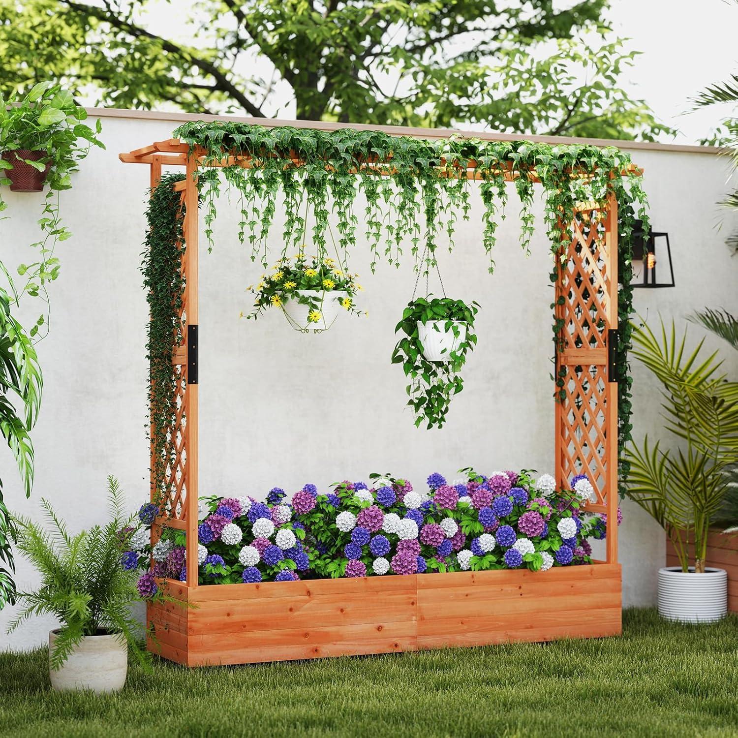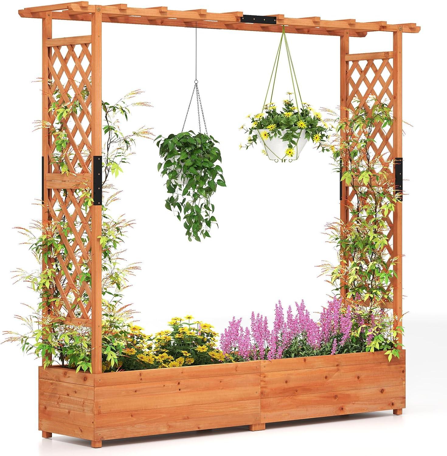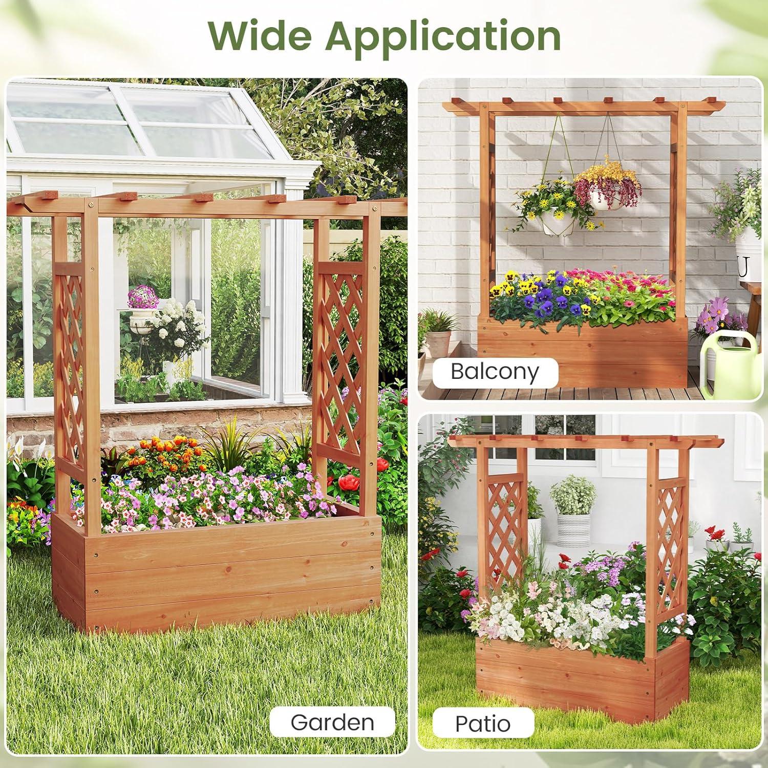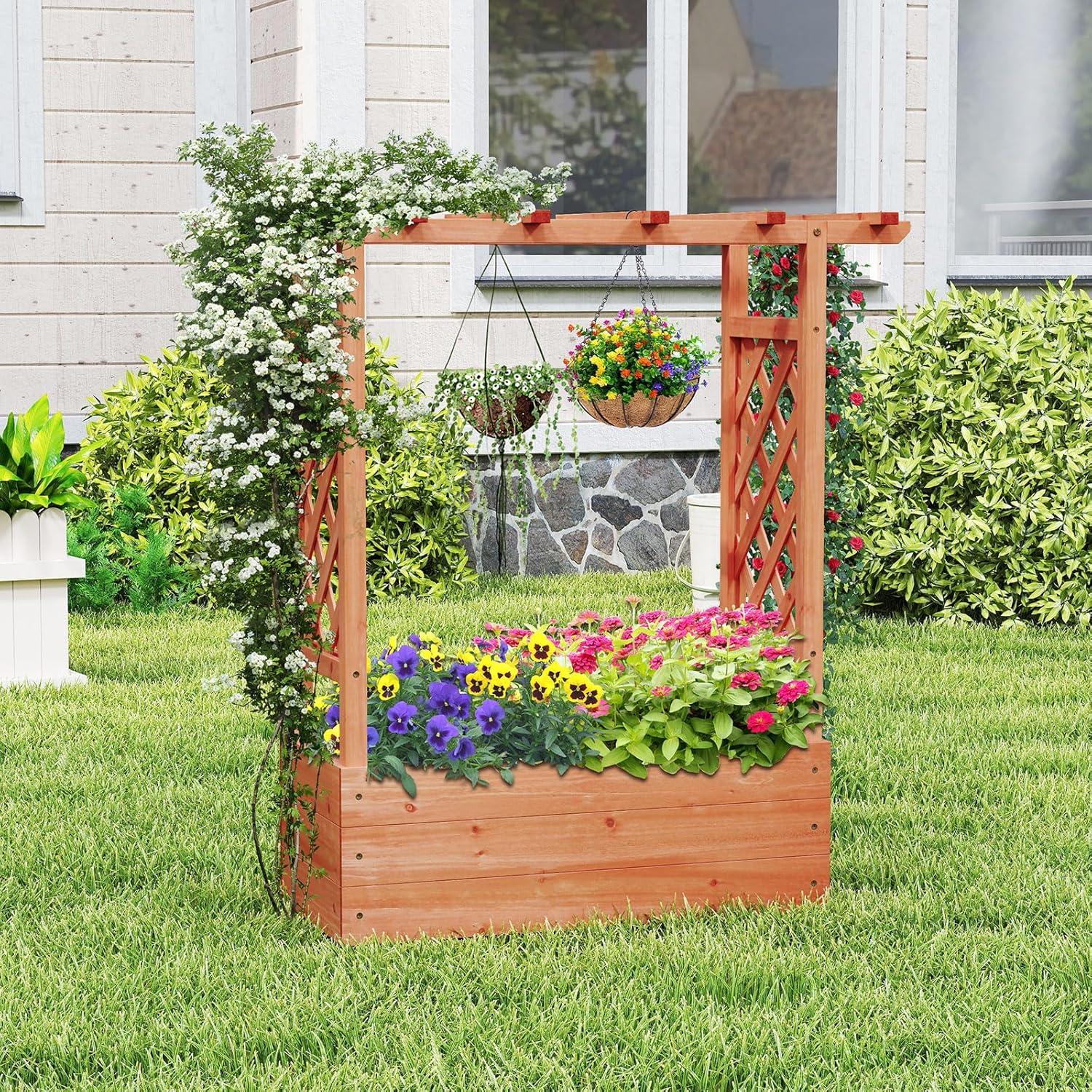 Discover the ultimate garden bed with a trellis, designed to elevate your gardening experience. Its versatile raised design includes a hanging roof, providing ample growing space for basket plants. The planter box is ingeniously divided, featuring 2 trellises that maximize gardening space. Crafted from solid pine wood, this frame is sturdy, durable and safe. With its all-weather painting, it is applicable to different outdoor occasions. The advanced drainage system, complete with drainage holes and bottom gaps, eliminates the worry of overwatering. Setting up this garden bed with trellis is a breeze with the provided clear instructions and hardware.
