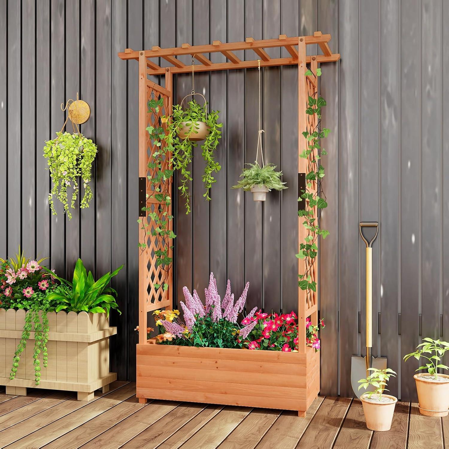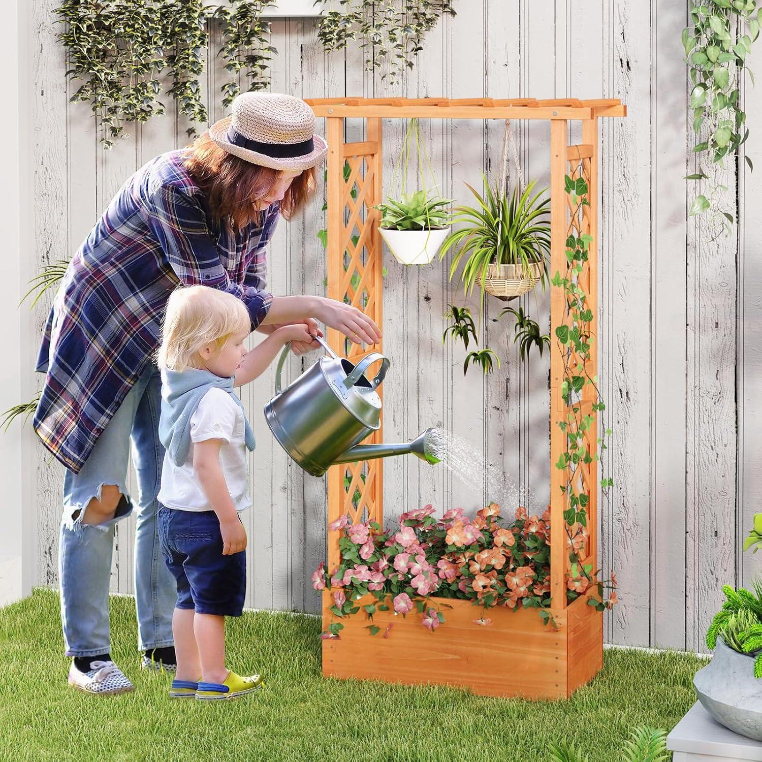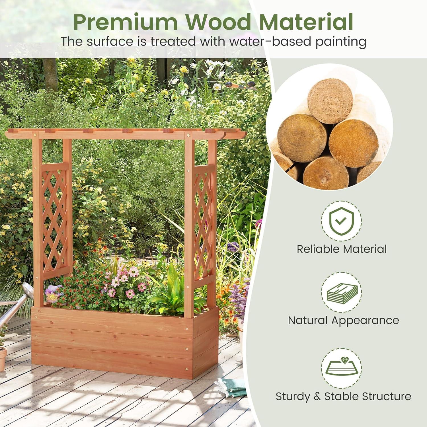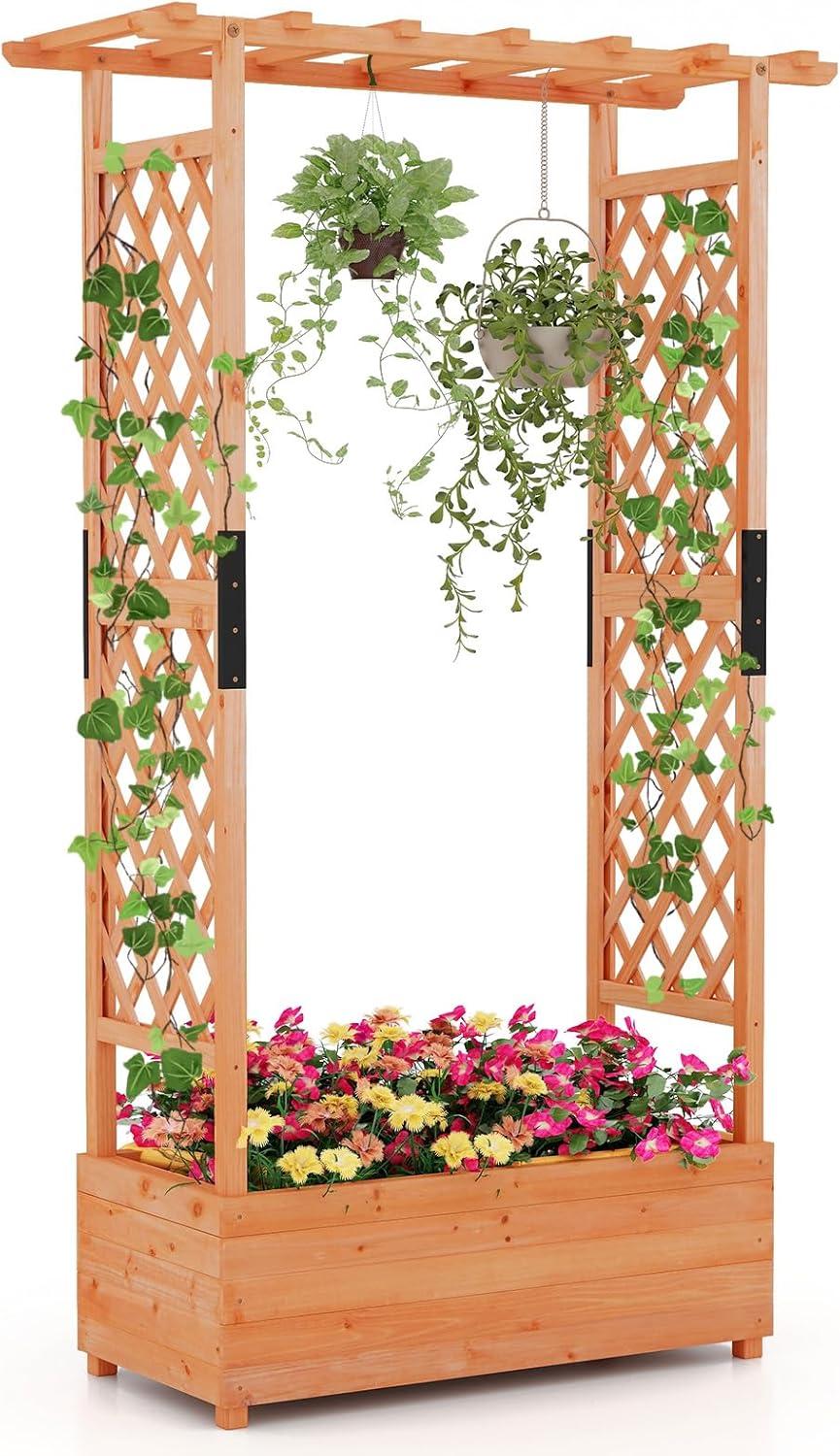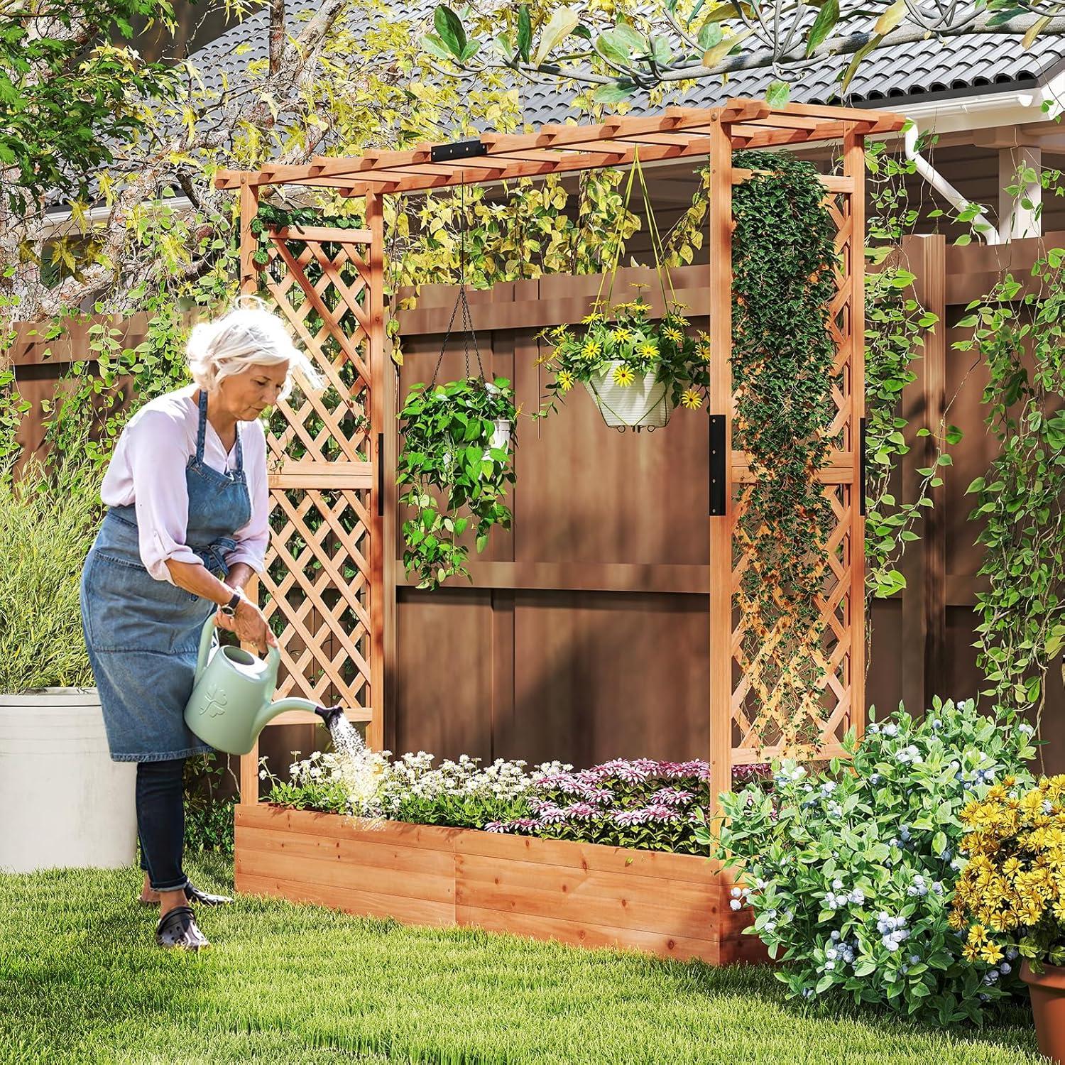 Discover the ultimate garden bed with a trellis, designed to elevate your gardening experience. Its versatile raised design includes a hanging roof, providing ample growing space for basket plants. The planter box is ingeniously divided, featuring 2 trellises that maximize gardening space. Crafted from solid pine wood, this frame is sturdy, durable and safe. With its all-weather painting, it is applicable to different outdoor occasions. The advanced drainage system, complete with drainage holes and bottom gaps, eliminates the worry of overwatering. Setting up this garden bed with trellis is a breeze with the provided clear instructions and hardware.