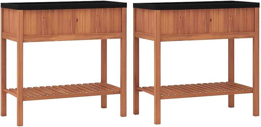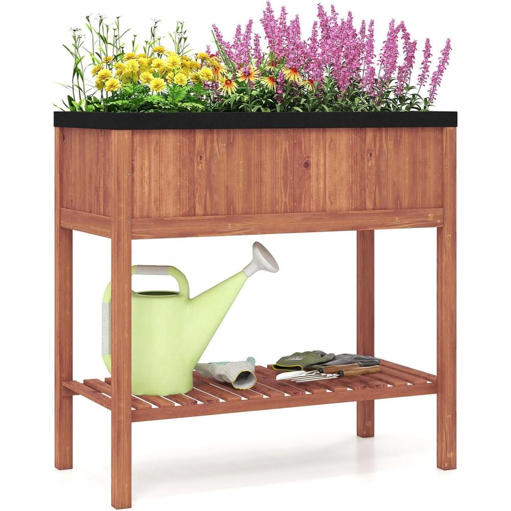 Standing at 39 inches, it keeps plants safe from wild animals and eliminates the need to squat or bend while watering. The planter box has 10 drainage holes and slats at the bottom for efficient water drainage and air circulation, preventing over-watering. Made from sturdy, anti-crack natural pine wood, it offers long-lasting durability. The included black liner retains soil and protects the planter. A spacious lower shelf provides ample storage for gardening tools, boots, kettle, shovel, and potted plants. Suitable for patios, gardens, and lawns, this planter box is perfect for both experienced gardeners and beginners.