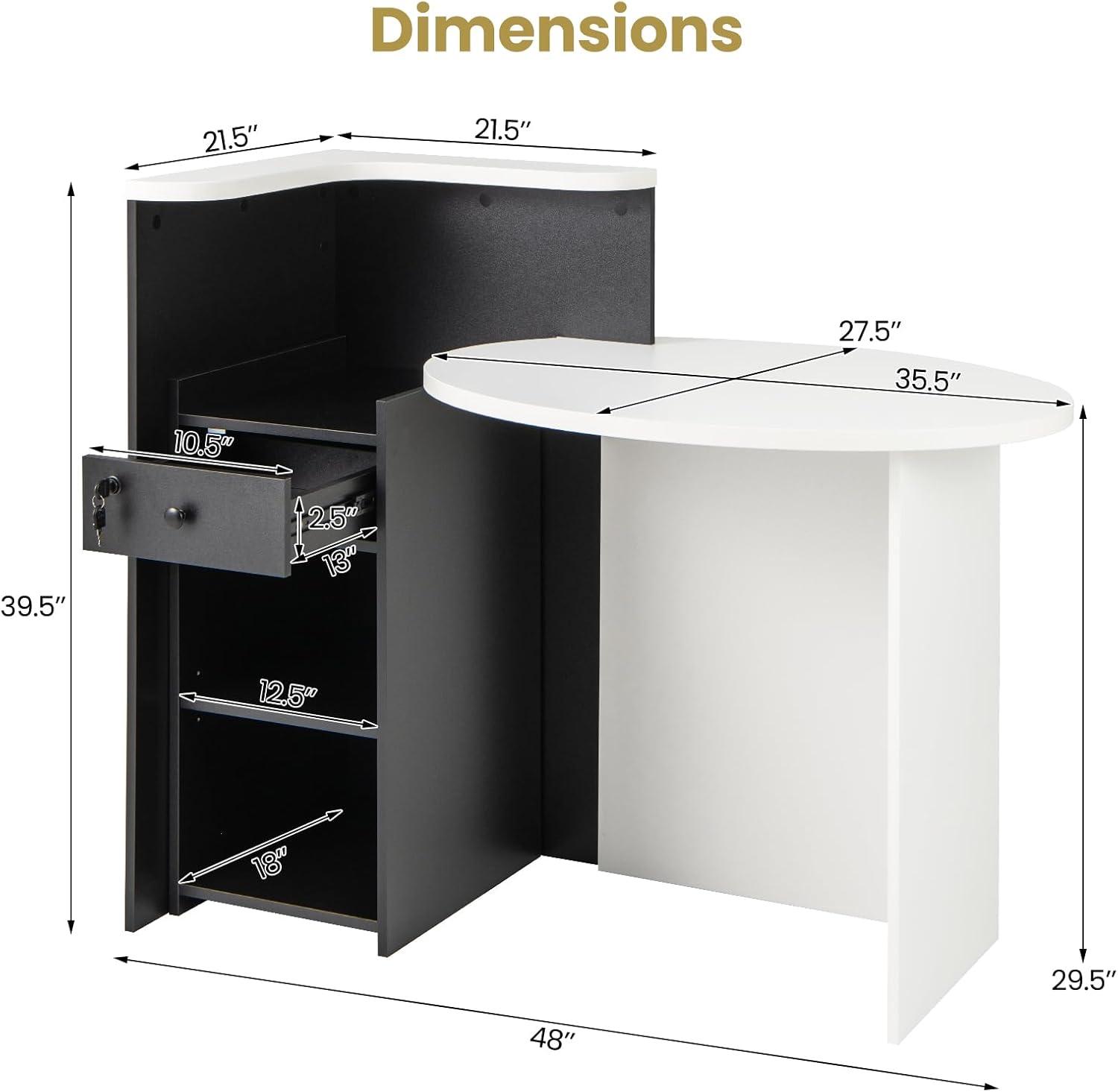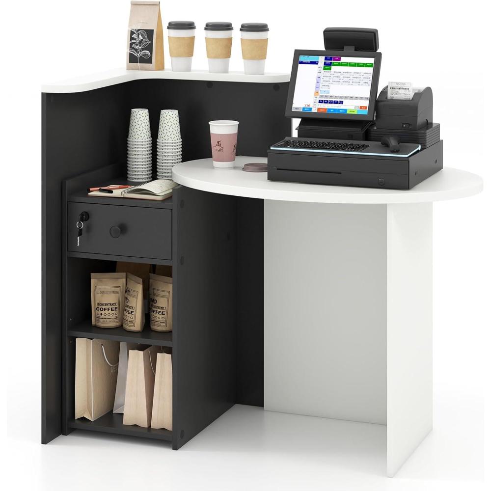 [Organize with Ease]: Got tons of stuff cluttered on your old counter? This reception desk with ample storage space may help. A wide desktop and elevated corner shelf can accommodate the computer, cash register, ornaments and other stuff.