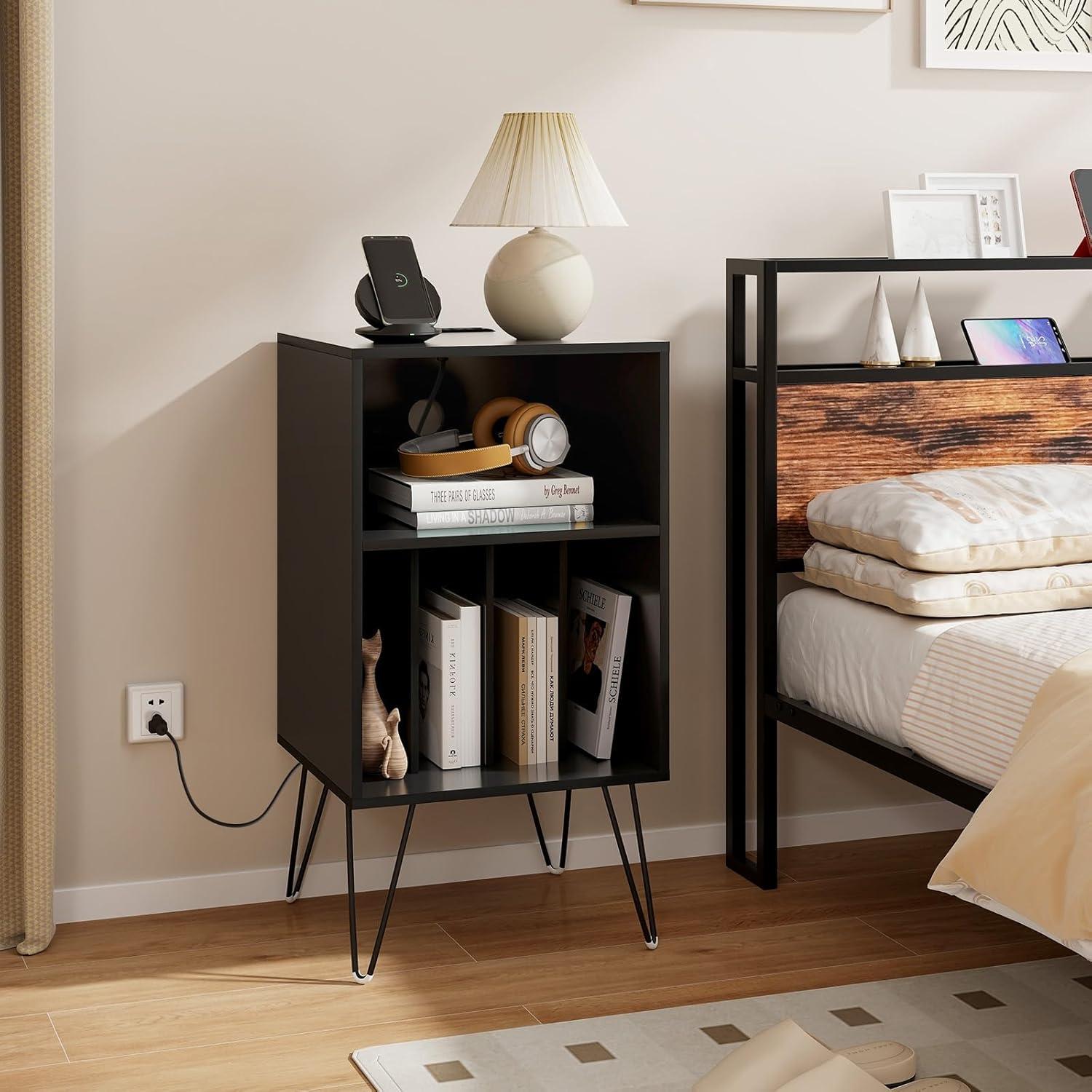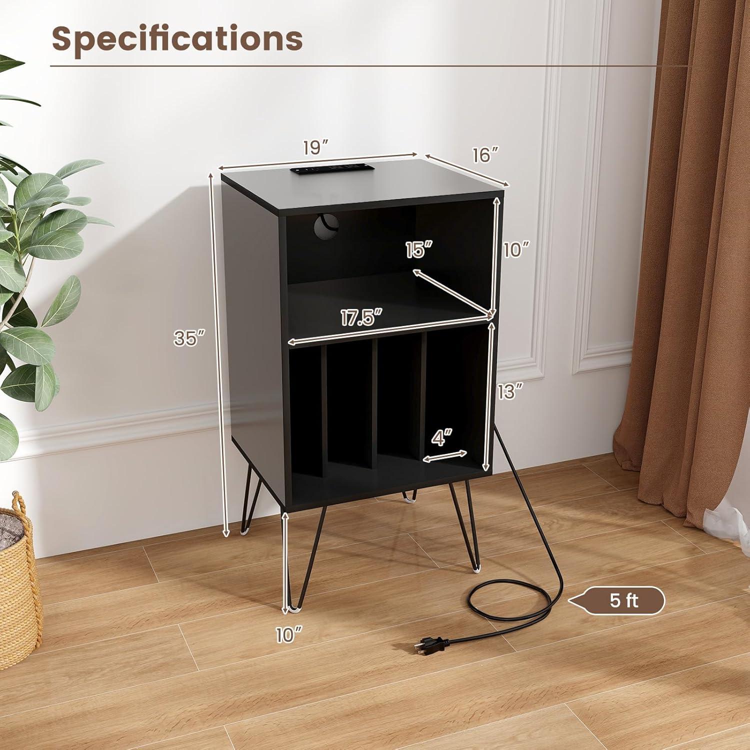 Giantex Record Player Stand with Charging Station, Turntable Cabinet with Record Storage & Metal Legs, Vinyl Record Storage Cabinet Holds Up to 150 Albums for Living Room, Bedroom (Light Oak)(Black)