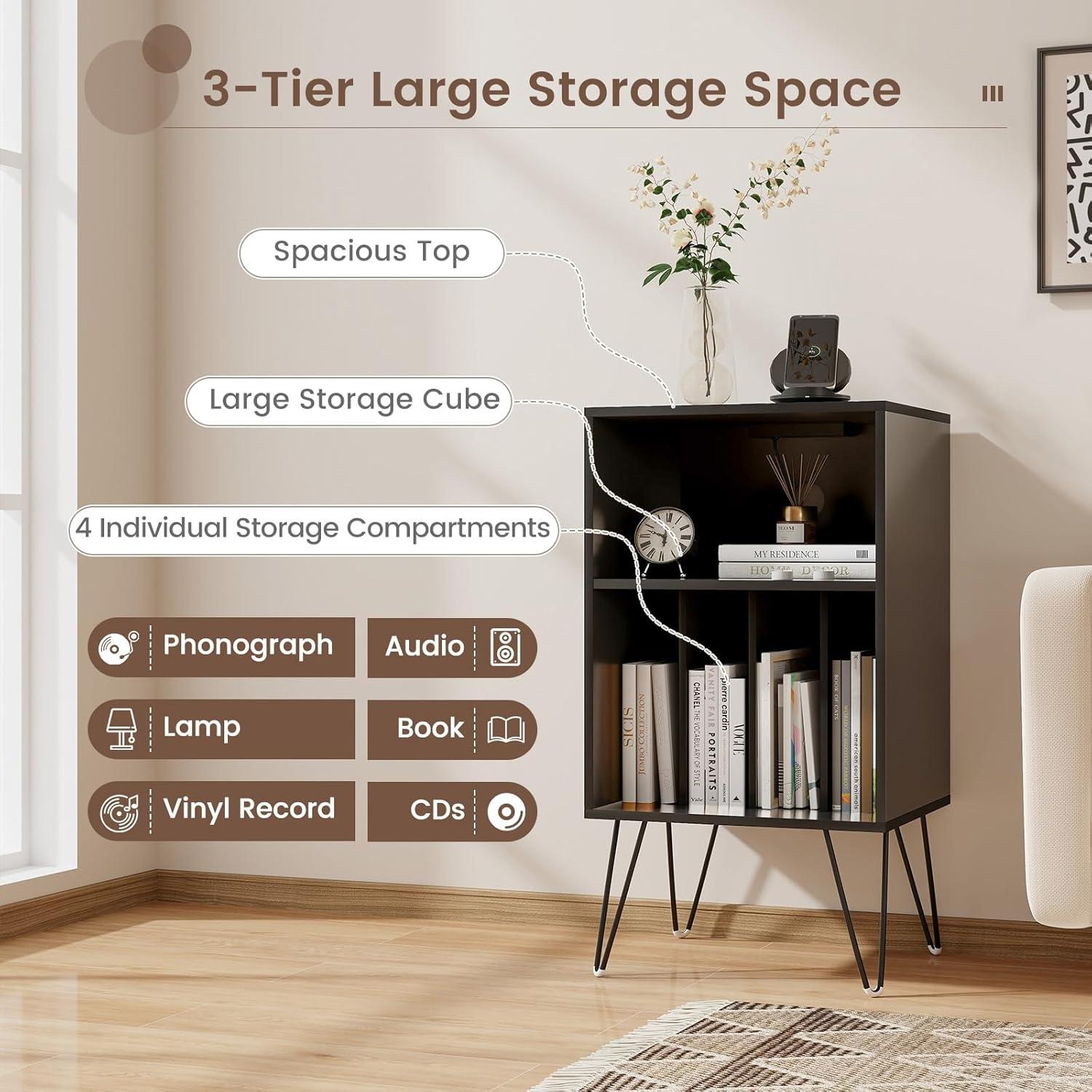 [Streamlined Vinyl Record Storage]: Our turntable stand not only stands out with its unique design but also includes four dividers, making it an ideal vinyl record stand for neatly organizing your collection. The spacious top and accessible open shelf ensure all your audio accessories are within reach.