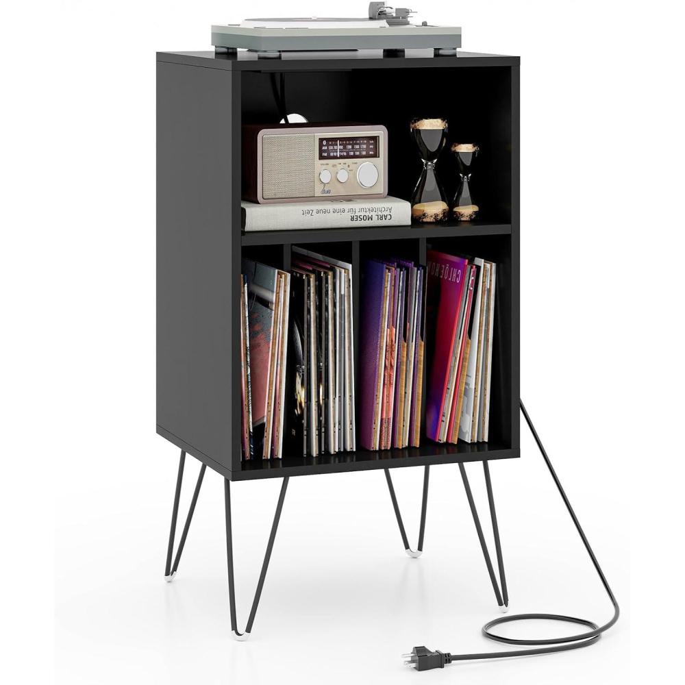 imageGiantex Record Player Stand with Charging Station Turntable Cabinet with Record Storage ampamp Metal Legs Vinyl Record Storage Cabinet Holds Up to 150 Albums for Living Room Bedroom Light OakBlack