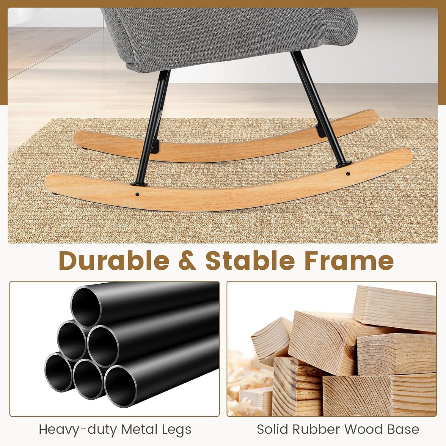 Featuring an ergonomic backrest, humanized armrests and spacious sitting area, this upholstered rocker glider chair offers ultimate comfort. Moreover, you can rock for more relaxation. Upholstered in breathable linen fabric with a high-density sponge filling, the rocker glider chair is comfortable to sit on. Additionally, the sturdy metal legs and a solid rubber wood base contribute to overall stability, allowing the rocking accent chair to support up to 350 lbs. Whether in your living room, bedroom, or nursery, it is a perfect complement, where you can enjoy wonderful leisure times. When it comes to assembly, the clear user’s manual will help a lot.