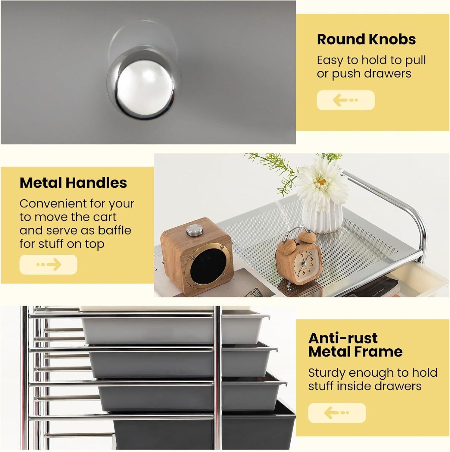 [Durable Metal Frame and Light Weight]: The main frame of this drawer storage cart is made of high-quality steel and processed with smooth chrome finish. This 6 drawer rolling cart will serve you for a long time.