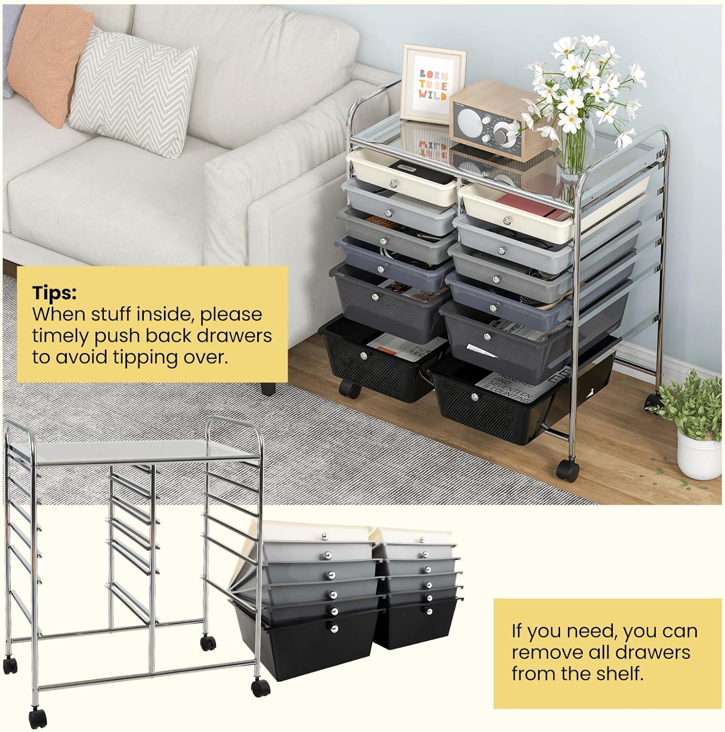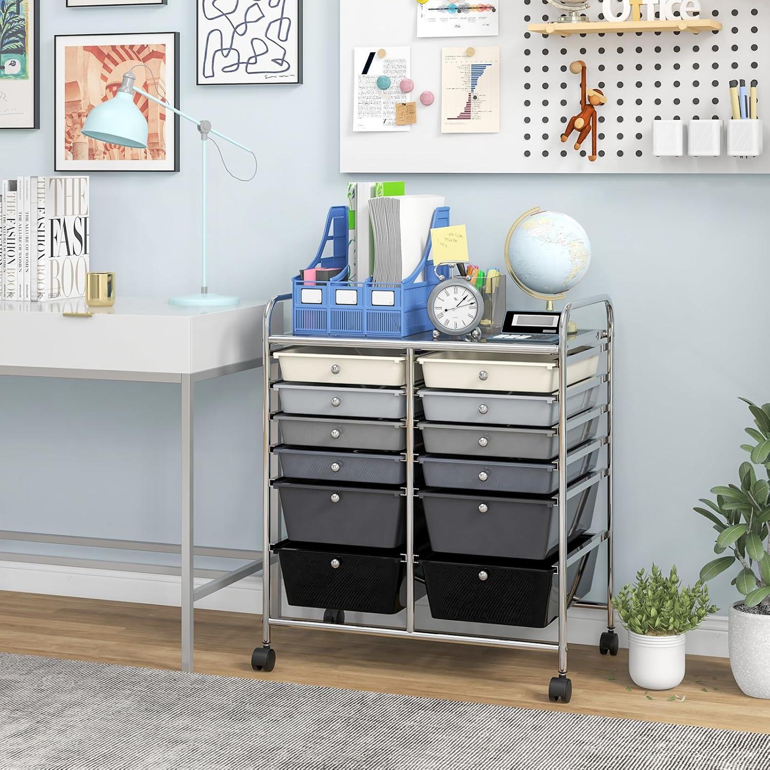 This freestanding drawer cart features 6 plastic drawers with silver drawer pulls and durable sleek metal frame sitting on sturdy casters. Shallow, deep drawers made from sturdy colorful clear plastic make all your items easily viewable while removable casters provide effortless mobility. Its multiple color scheme is sure to fit in with any decor. Keep it in your office for sorting files, mail and other supplies. Store it in your kitchen for recipes, gadgets and dish towels. Place this handy unit in your garage or workshop for organizing tools, screws and other hardware. Great in a classroom for keeping arts and craft supplies in one easy place. You could even use it in a retail setting for sorting back stock items or paperwork. With so many options for this sturdy drawer trolley, there's no reason refusing to own one.
