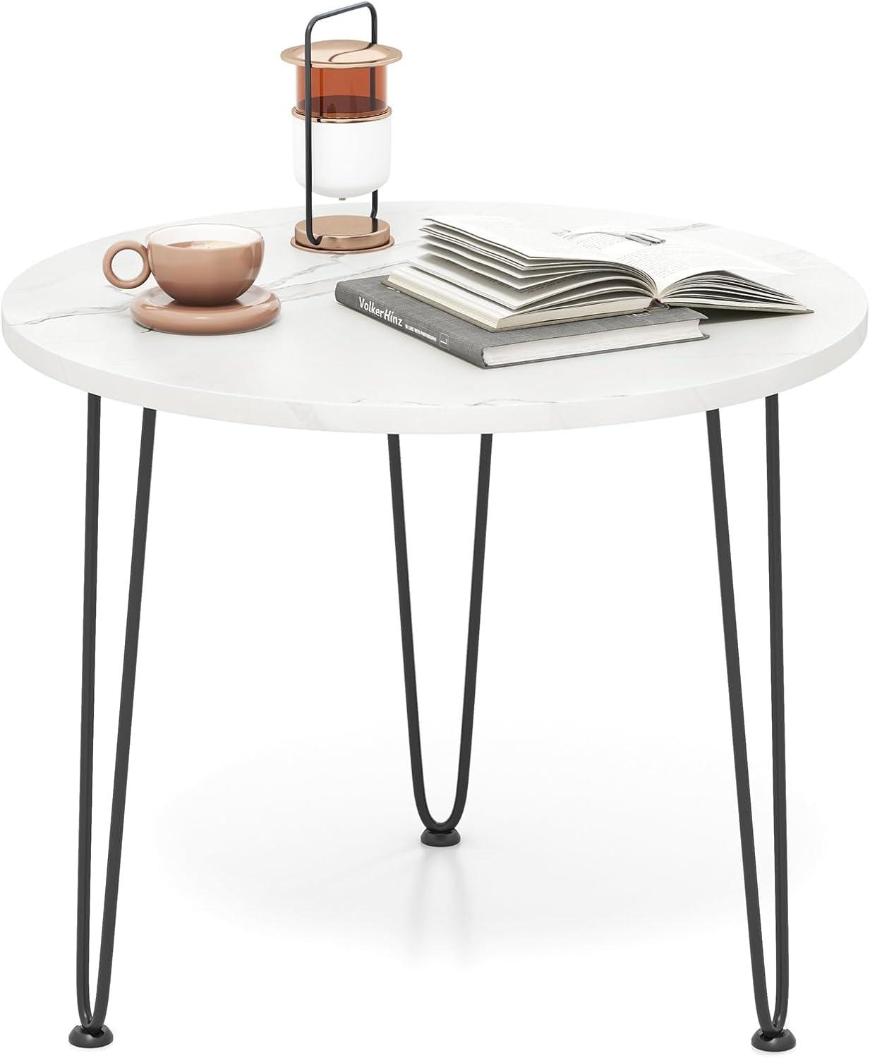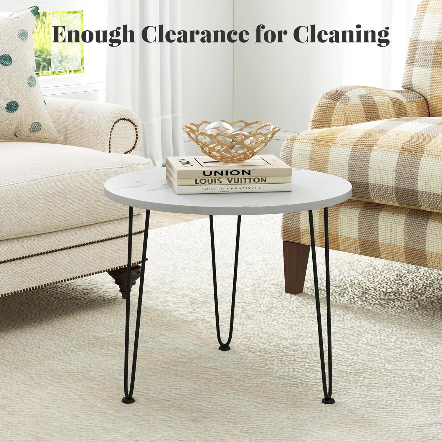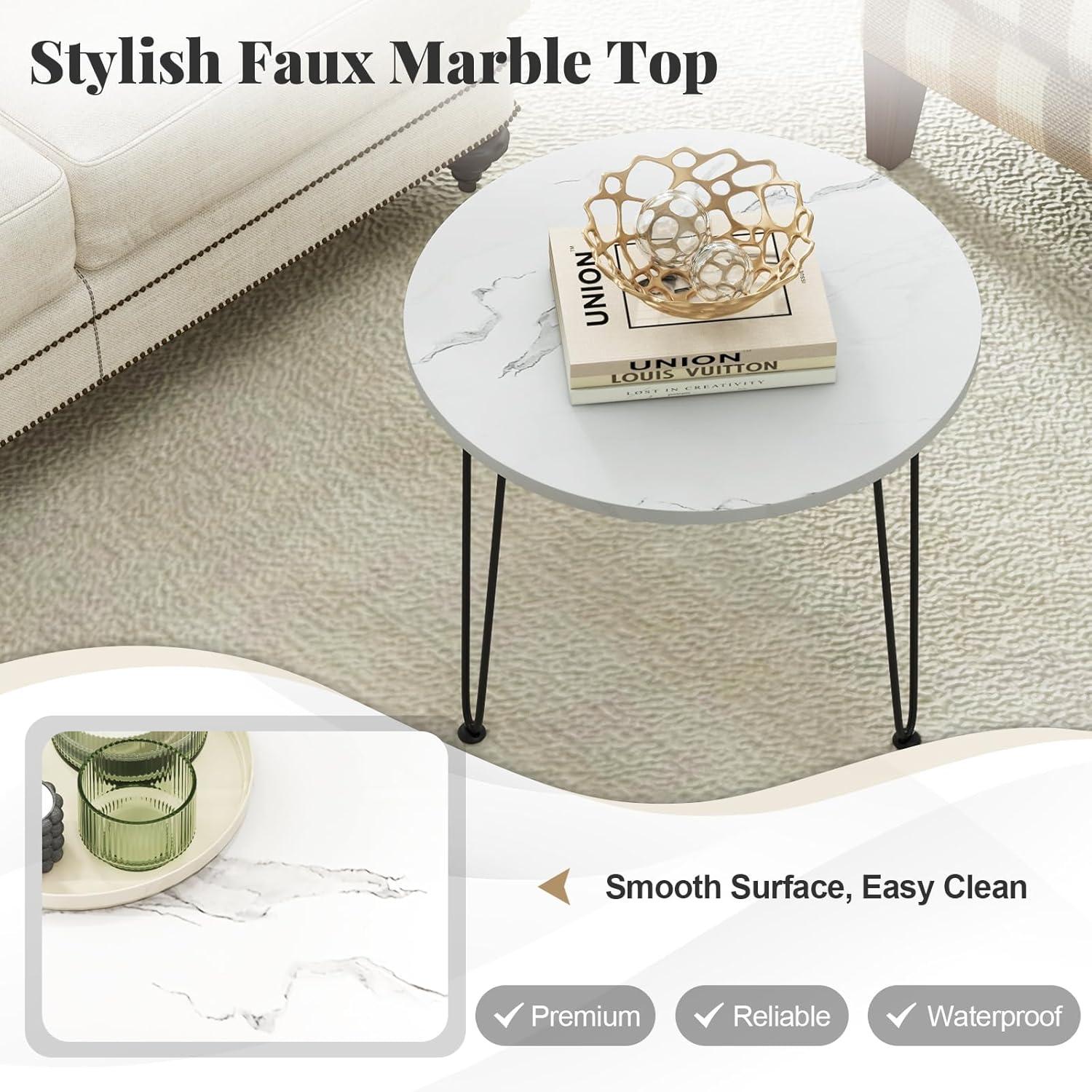 Our round modern coffee table is a sophisticated addition to any living space. Its sleek faux marble top, designed with a distinctive marble appearance, seamlessly blends both aesthetics and function. The smooth, waterproof surface is not only pleasing to the eye but also easy to maintain, ensuring that spills and stains can be wiped away effortlessly. This coffee table offers a generously spacious area, ideal for keeping daily essentials like books, laptops, and decorative items organized and accessible. The tripod-like arrangement of metal pipes enhances the table's stability and supports substantial weight, ensuring it holds up to daily use. Simple, elegant, and stylish appearance well matches your home style!