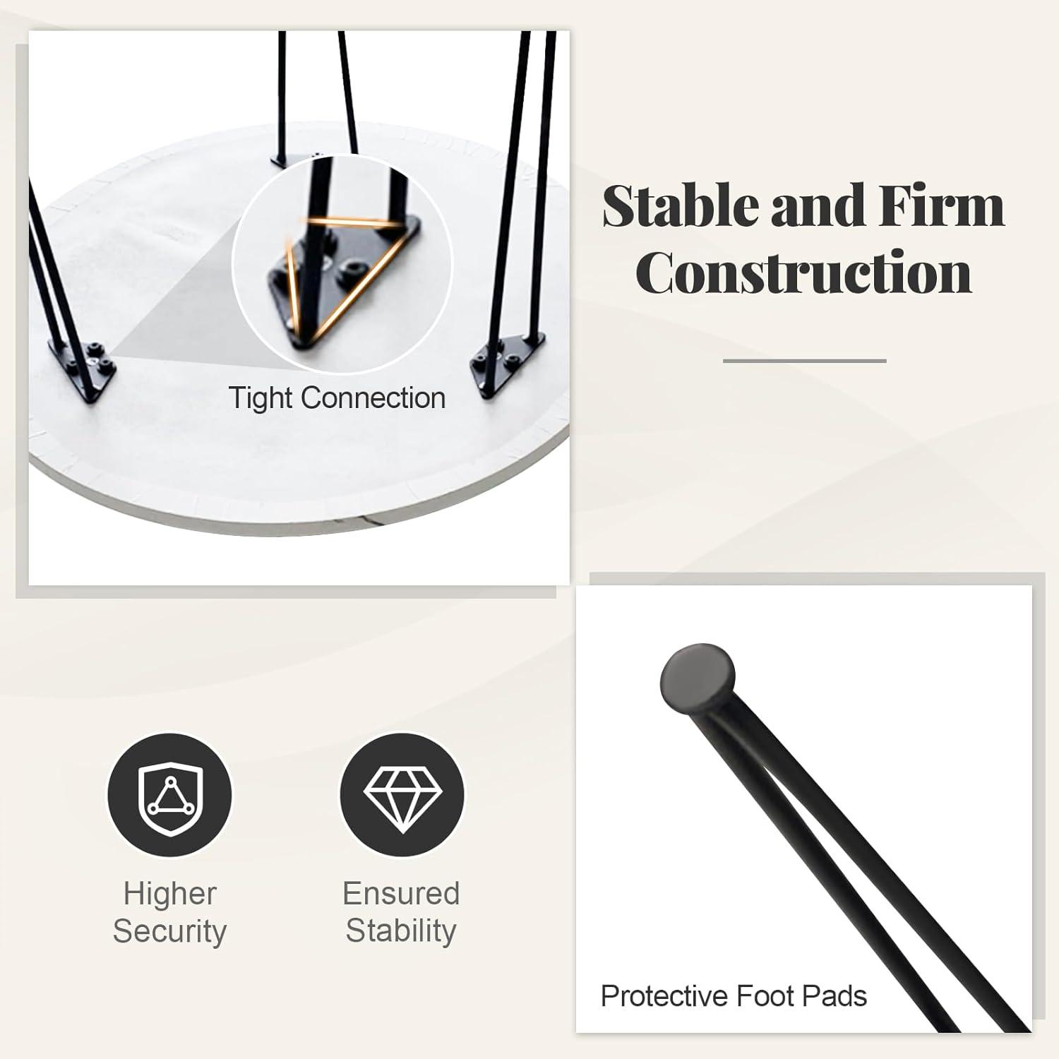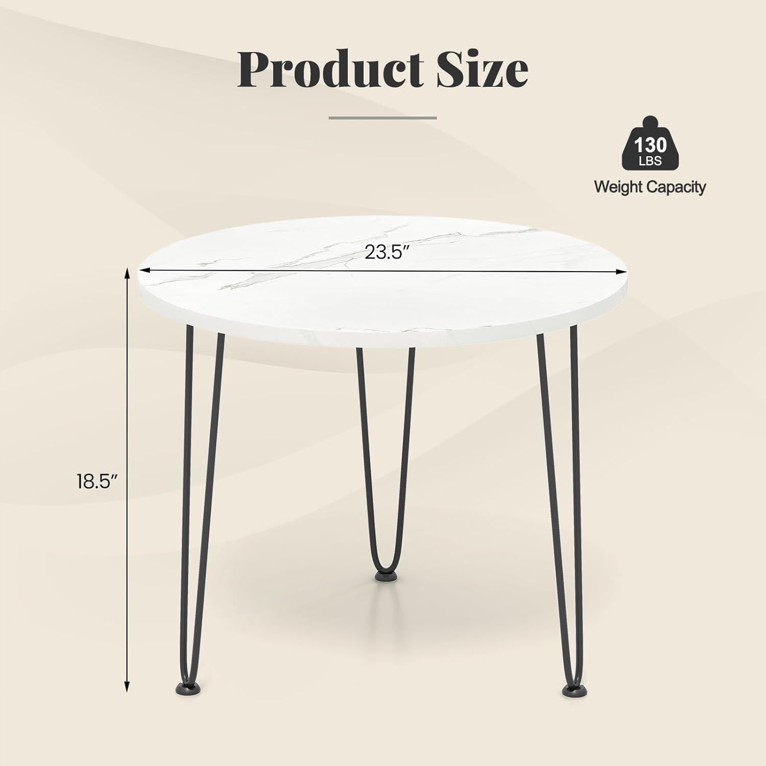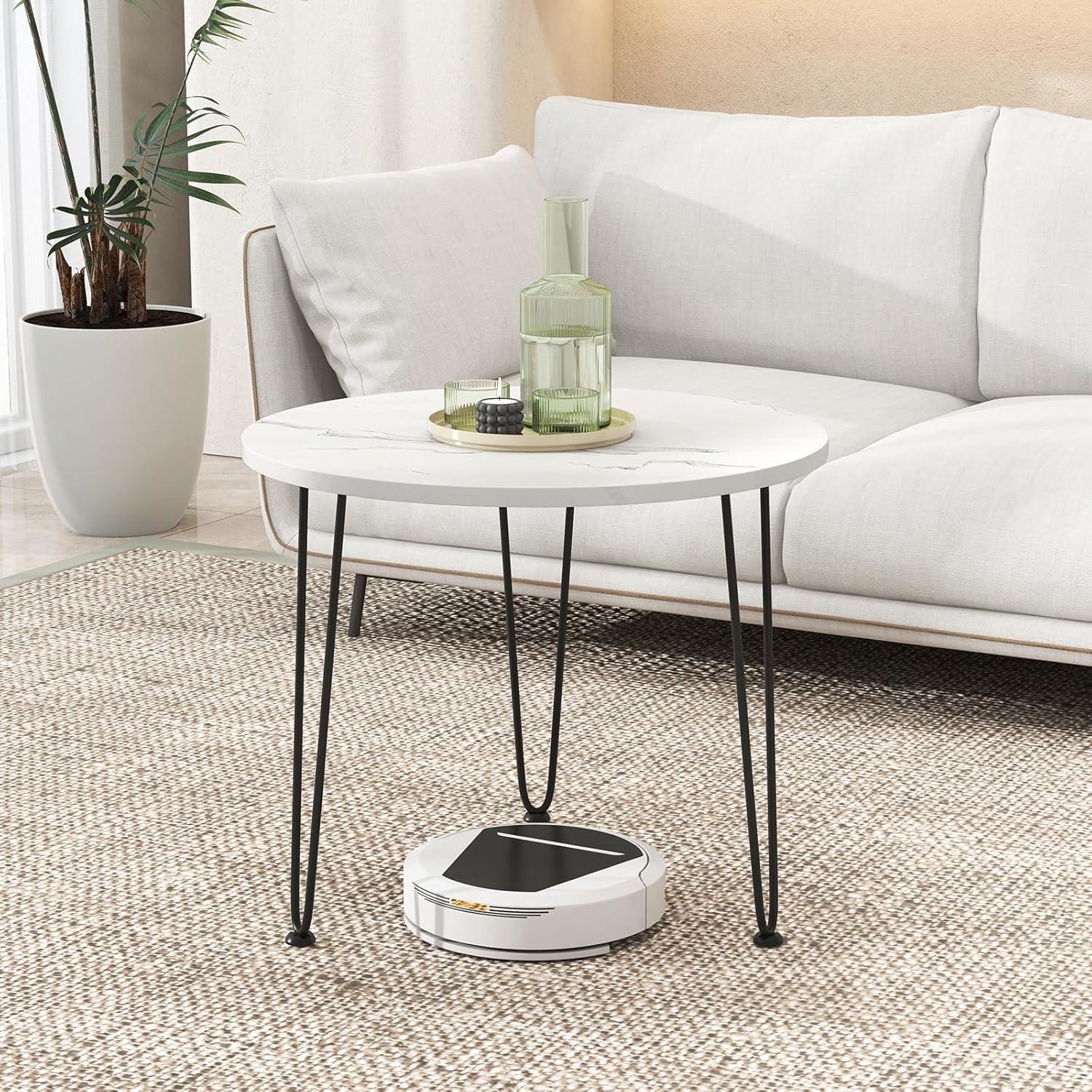 Our round modern coffee table is a sophisticated addition to any living space. Its sleek faux marble top, designed with a distinctive marble appearance, seamlessly blends both aesthetics and function. The smooth, waterproof surface is not only pleasing to the eye but also easy to maintain, ensuring that spills and stains can be wiped away effortlessly. This coffee table offers a generously spacious area, ideal for keeping daily essentials like books, laptops, and decorative items organized and accessible. The tripod-like arrangement of metal pipes enhances the table's stability and supports substantial weight, ensuring it holds up to daily use. Simple, elegant, and stylish appearance well matches your home style!