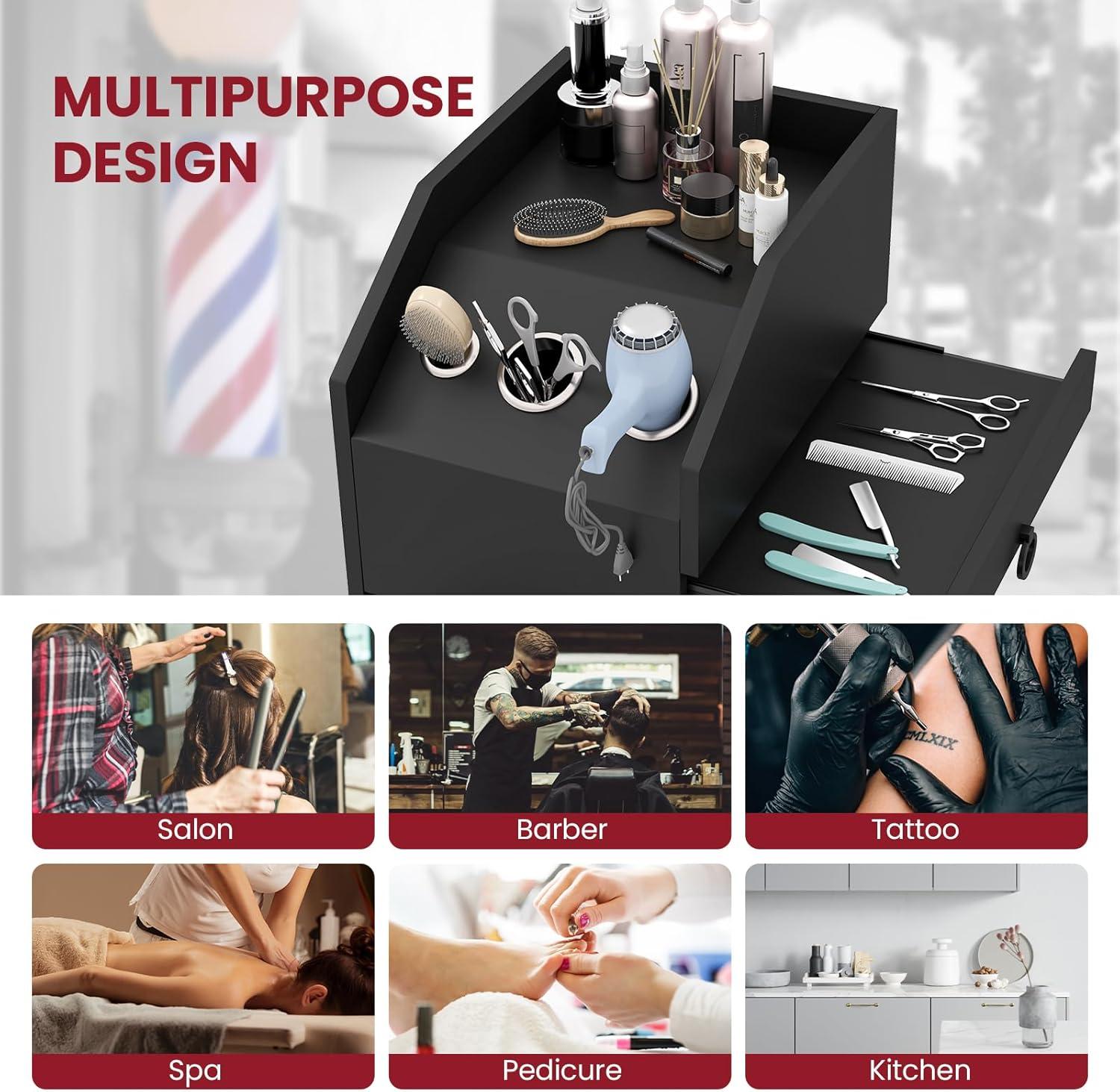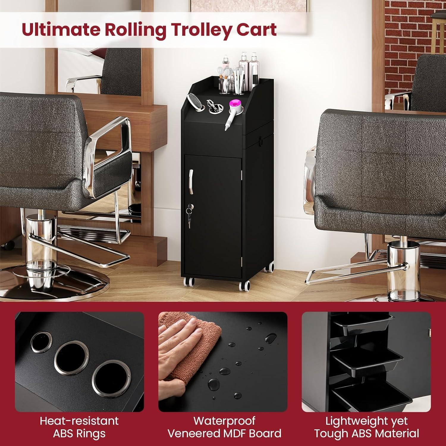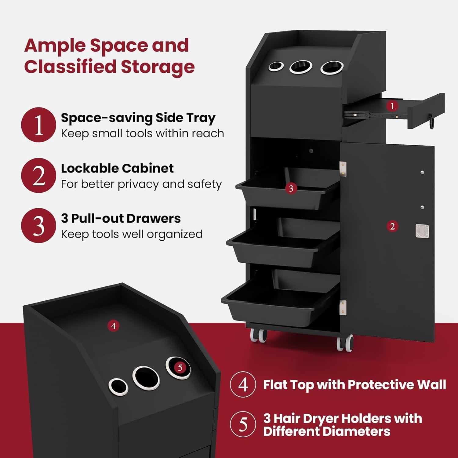 This salon trolley cart measures 12'' x 17'' x 36'' (L x W x H) and comes with several storage compartments to keep your tools within reach and well organized. It includes a lockable cabinet with 3 pull-out drawers, a space-saving side tray, 3 rings for holding hair dryers, and a flat top with protective wall. More than that, it seamlessly glides on 4 smooth rolling wheels for easy maneuverability, and they can be securely locked for stability during treatments. Ideal for various establishments like beauty salons, barber shops, spas, tattoo studios, and nail salons, this salon trolley cart is a must-have for professionals looking to streamline their workspace and provide top-notch service to their clients.