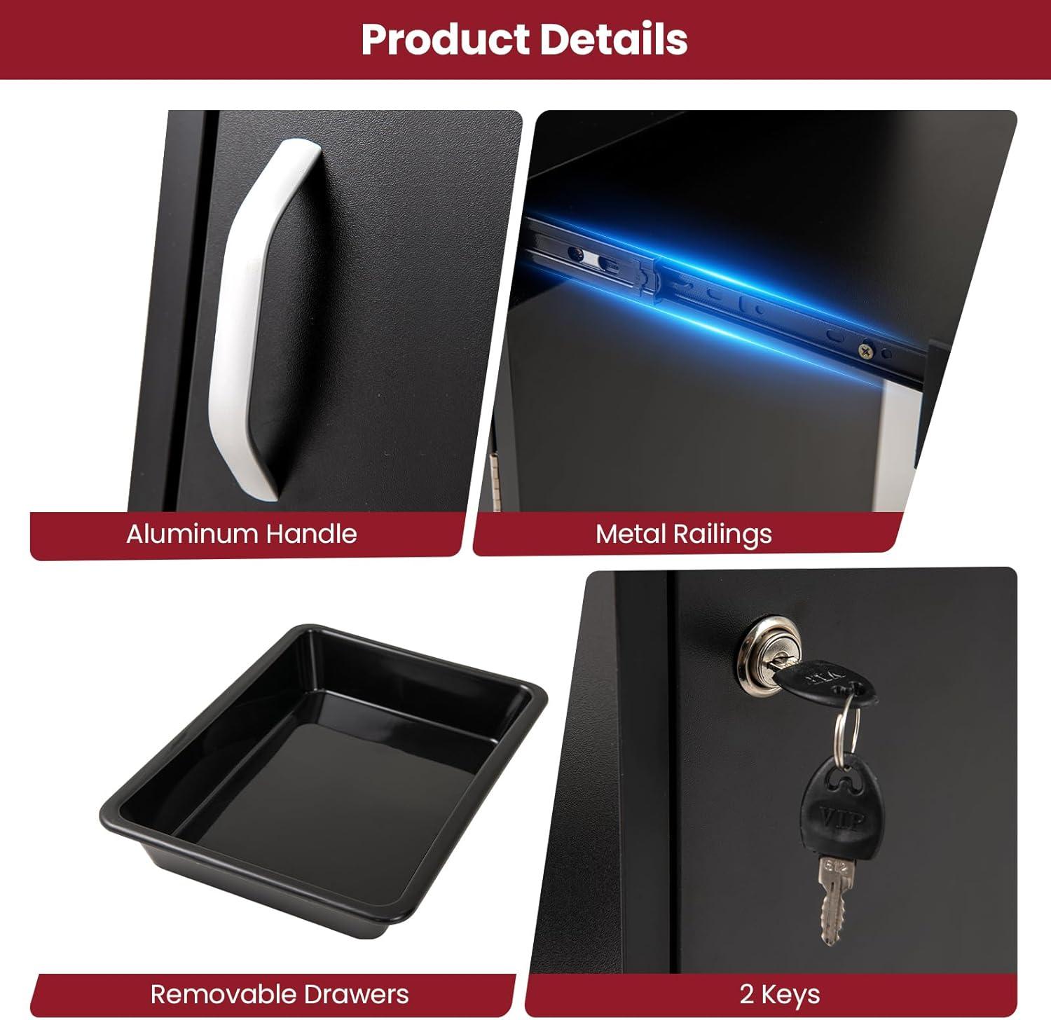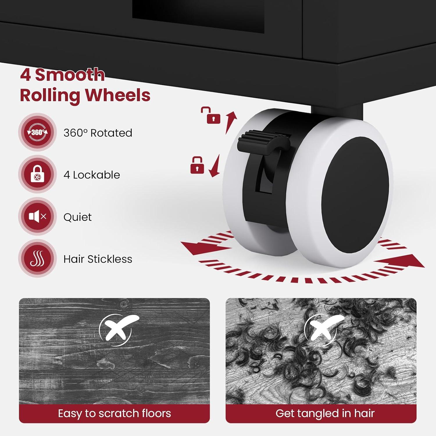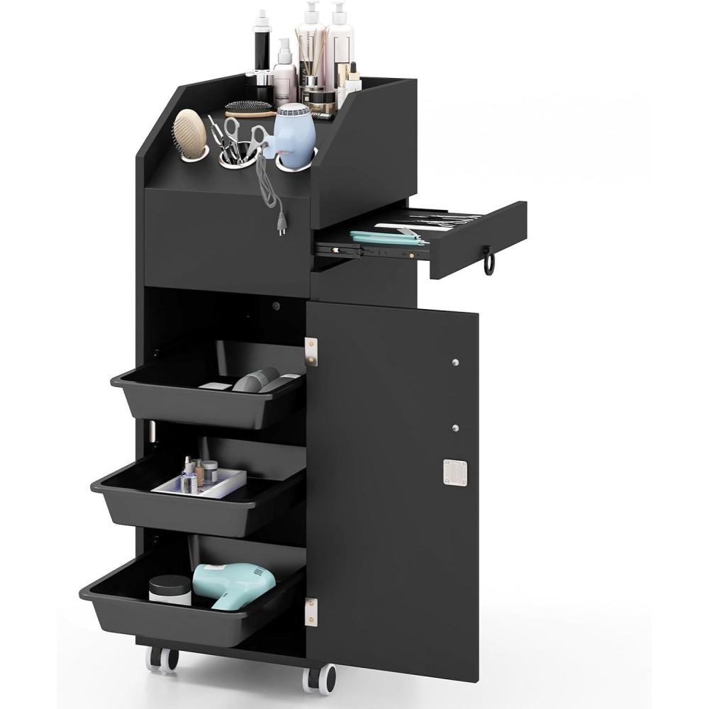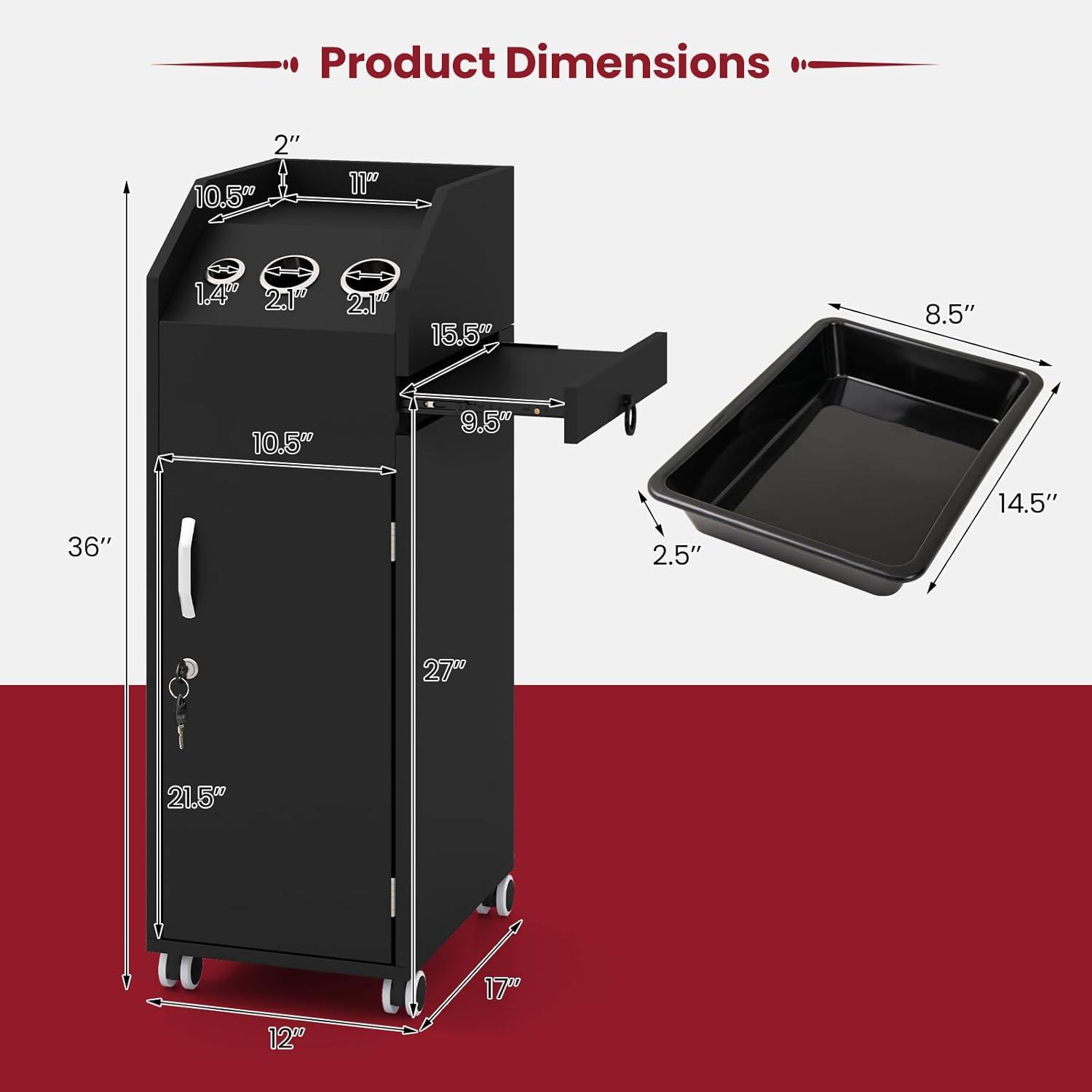 This salon trolley cart measures 12'' x 17'' x 36'' (L x W x H) and comes with several storage compartments to keep your tools within reach and well organized. It includes a lockable cabinet with 3 pull-out drawers, a space-saving side tray, 3 rings for holding hair dryers, and a flat top with protective wall. More than that, it seamlessly glides on 4 smooth rolling wheels for easy maneuverability, and they can be securely locked for stability during treatments. Ideal for various establishments like beauty salons, barber shops, spas, tattoo studios, and nail salons, this salon trolley cart is a must-have for professionals looking to streamline their workspace and provide top-notch service to their clients.