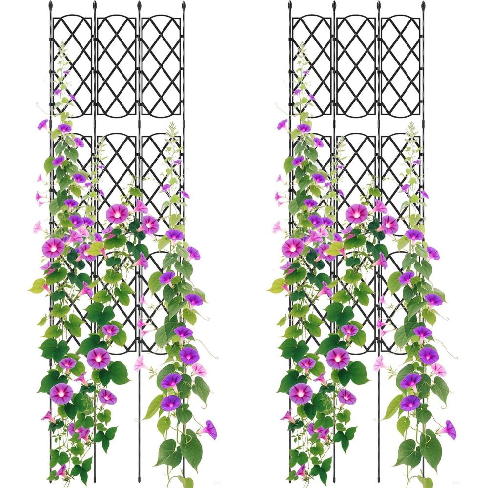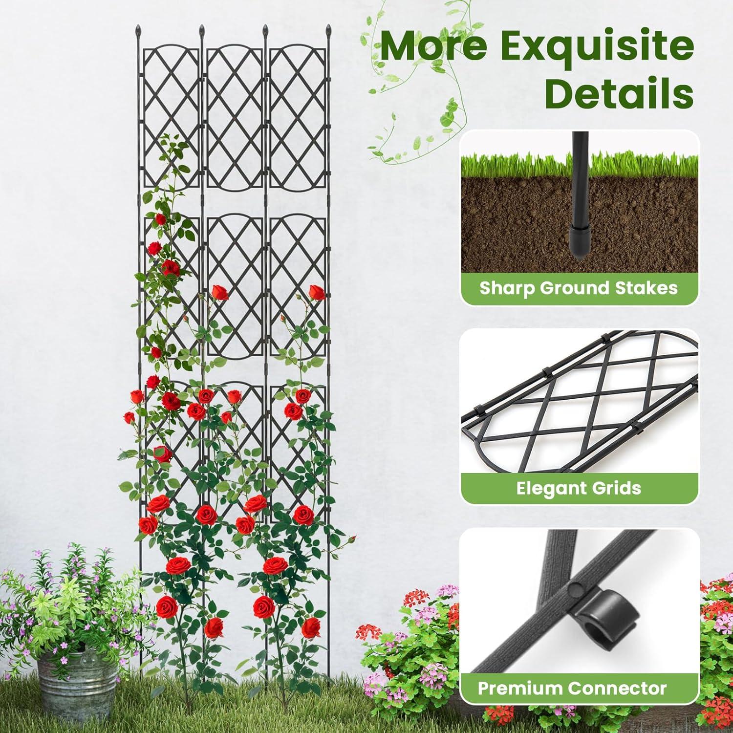 Would you like to transform your garden with a versatile trellis? Our garden trellis can be assembled in multiple ways, from separate sections to a Z-shape or a U-shaped frame, offering endless possibilities to suit your outdoor area's unique needs. Made from premium metal pipes wrapped in a PE coating, this trellis is not only rust-resistant and safe for your plants but also ensures long-term durability. Besides, with adjustable height options from 32” to 64”, it's perfect for a variety of climbing plants, including roses, morning glories, clematis, vines, and jasmine. The stable frame, featuring sharp ground stakes and premium connectors, provides a sturdy support that can also serve as a privacy screen, enhancing both the functionality and aesthetics of your outdoor space.