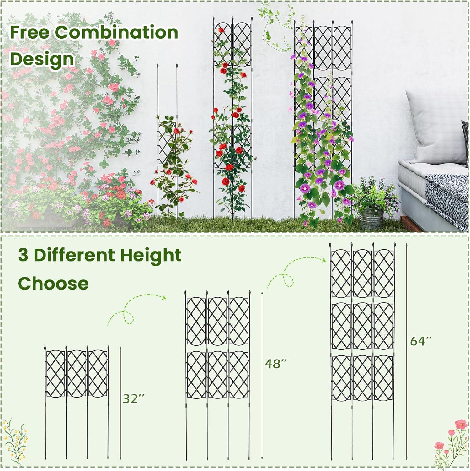 [Adjustable Height] : Catering to the diverse growth heights of climbing plants, the trellis offers adjustable height options from 32” to 48” and up to 64”. This garden trellis is perfect for roses, morning glories, clematis, vines, jasmine, and more.
