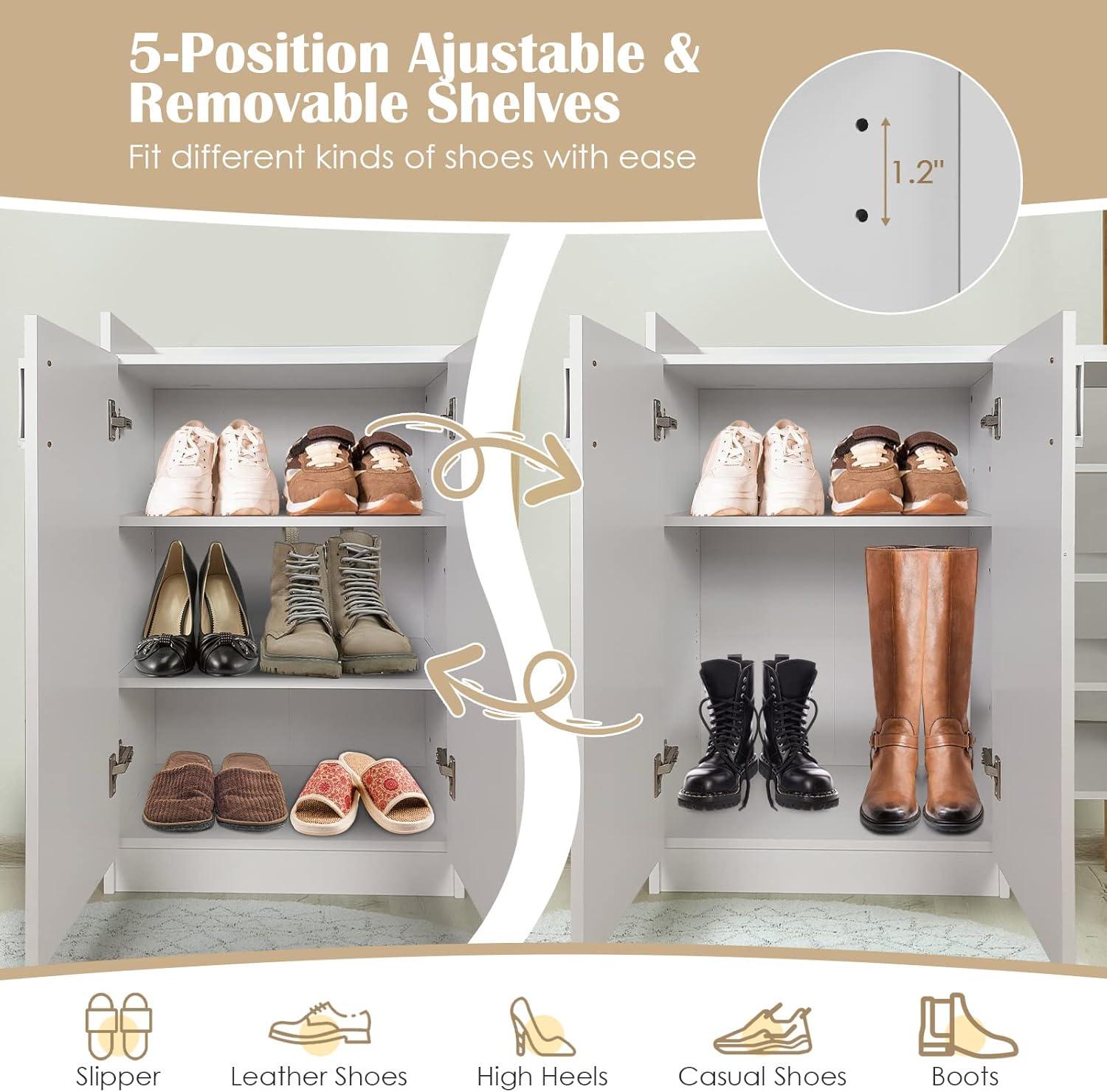 2-door cabinet and 5 open compartments keep your shoes orderly 5-position adjustable shelves meet different storage needs