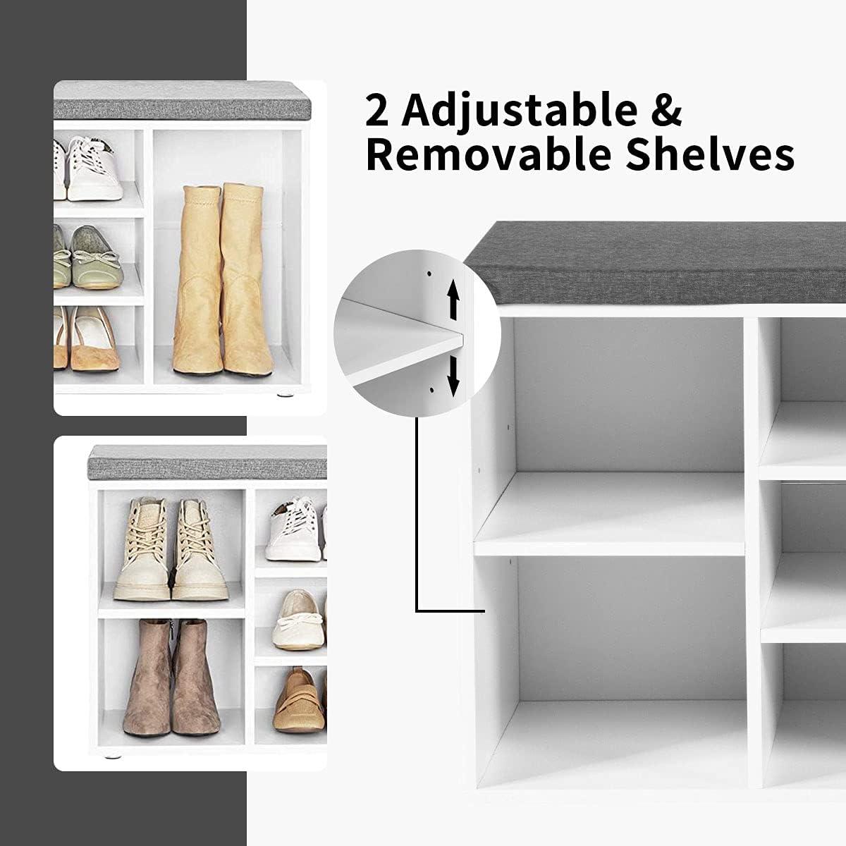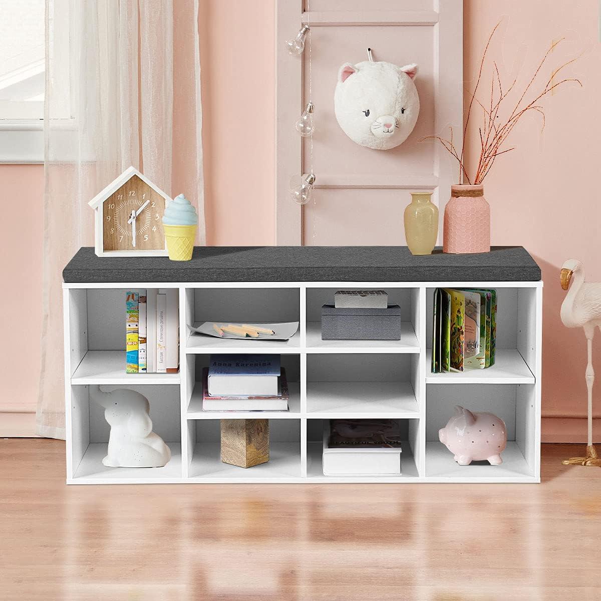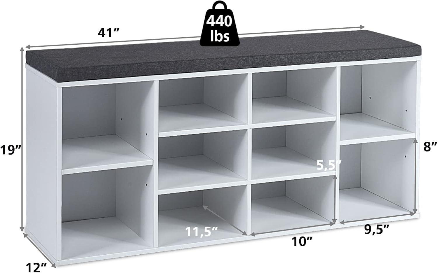 Giantex Shoe Storage Bench with Cushion, Entryway Shoe Rack Bench, Adjustable Shelves, 10-Cubbies Shoe Organizer Bench for Entryway, Living Room, Bedroom, Hallway, Closet, Mudroom (Grey)(White)