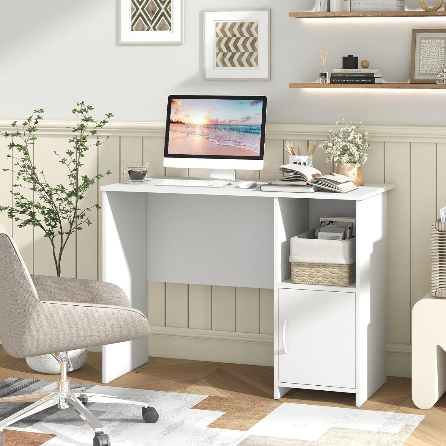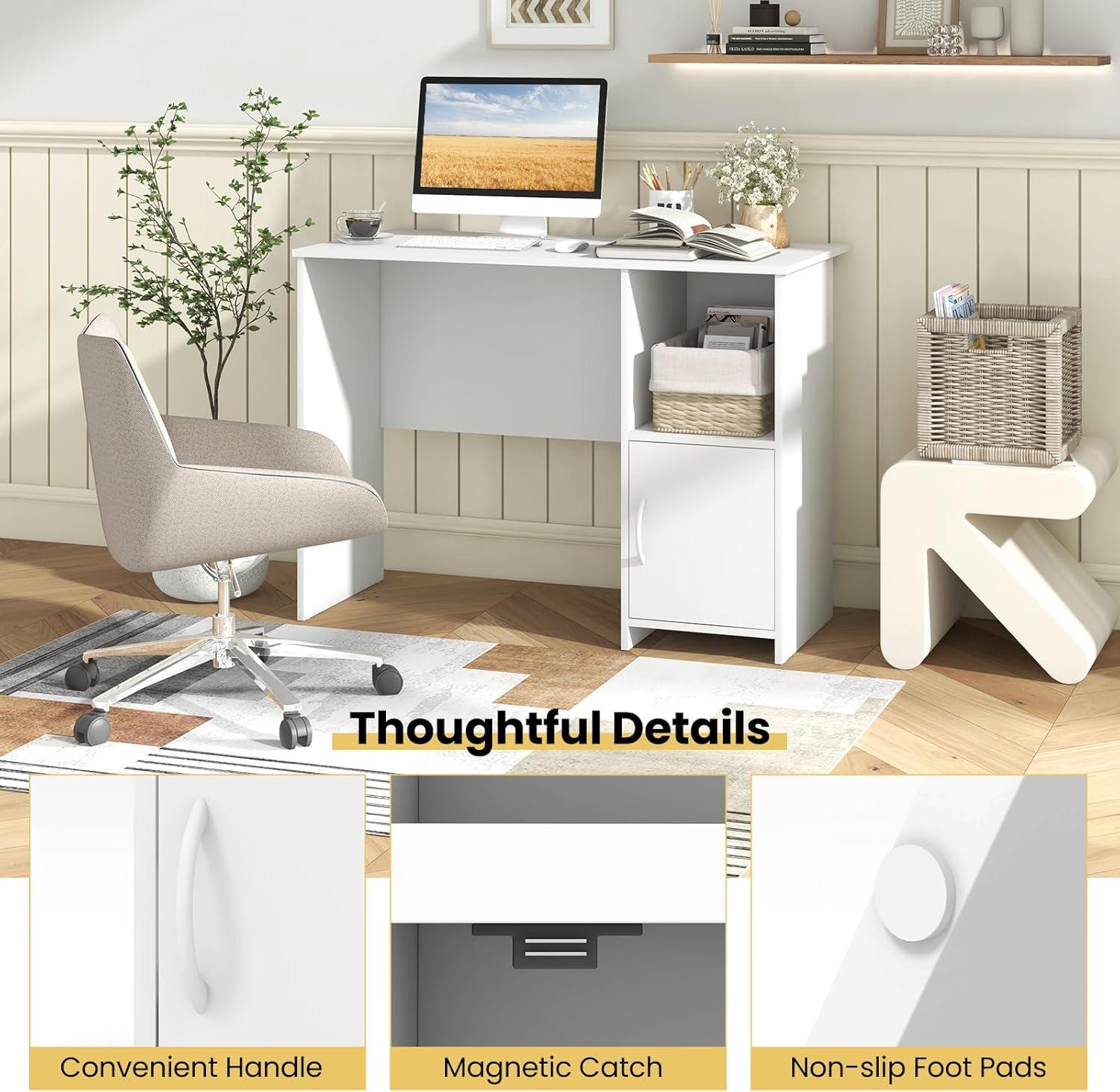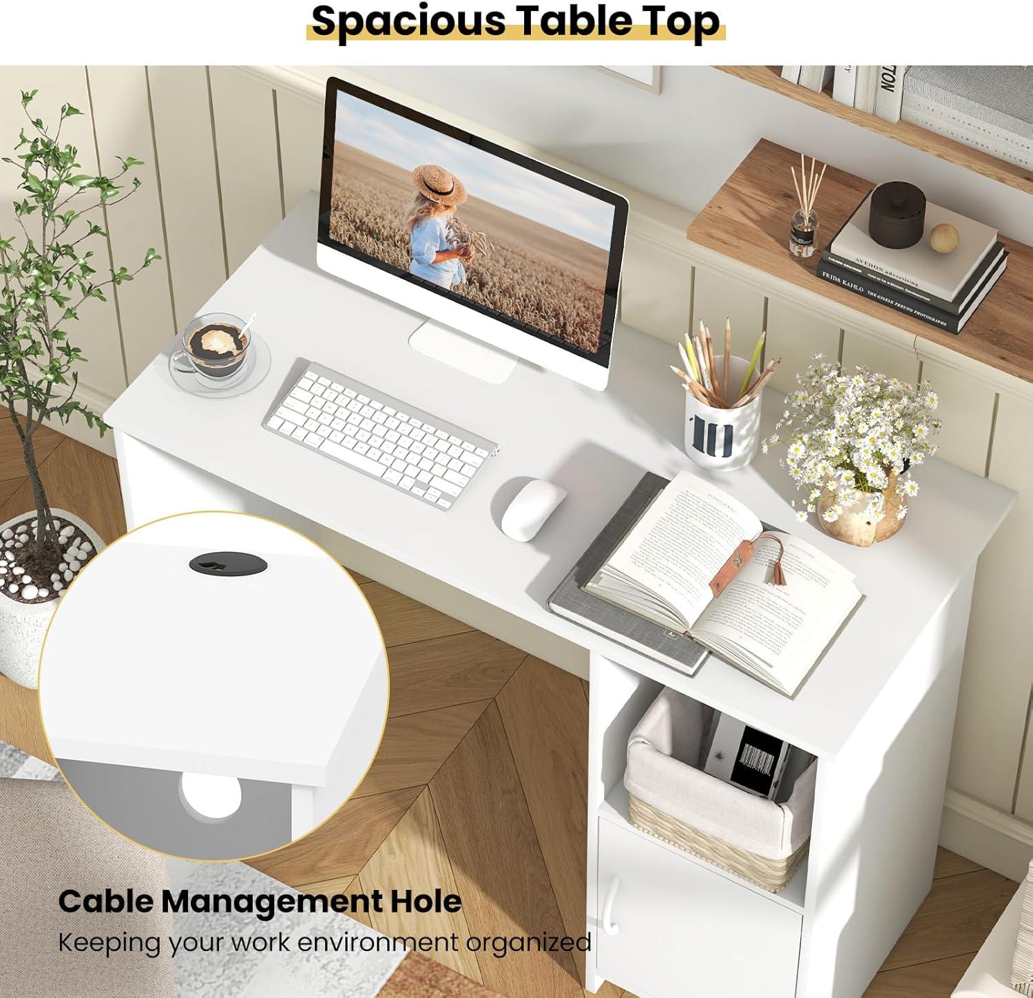 Elevate your workspace with our multifunctional PC desk designed for both efficiency and style. The spacious tabletop ensures a clutter-free environment. With extra storage space including an open shelf and a cabinet, this desk promotes a neat and organized workspace, keeping computers, documents, and other items in order. The cable management holes eliminate messy wires, providing quick access to power outlets. Crafted with thickened boards and solid connections, this desk ensures long-term usability. Non-slip foot pads prevent scratches, while the magnetic catch and convenient handle make accessing interior items effortless. Embrace the modern design that complements various home styles, making it a versatile piece suitable as a computer desk, writing desk, study desk, or makeup table, adding elegance to any room effortlessly.