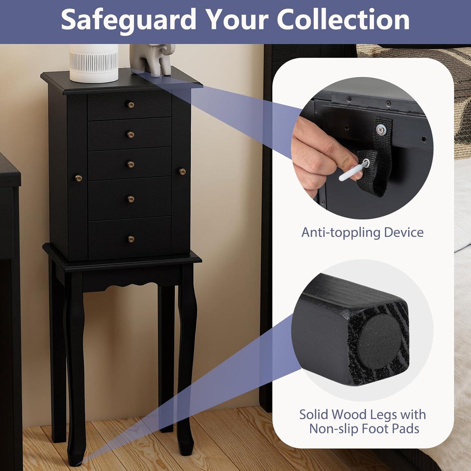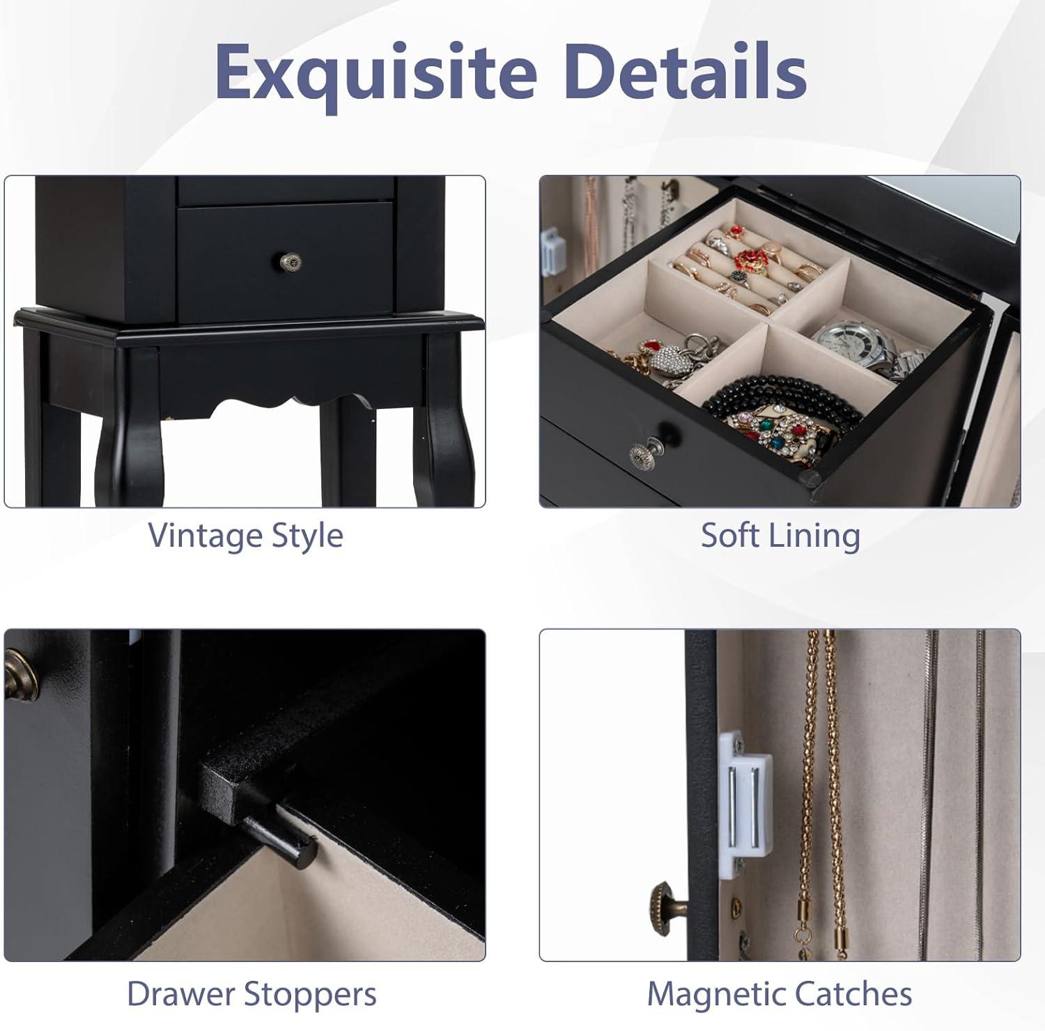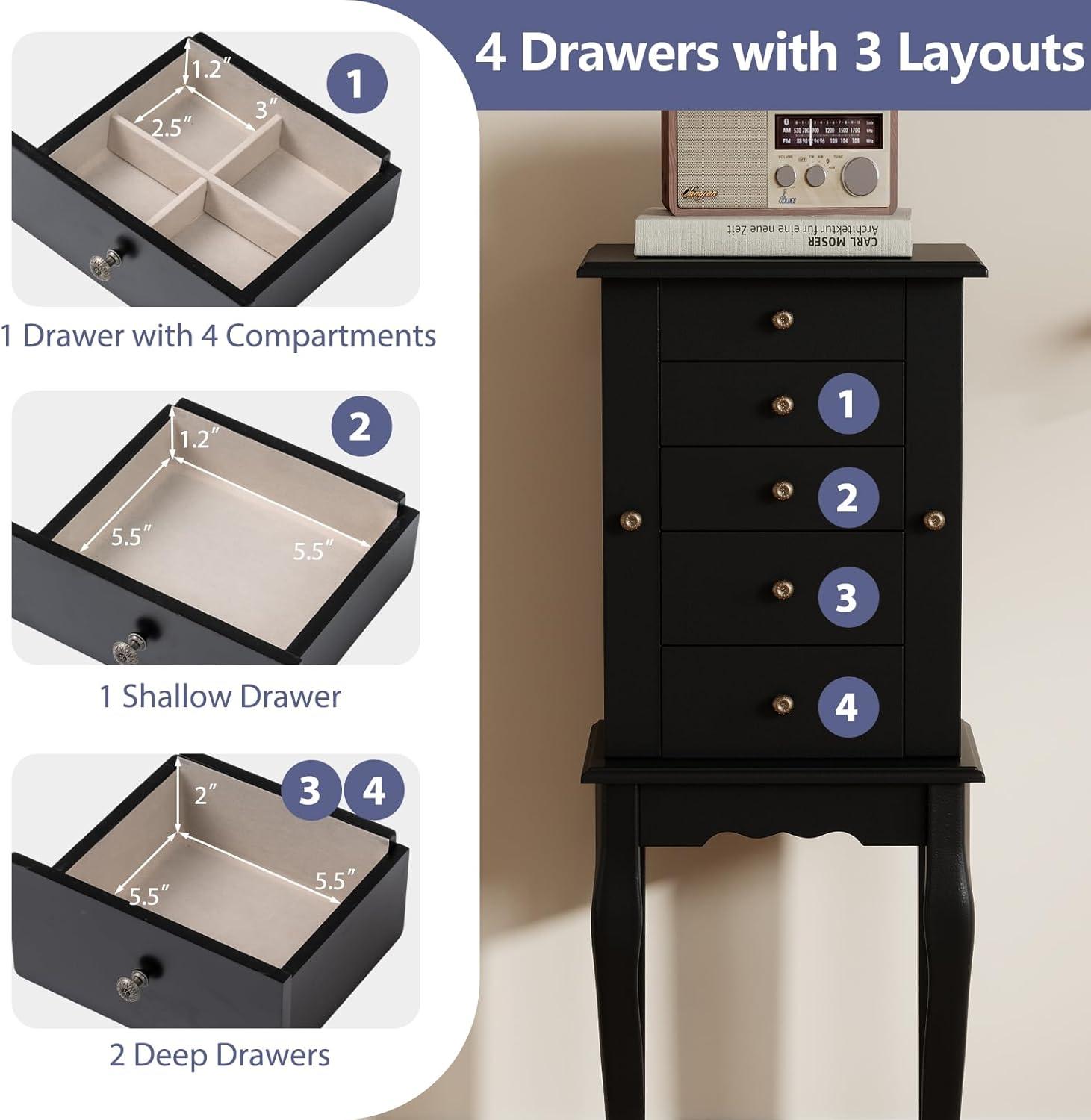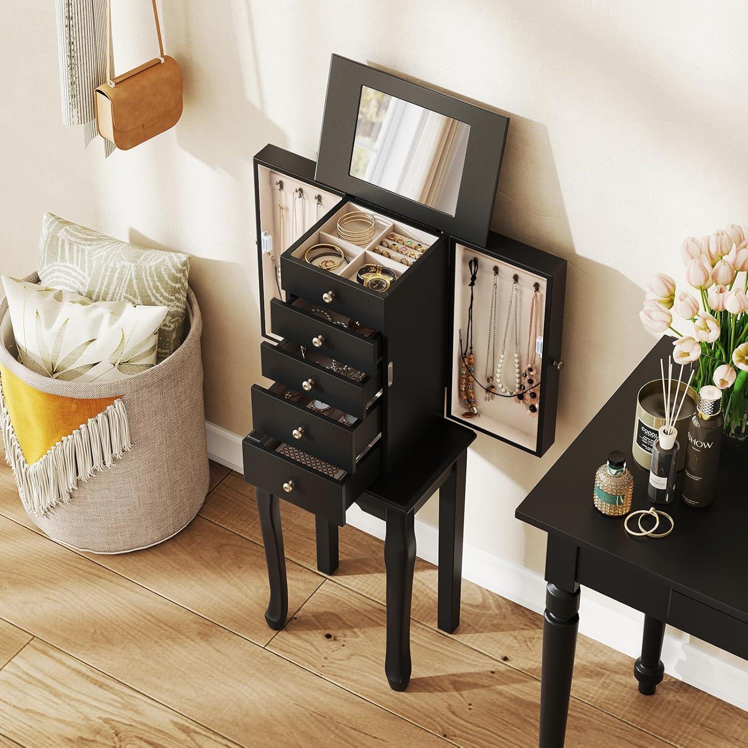 Giantex Jewelry Cabinet with 4 Drawers, Jewelry Armoire with Flip up Mirror, Top Storage Tray with Ring Slots, Side Doors with Necklace Hooks, Standing Jewelry Organizer Chest, Black