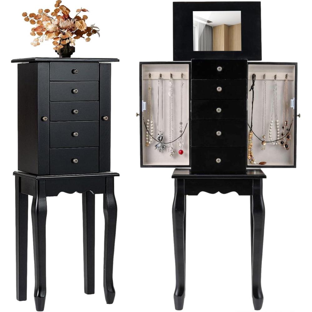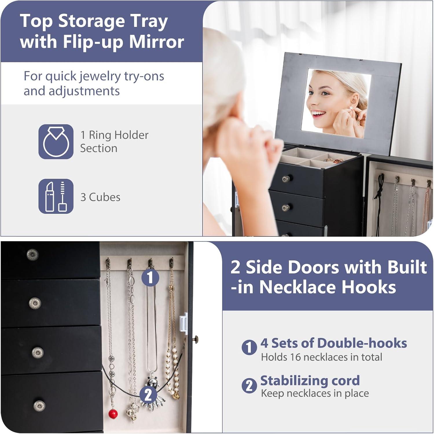 Giantex Standing Jewelry Armoire Cabinet with 4 Drawers, Flip Top Mirror, Top Storage Compartments, 2 Side Doors with 8 Necklace Hooks, Freestanding Jewelry Organizer Box Chest (Black)(Black)
