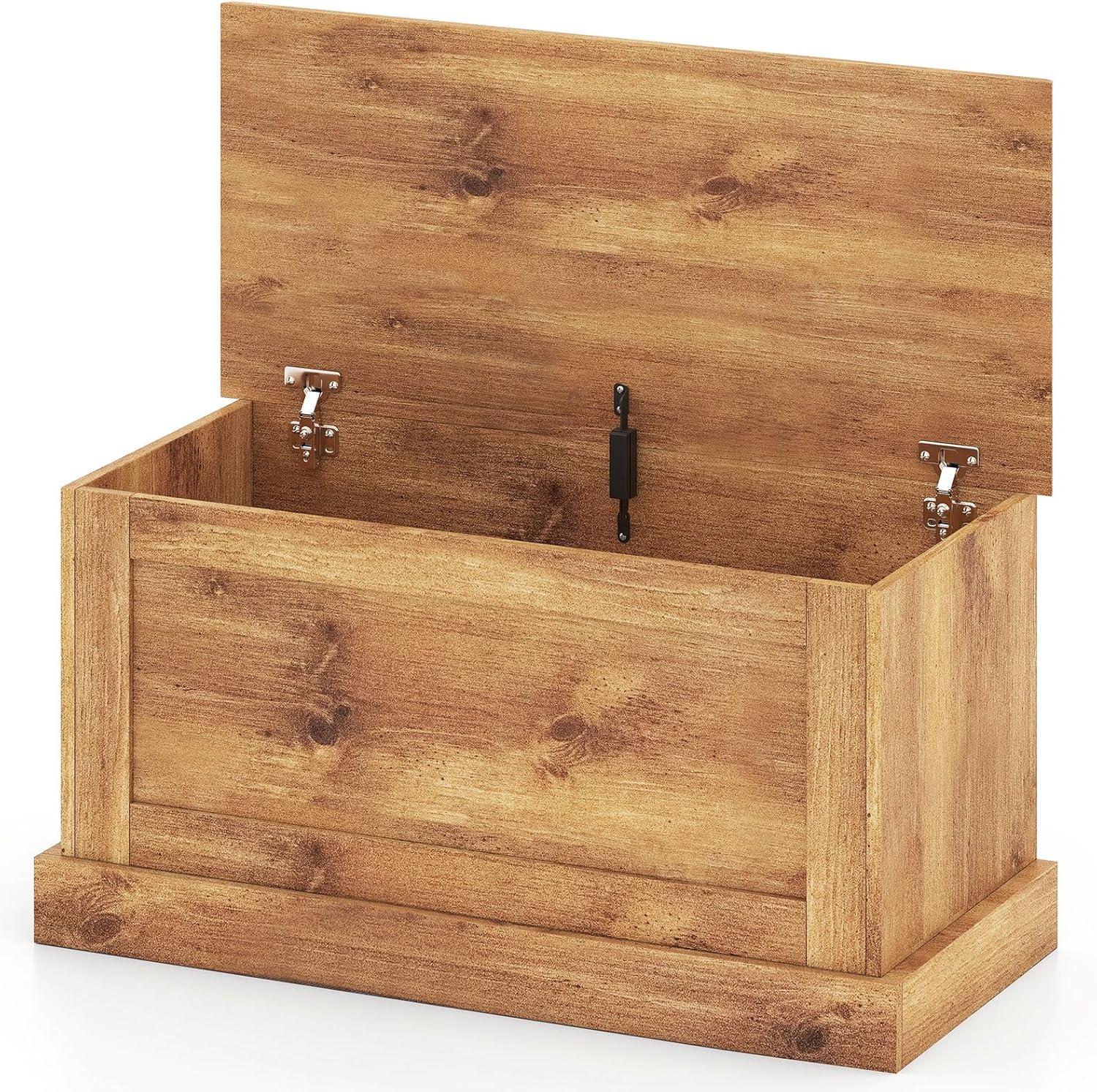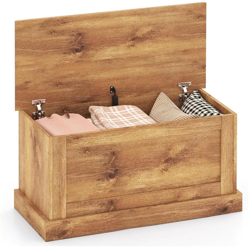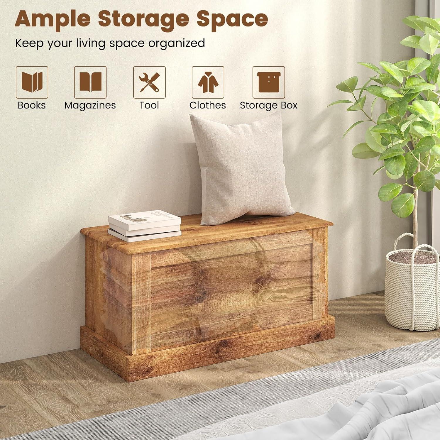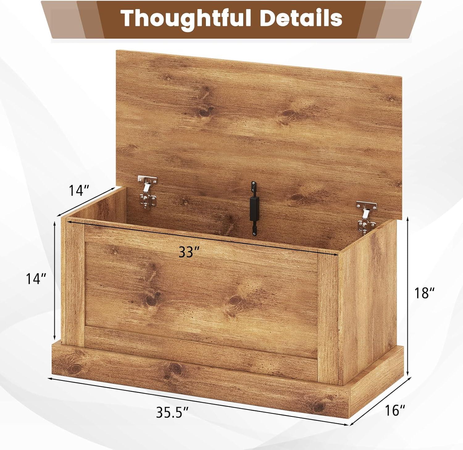This large storage bench is the ultimate solution to keep your living space organized and clutter-free. With ample storage space measuring 35.5” x 16” x 18”, it offers enough room to store your books, magazines, tools, clothes, or any other items you need to organize. The secure design ensures safety with a reliable metal hinge that firmly locks the lid, preventing accidental finger pinching. Unlike others that made of 0.4” thin panels, ours is made with 0.6” thickened boards for a durable construction. The easy to clean surface with elegant wood grain makes maintaining a breeze. With its multifunctional design and thoughtful details, you can use it as tool storage in the garage, a closet addition in the bedroom, or a storage organizer in the living room.