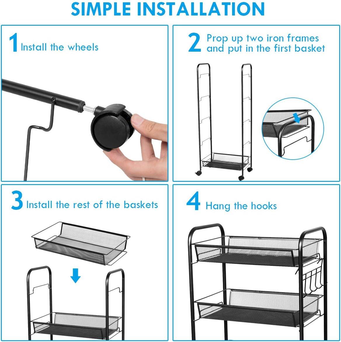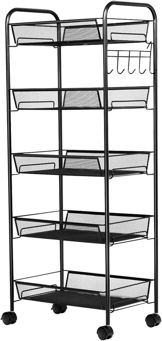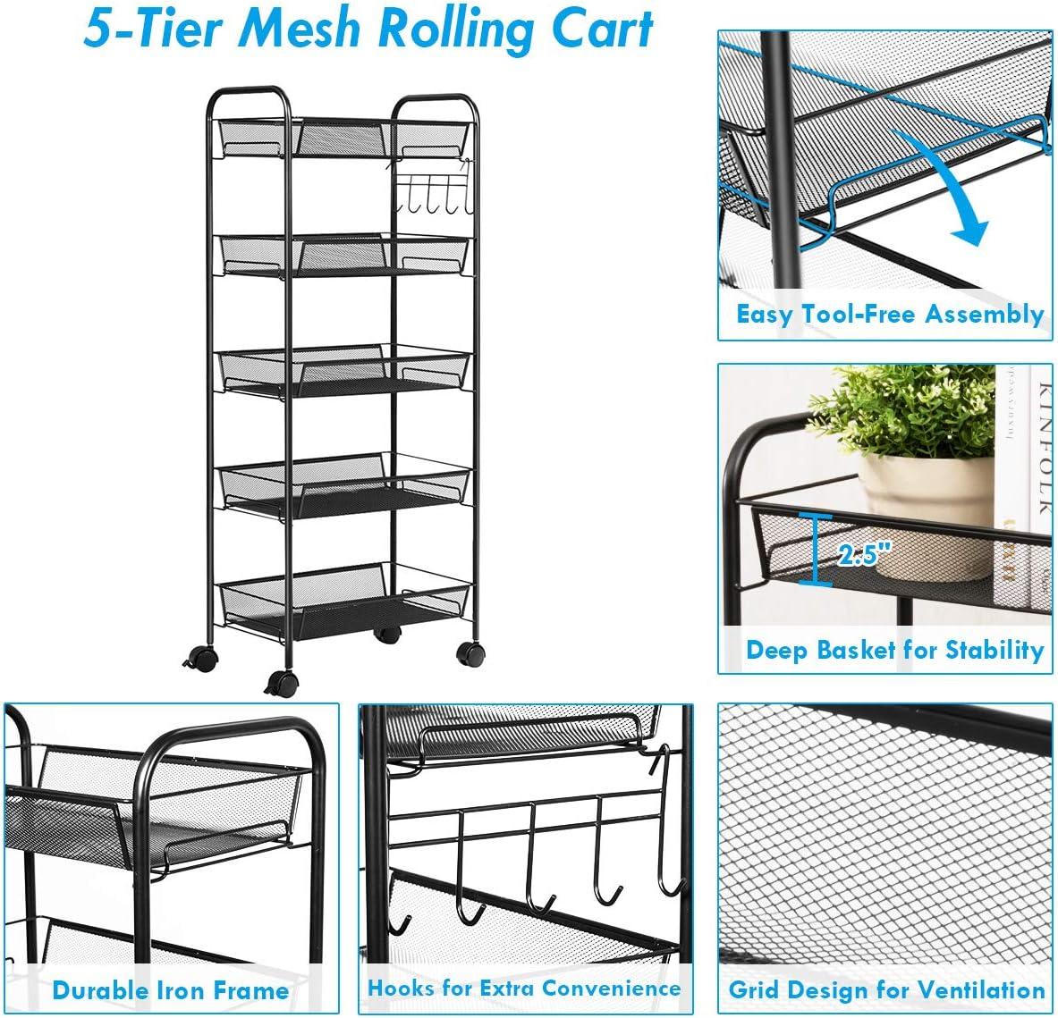 Giantex Storage Rack Trolley Cart Home Kitchen Organizer Utility Baskets with 5 Hooks (5 Tier, Black)(Black)