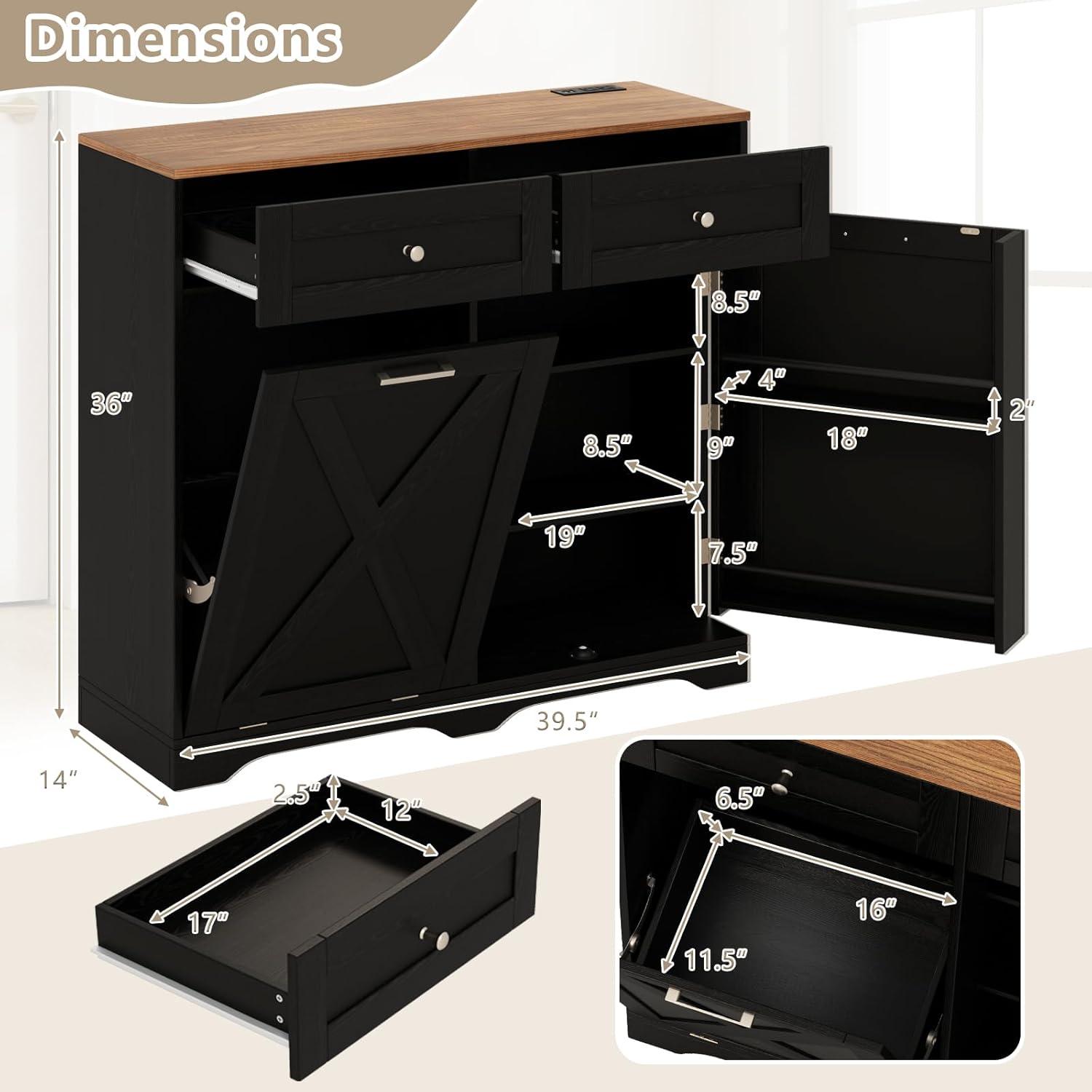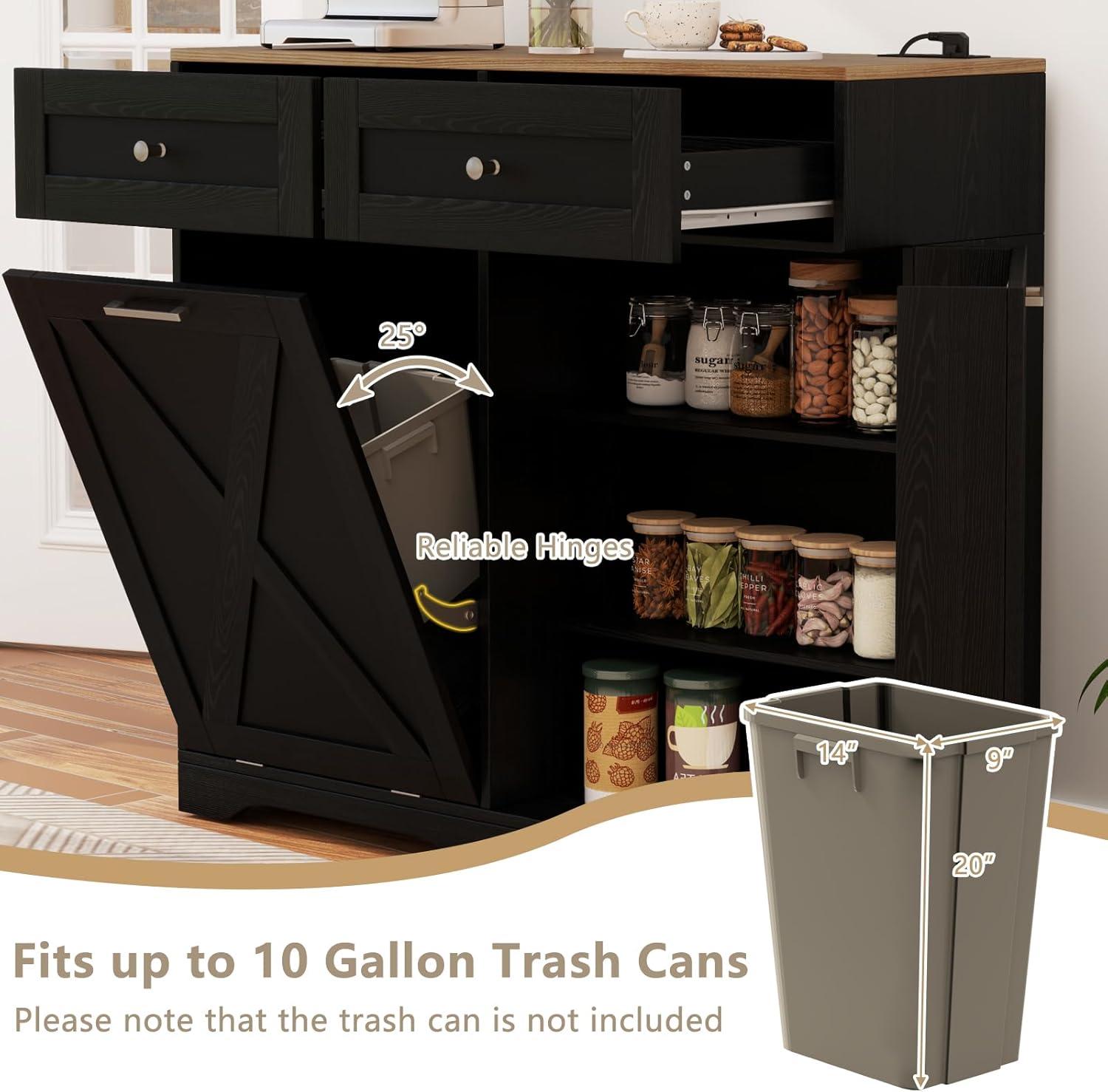 Giantex Tilt Out Trash Can Cabinet 10 Gallon, Kitchen Island with Power Outlet, 2 Drawers, Adjustable Shelves, Hidden Storage Garbage Bin Cabinet for Laundry Room Dining Room (Grey+Walnut)(Black+walnut)