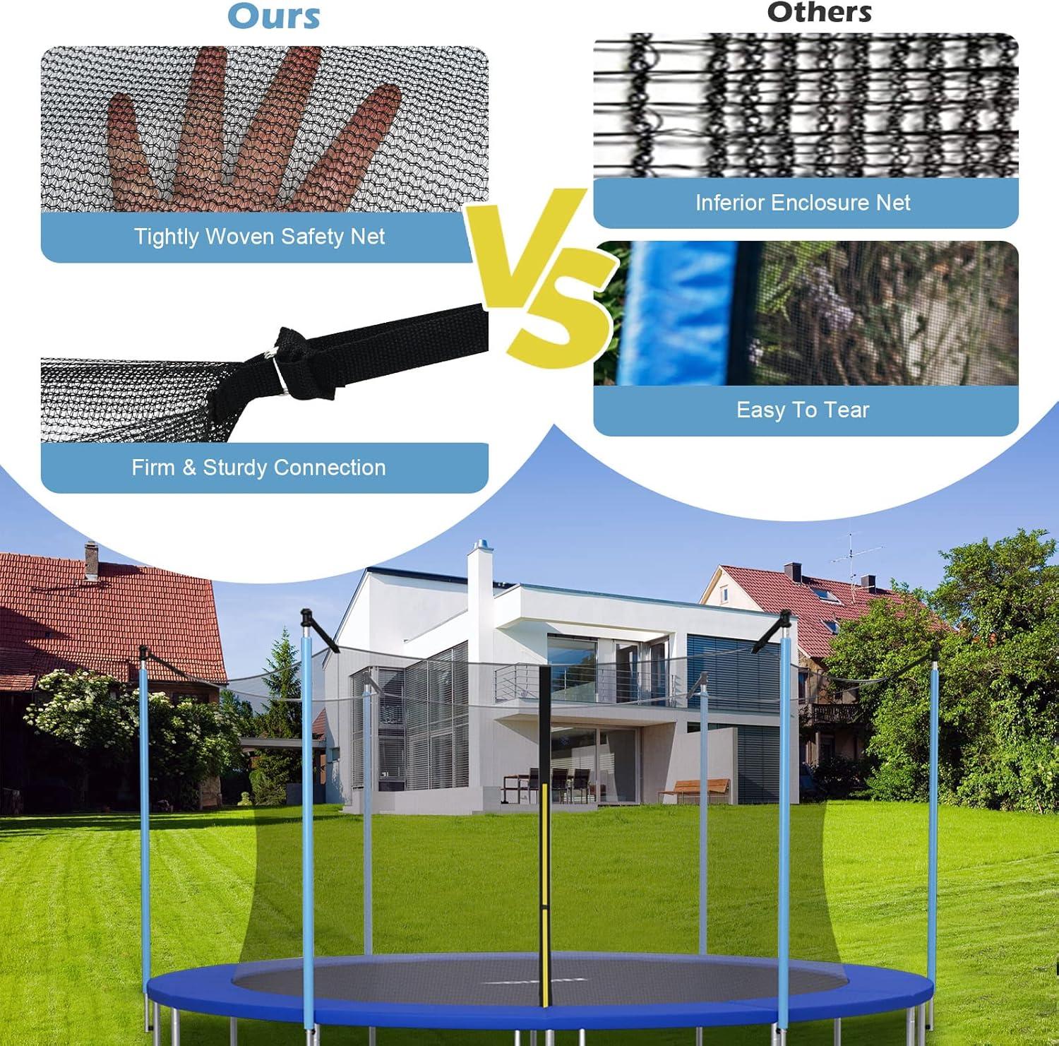 [ Premium Material & Exquisite Craftsmanship ]: This trampoline safety enclosure net is carefully woven by toughened and sturdy PE material, which ensures high weather resistance and lasting durability for long-term use. Also, the closely connected stitching enhance the net performance in tear resistance.