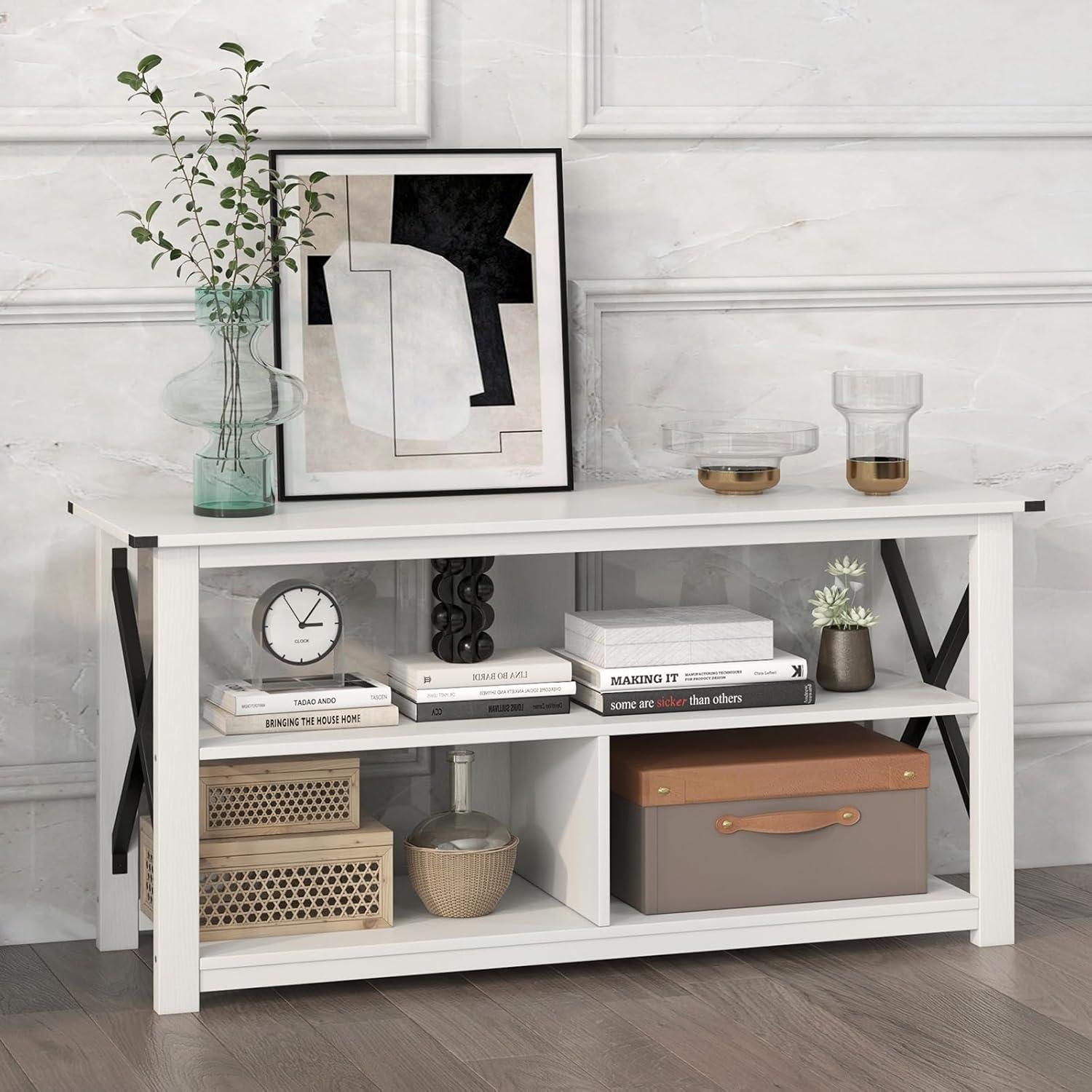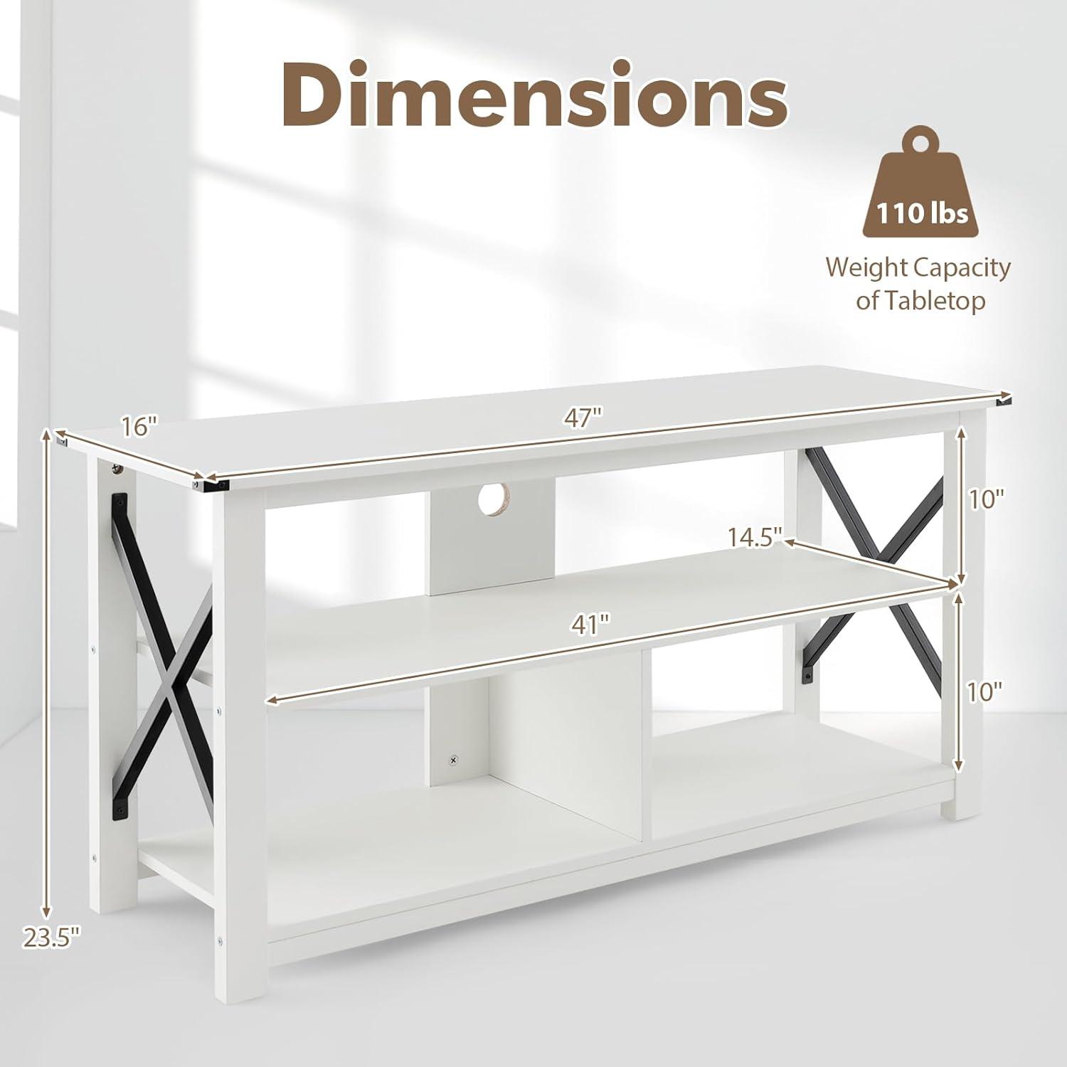 【Stable X-shaped Frame Design】: Enhanced with an X-shaped metal frame on both sides, this TV stand offers exceptional stability and support. The back panel and non-slip foot pads ensure it can easily bear the weight of larger TVs and other equipment without wobbling.