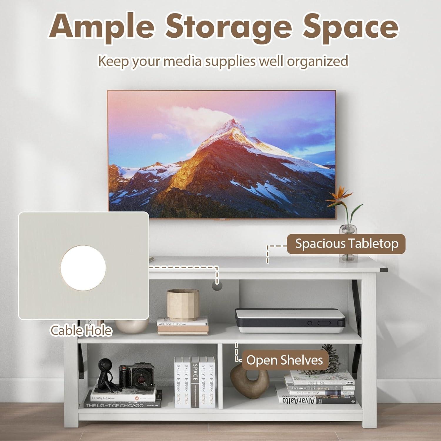 【Convenient Storage and Cable Management】: The open shelves of the TV cabinet provide easy access to media components like gaming consoles and DVD players, with a cable hole for efficient cord management, keeping your entertainment setup neat and organized.