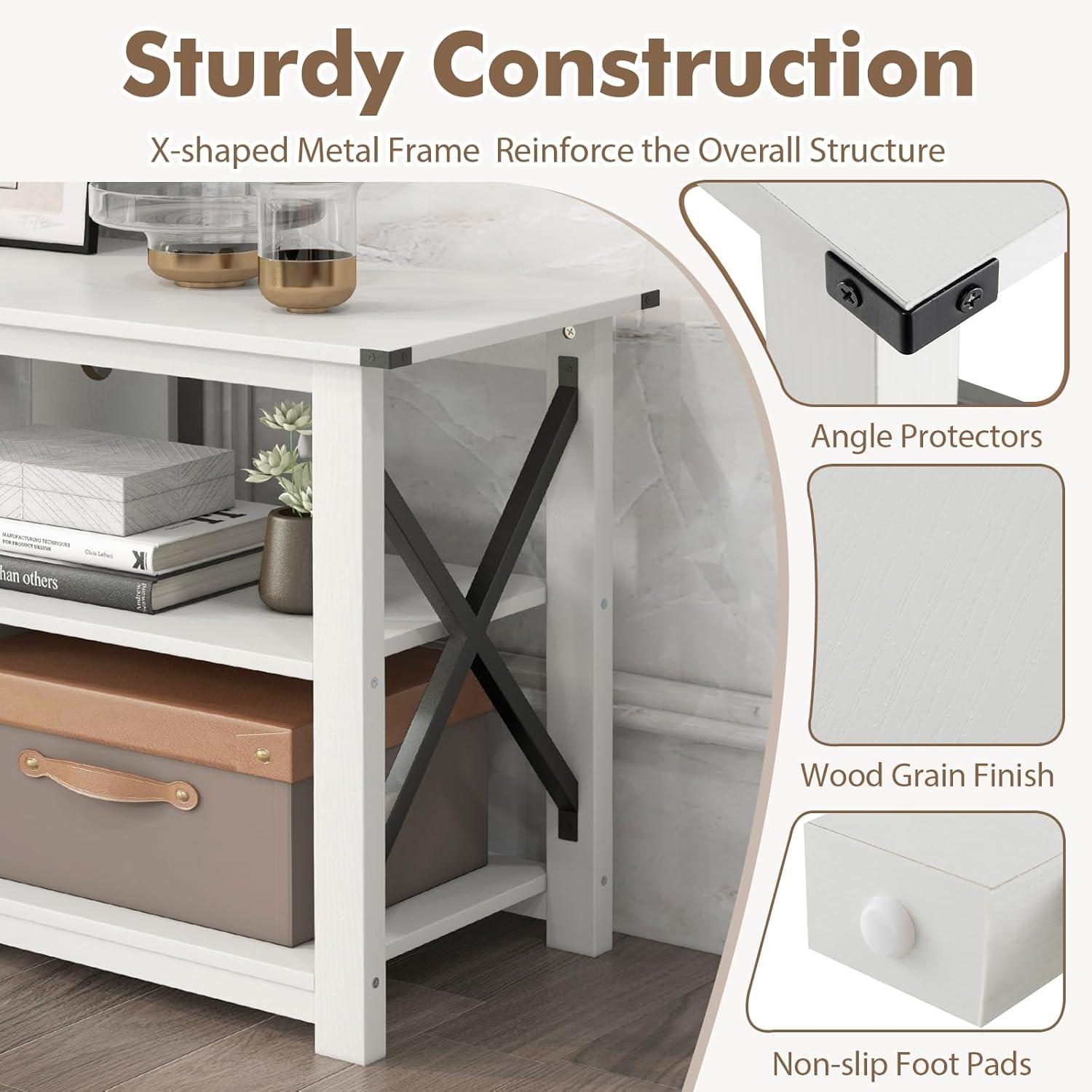 【Elegant Design with Rustic Touch】: The sleek TV console table, featuring a wood grain finish and metal corner protectors, exudes a charming rustic elegance that enhances the overall aesthetic of your home, adding a cozy and inviting vibe to the room.