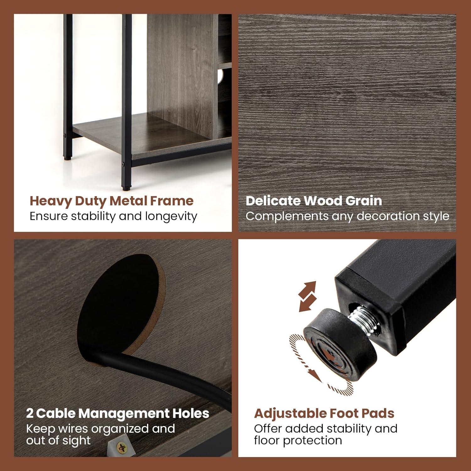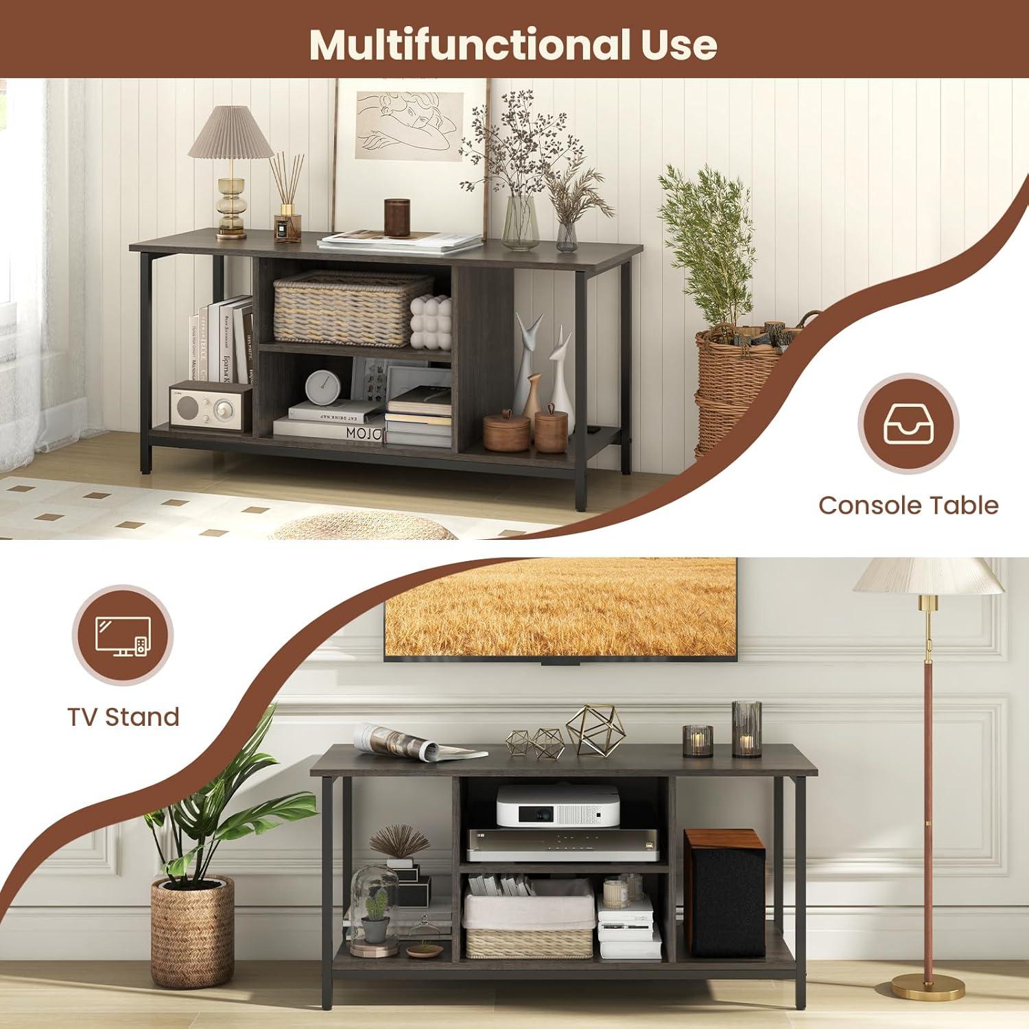 This console table boasts open storage and a 3-level adjustable shelf, offering ample room for media components, gaming consoles, and other essentials. The entertainment center is equipped with a built-in charging station featuring USB and Type C ports, ensuring your devices stay powered at all times. Additionally, 2 cable management holes are included to keep wires organized and out of sight.