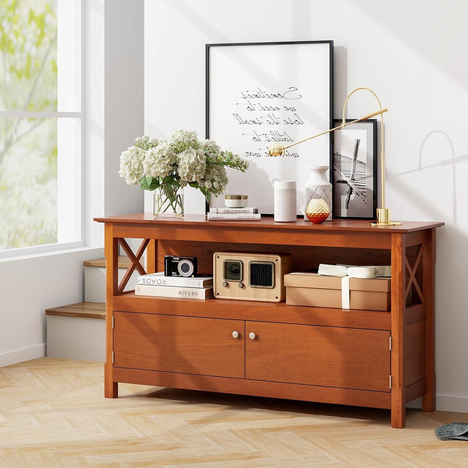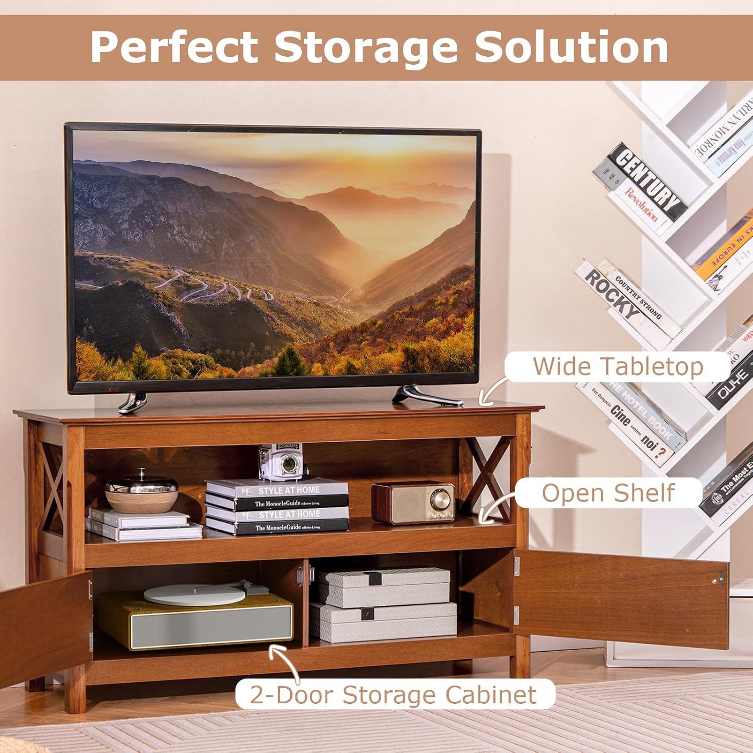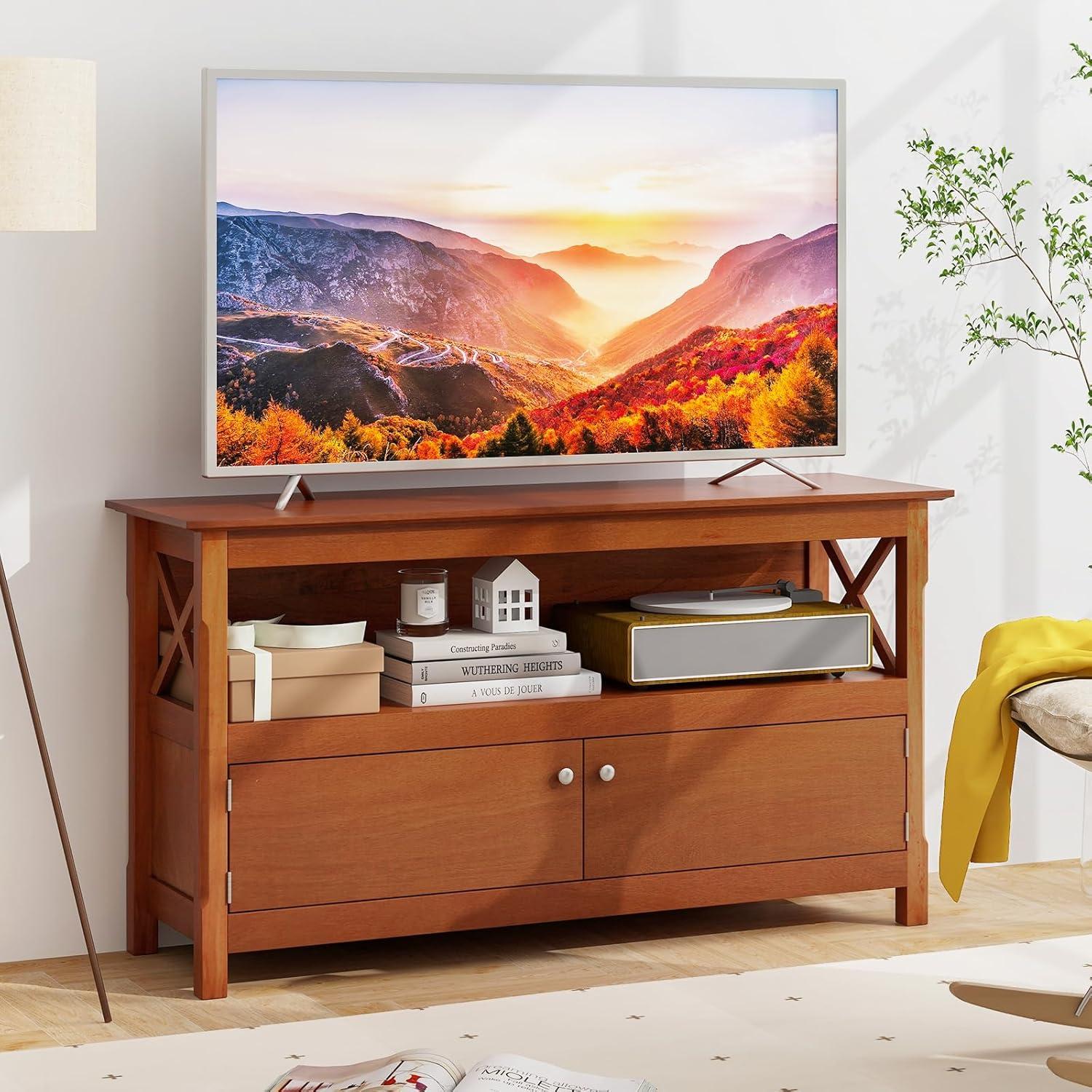 Giantex TV Stand with Power Outlet for TVs up to 50 Inch, Entertainment Center with 2-Door Cabinet, Storage Shelf, 2 Cable Holes, Modern Media Console Table for Living Room, Bedroom, TV Cabinet, White(Brown)