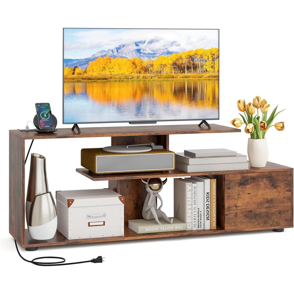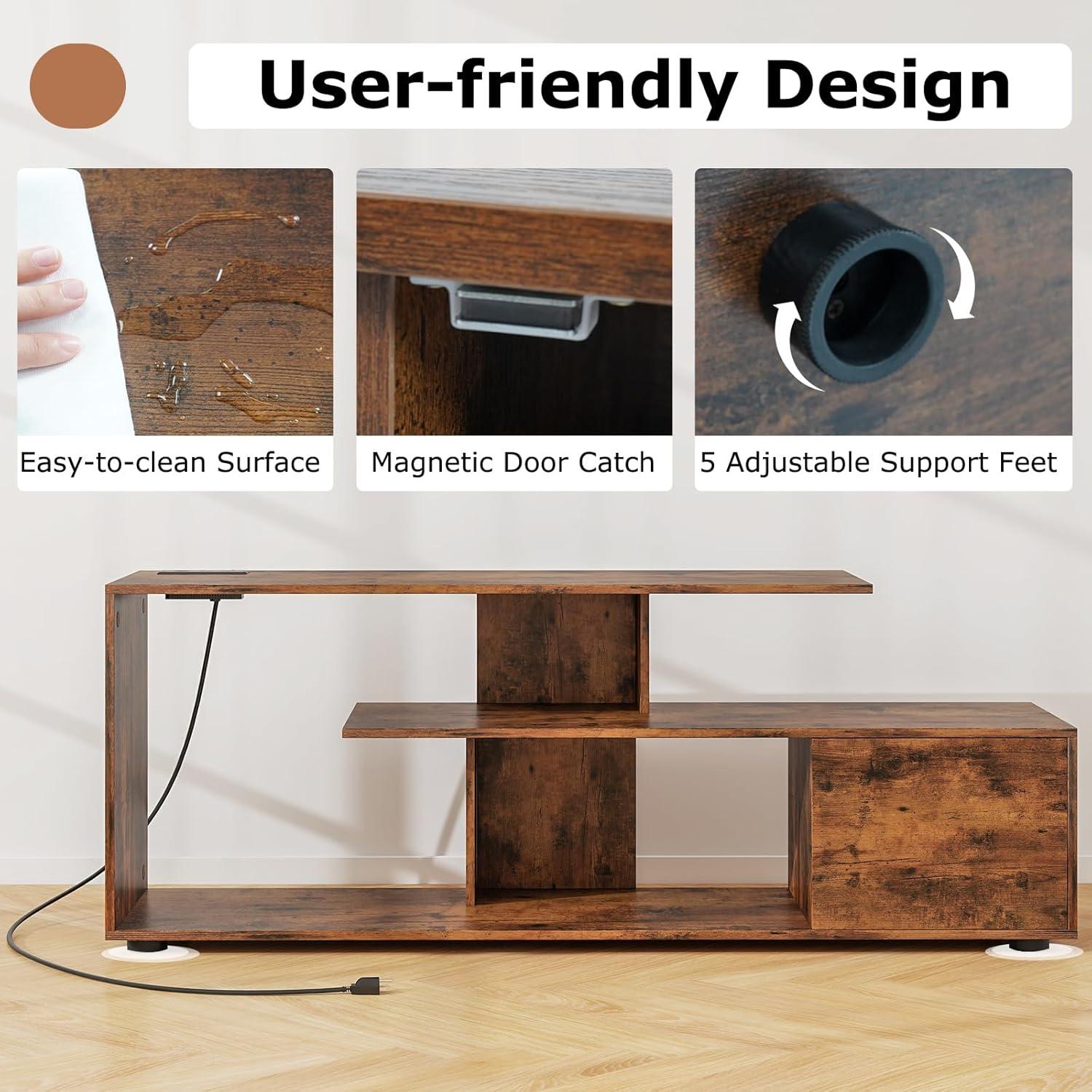Upgrade your home entertainment setup with our sleek and modern 60-inch TV stand cabinet. Say goodbye to tangled wires with the built-in power strip featuring USB and Type-C ports, ensuring your devices stay charged and organized. The spacious 47” tabletop perfectly accommodates up to 55” TVs, ensuring every movie night is a hit. Crafted for durability and stability, this media console cabinet comes with adjustable feet for a secure fit on any surface. Embrace the asymmetrical design that adds a stylish touch to your room while keeping everything organized. Click to elevate your home theater experience now!